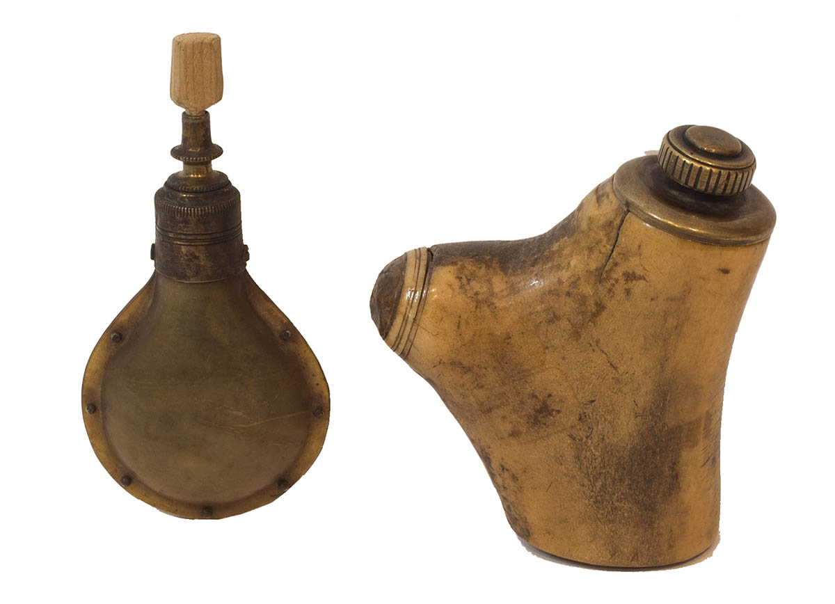 Lot 229: Powder Horns, Measures, Flasks, Salts