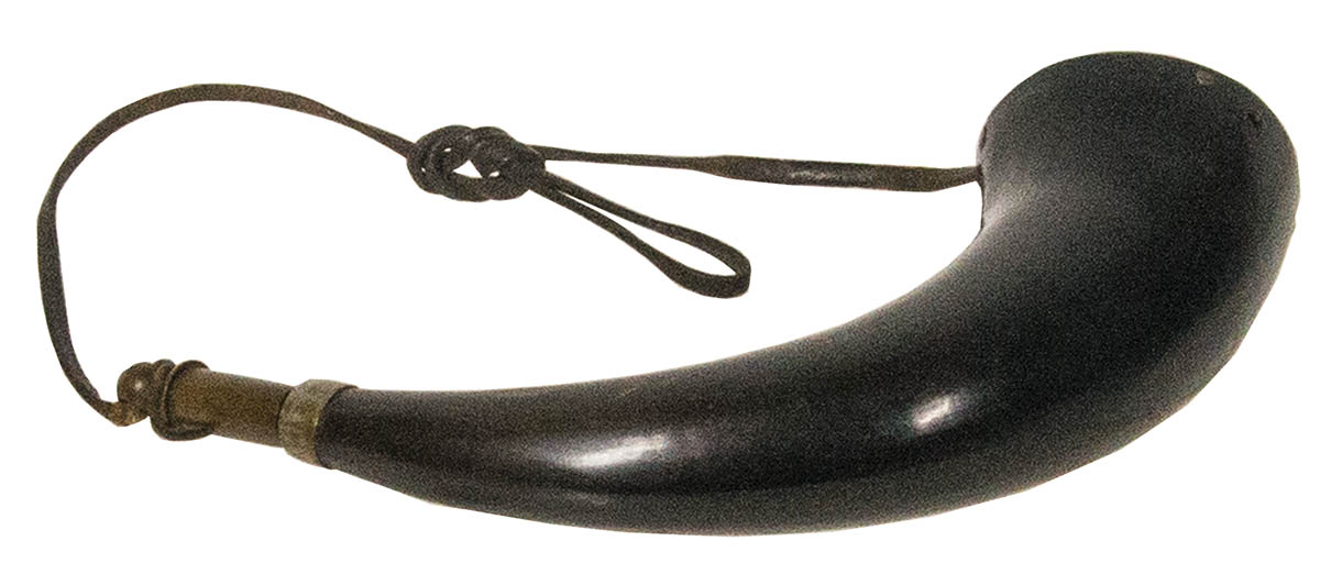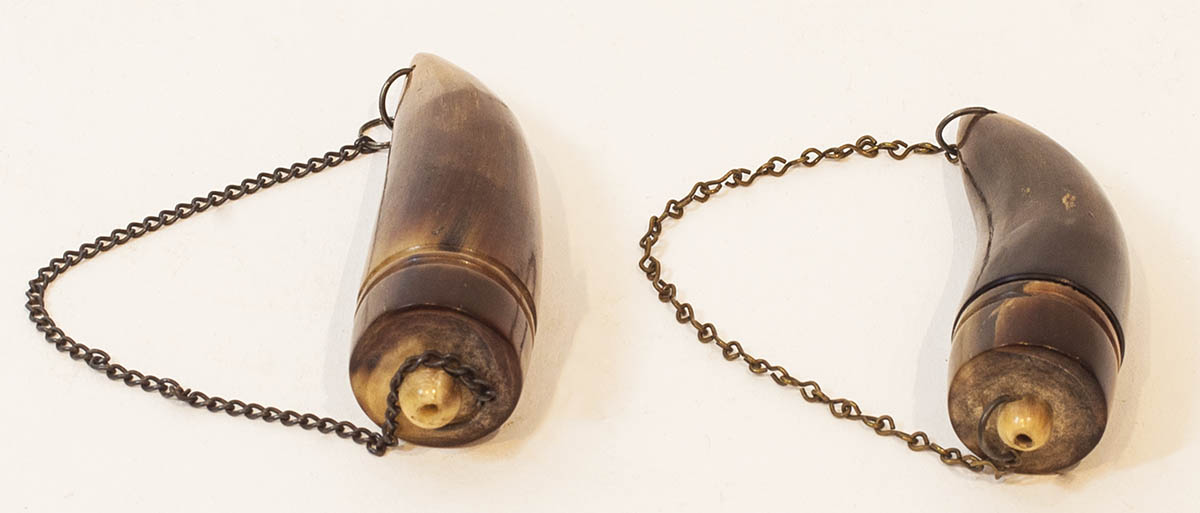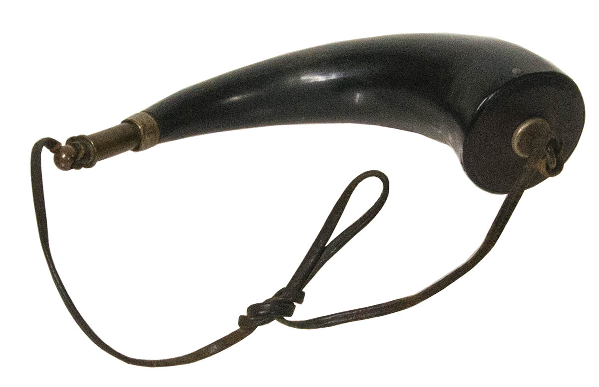 Black powder priming horn, with etched and carved designs, a glass base plug, missing small end plug, 2 3/4″ l; Black powder measure, with old minor damage, 3″ l; Antler tip powder measure, 3 1/2″ l; Salt horns, both have threaded tops and small chains, these small horns have been used by soldiers since the Revolutionary War through the Civil War, similar examples illustrated in Warren Moore’s book Weapons of the American Revolution and Accoutrements, New York, NY, 1967, p. 217, 3″ and 3 1/2″ l; Buffalo powder horn, brass capped silver end, with three hallmarks, and stamped initials “C.P.F.” in the silver band, 8″ l; Early antler powder horn/flask, with a threaded brass cap and minor wear, 3 1/2″ l; Early riveted powder flask, with a brass top and a screw-on tip, a replacement wooden plug and wear, 3 1/2″ l.