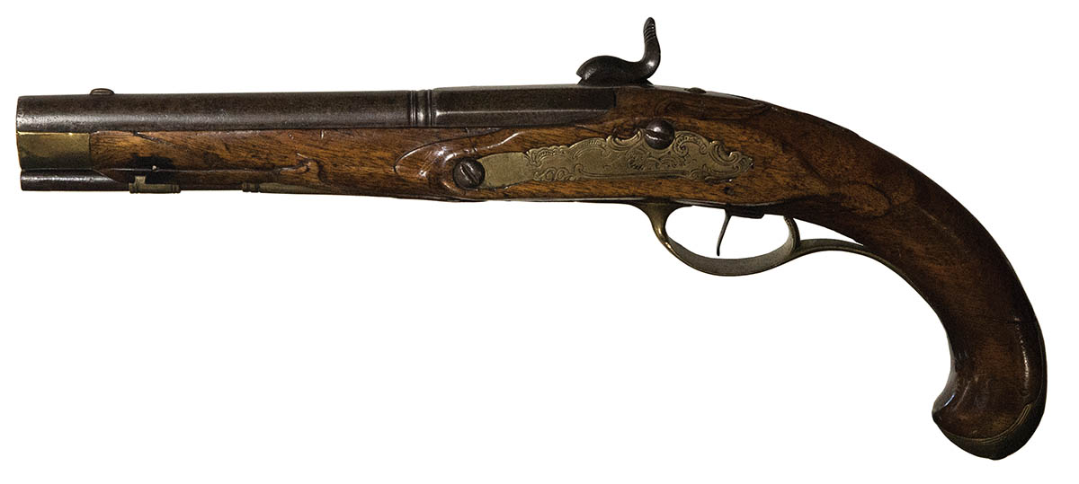 Octagon to round barrel, an unmarked lock plate, wooden stock carving, engraved brass side plate, trigger guard and butt cap, crack in grip and wear, converted from flintlock rifled barrel, 13″ l.