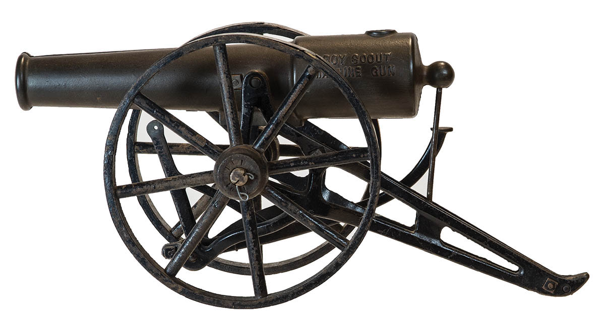 Wood wheels painted black, marked “Boy Scouts Machine Gun”, 13″ l, 16″ overall l, 5 1/2″ w.
