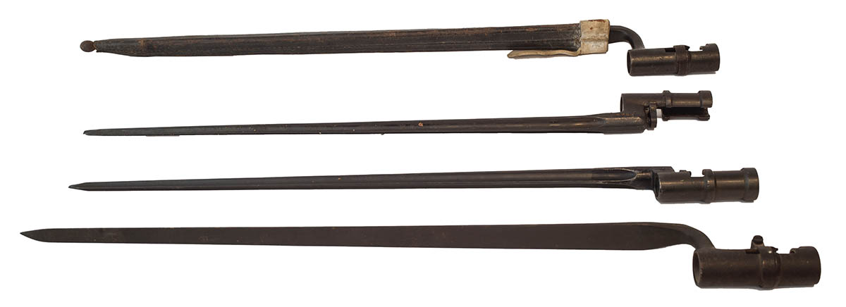 Two “US S” bayonets, one includes a sheath stamped “2482, 1884″, both 21” l; Two “Model 1891/30 Russian” bayonets, one is stamped “45258, box with X in it”, the other “8263”, both have cruciform blades and screwdriver tips.