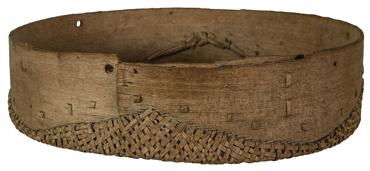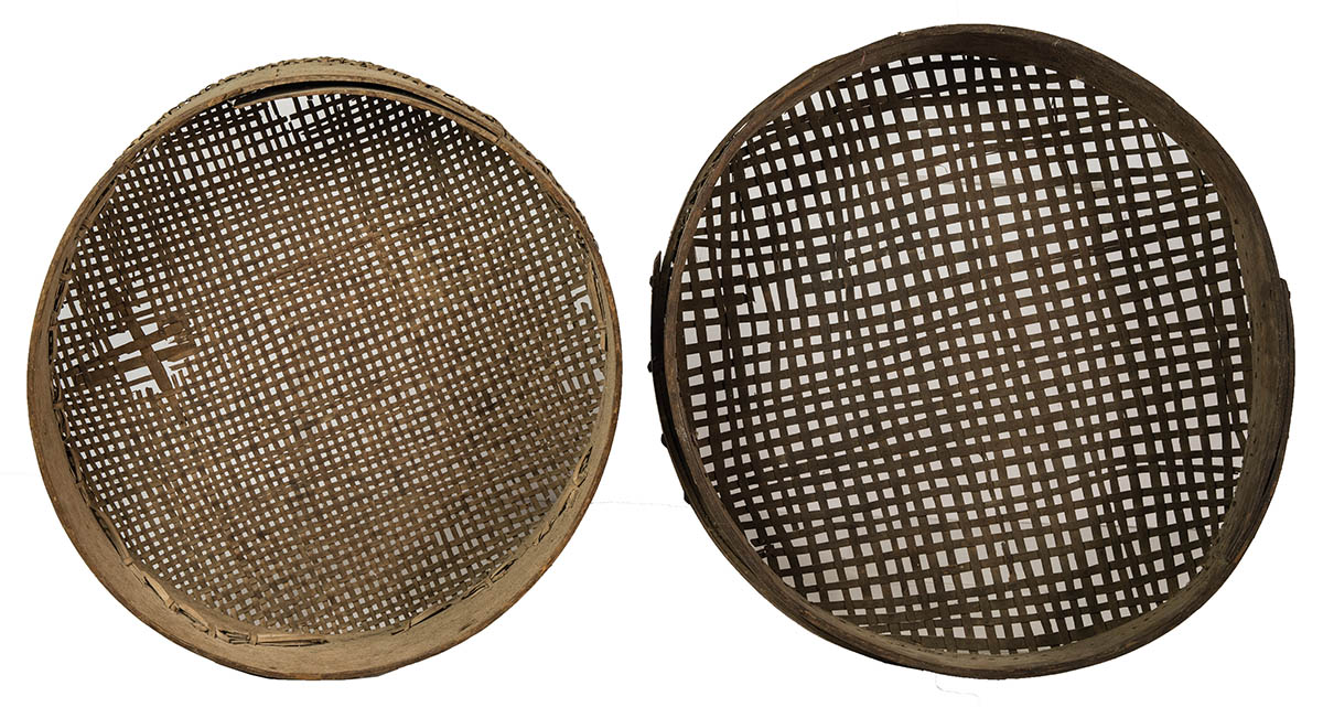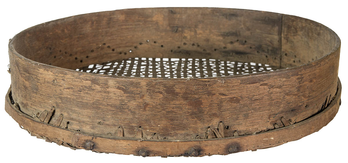 New England, both with woven splint sifters, larger sieve lap secured with rosehead nails, 4″ h, 18 1/2″ dia; Smaller sieve secured with sewn-through splint hickory, (shows some breaks), 4″ h.