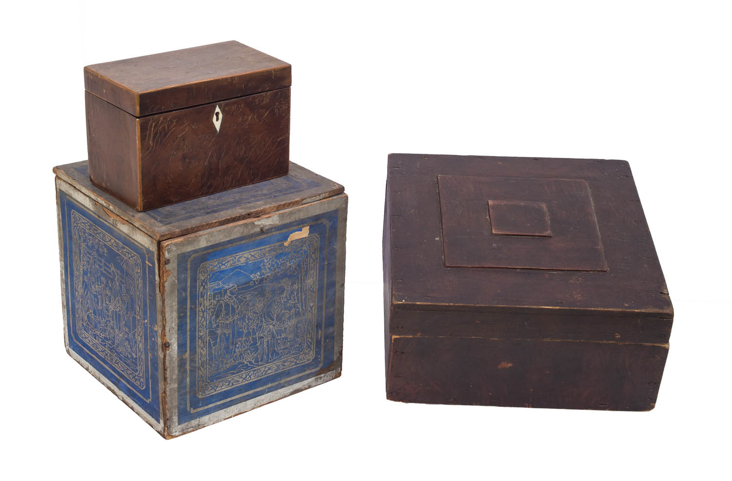 Tea box with original paper label, “Finest Oolong, Price $1.75 per lb…”, and a two-section Chinese tea box, with burl wood exterior; Storage box with original red paint and blue interior.