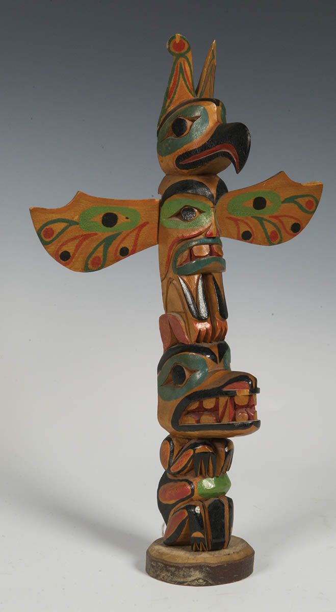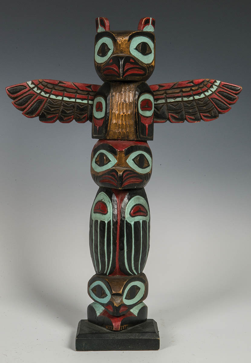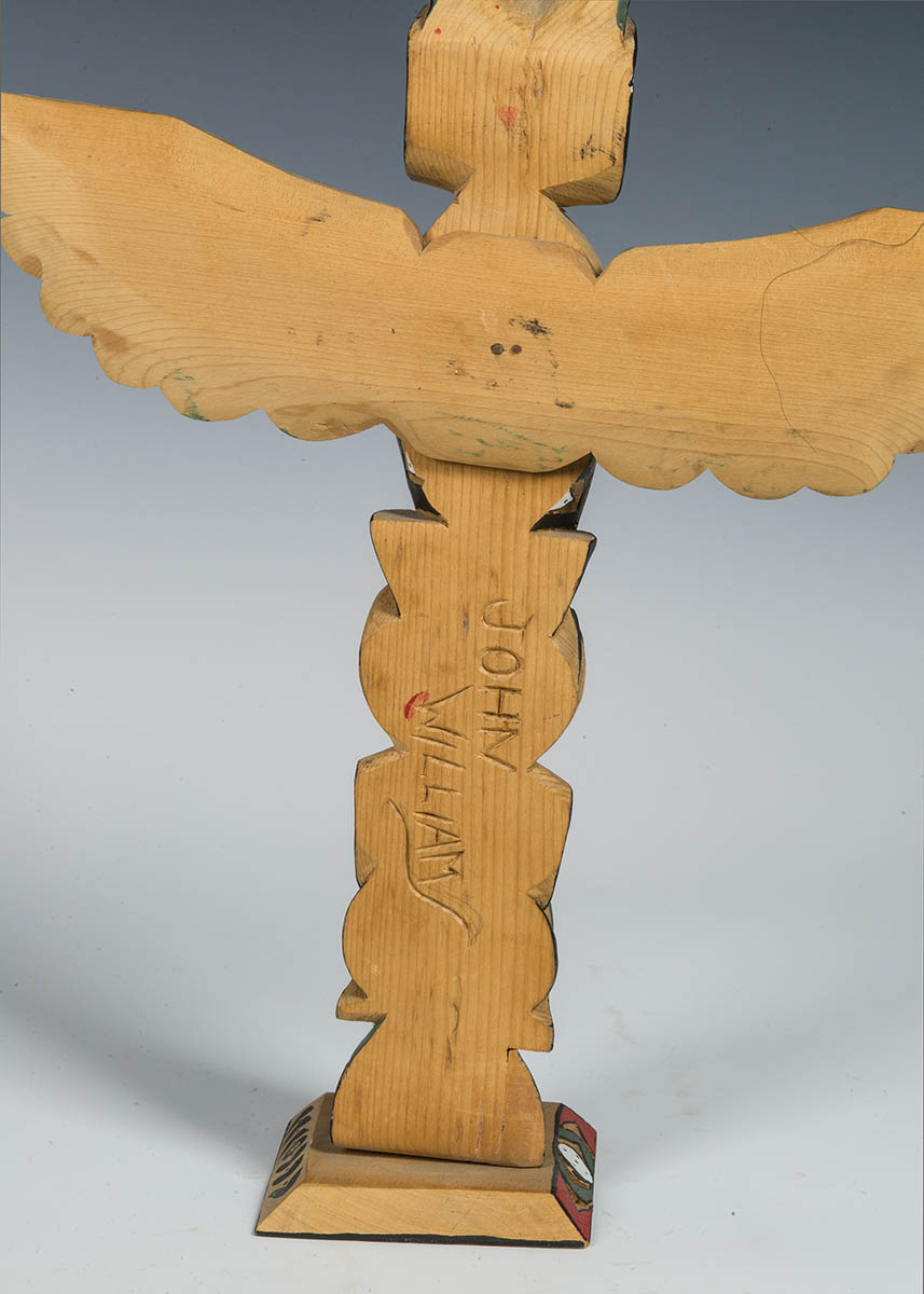 Winged carved and painted totems, 20th c., raven, wolf, intricately carved with polychrome decoration, (note: one with white paint signed on back “John William” – 12″ h), 16″ and 14″ h.