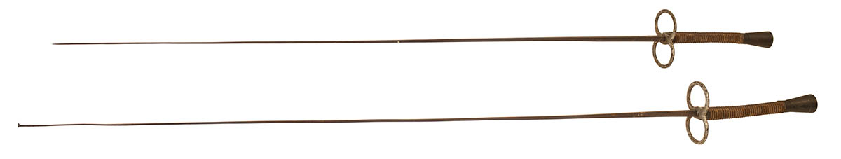 Pair of early French fencing foils, stamped “L Carre, Paris” on the four sided blades, one has a missing tip, 41 1/2″ and 42″ l.