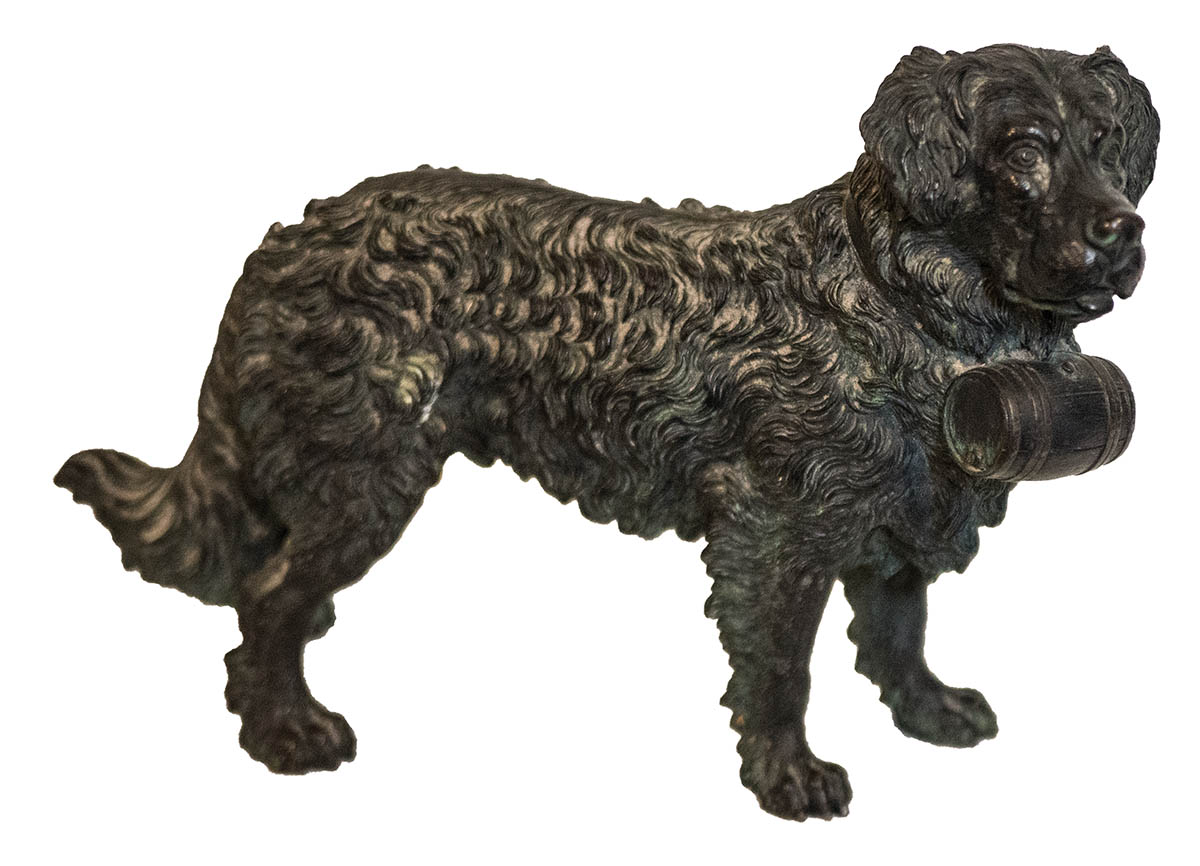 19th/early 20th c. bronze, curly haired, life saving dog with rum keg, 10″ h, 15″ l.