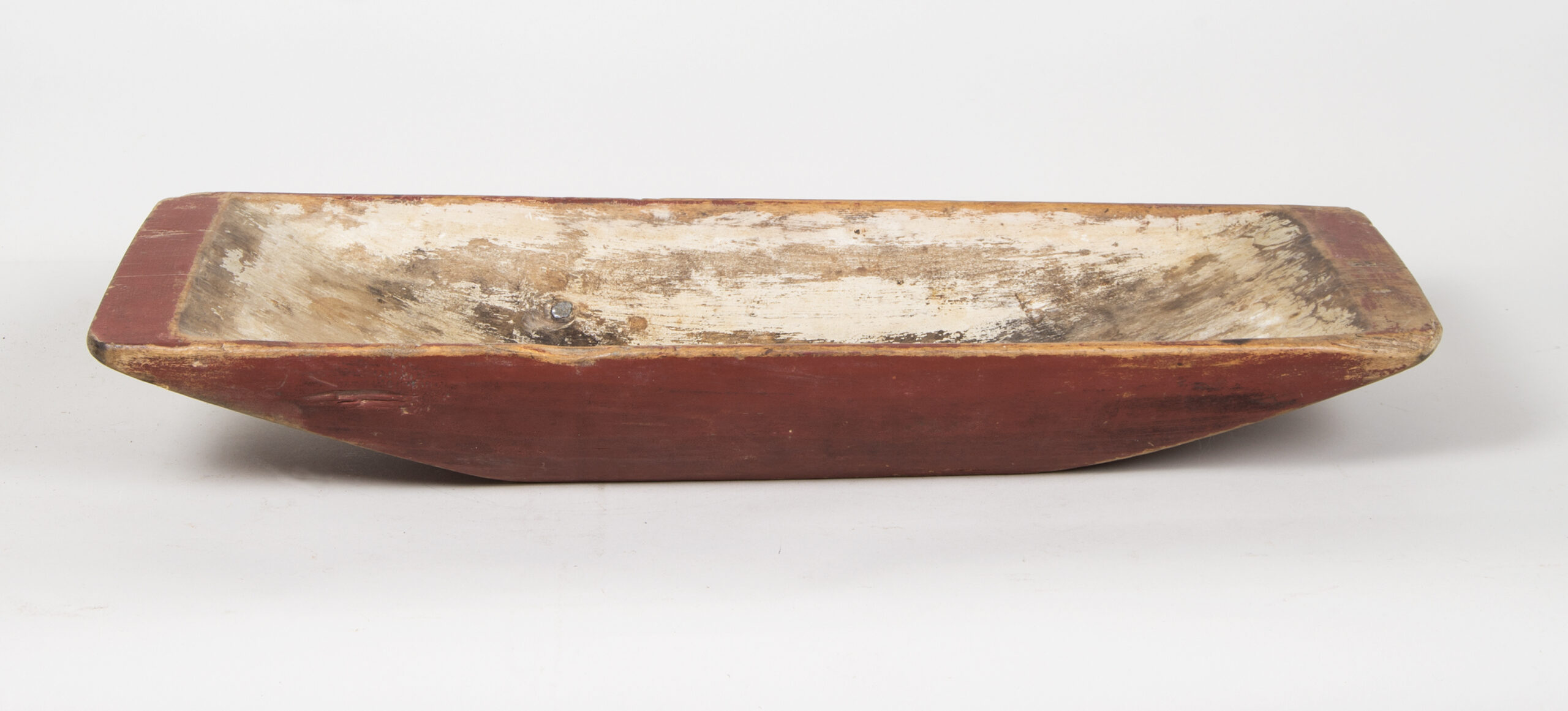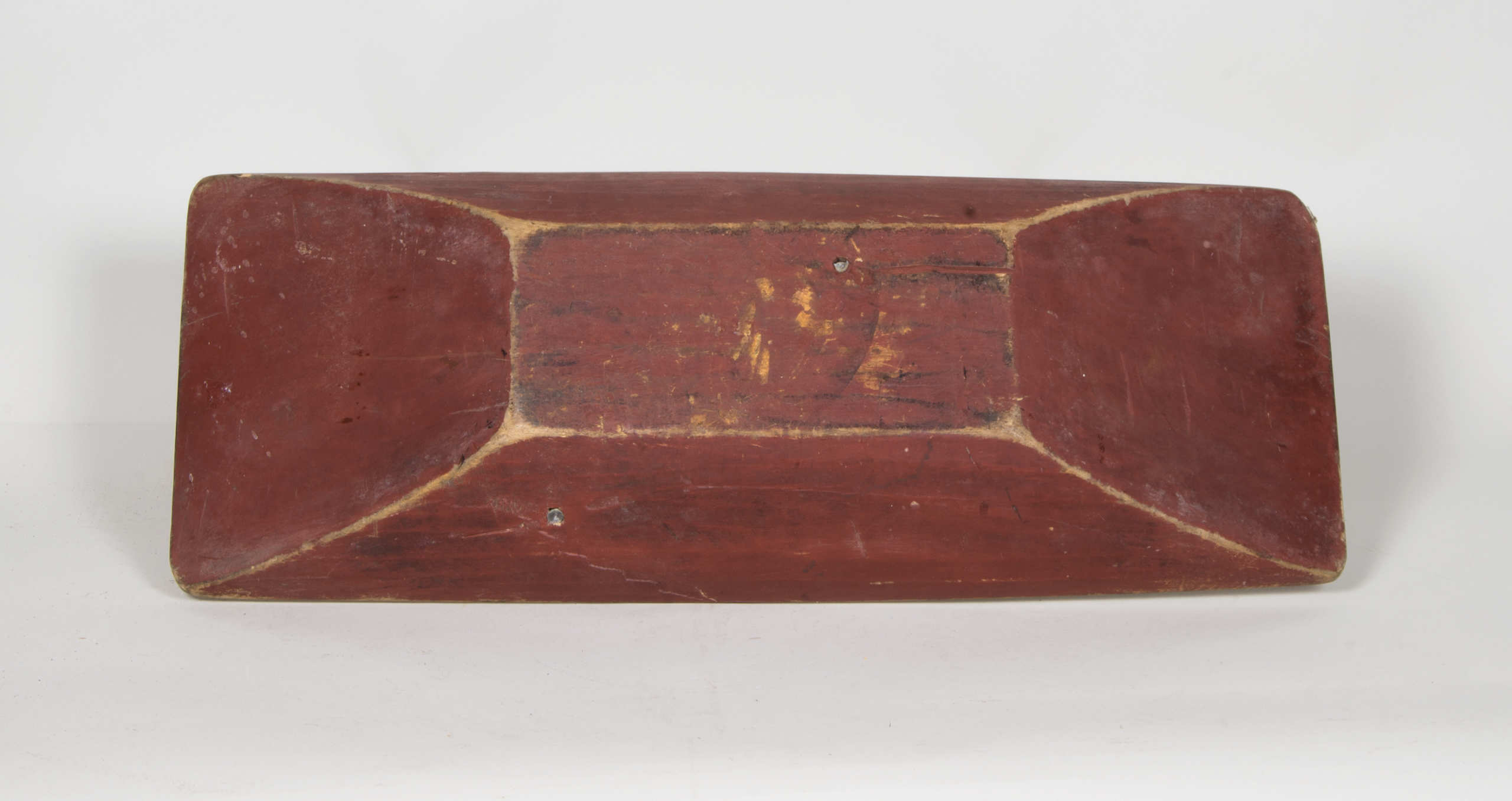 Rectangular maple trencher, original red with worn white interior, canted sides and ends, 4″ h, 26″ l, (ex. Marjorie Ellis estate, Sandwich, MA).