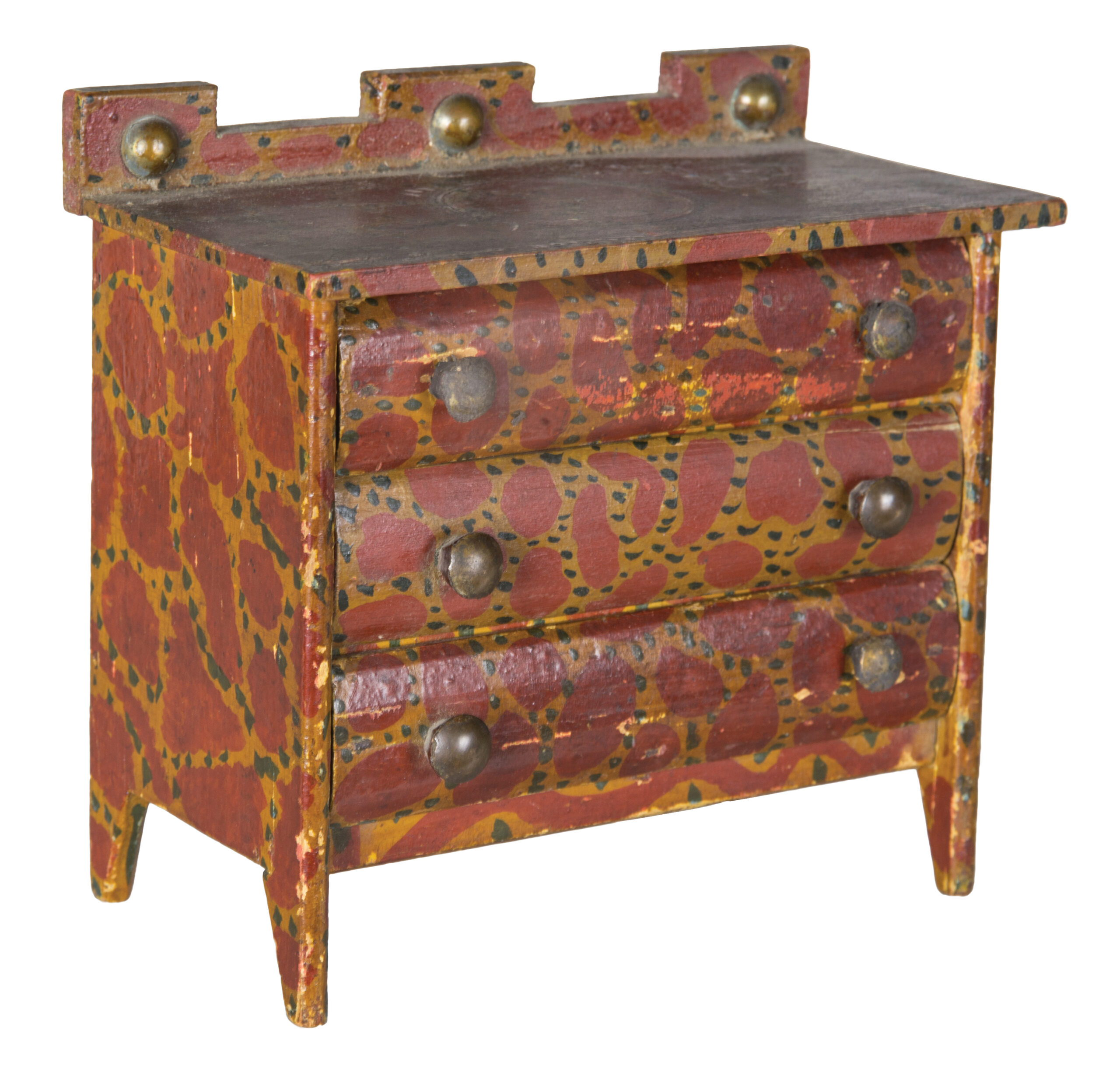 Original red with exceptional web grained paint in yellow with green dots, cut out rectangular backsplash, with three brass round head tacks, beveled drawer fronts with small brass pulls, “T” head nail construction, overall good condition, found in Vermont, 5 1/4″ h (to top of backsplash), 5 1/4″ w (case), 2 3/4″ d.