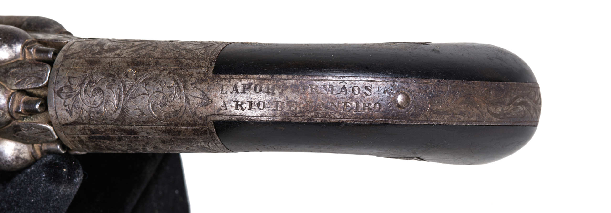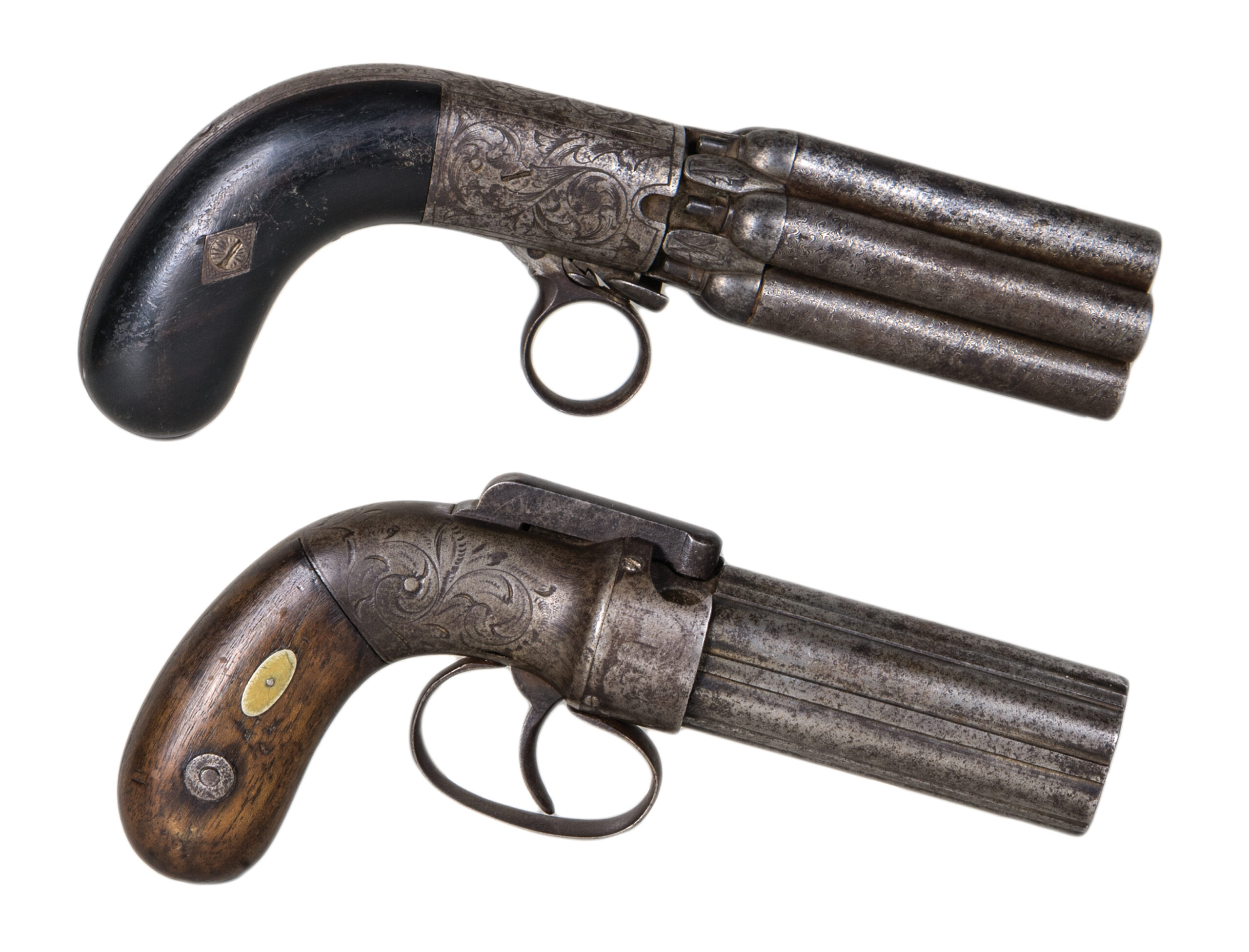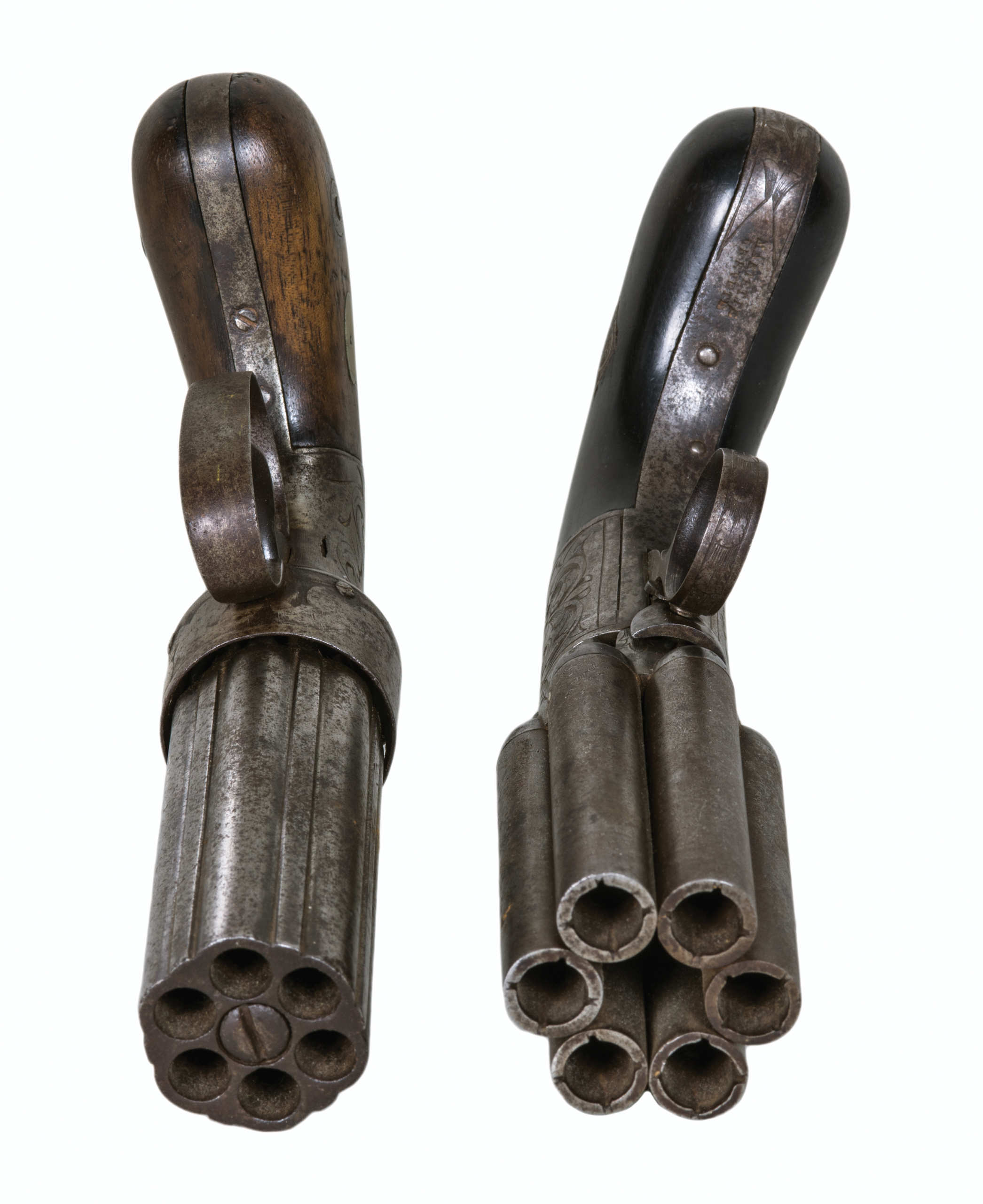 One marked on the firing cap “Allens Patent”, and dated “1837” on barrel, finely engraved, six barrels, some discolor on steel, 7″ l; the other marked “Laport Irmaos A Rio De Janeiro”, and marked “ELG” with a star below in an oval, very fine engraving, six barrels, 7 1/2″ l.