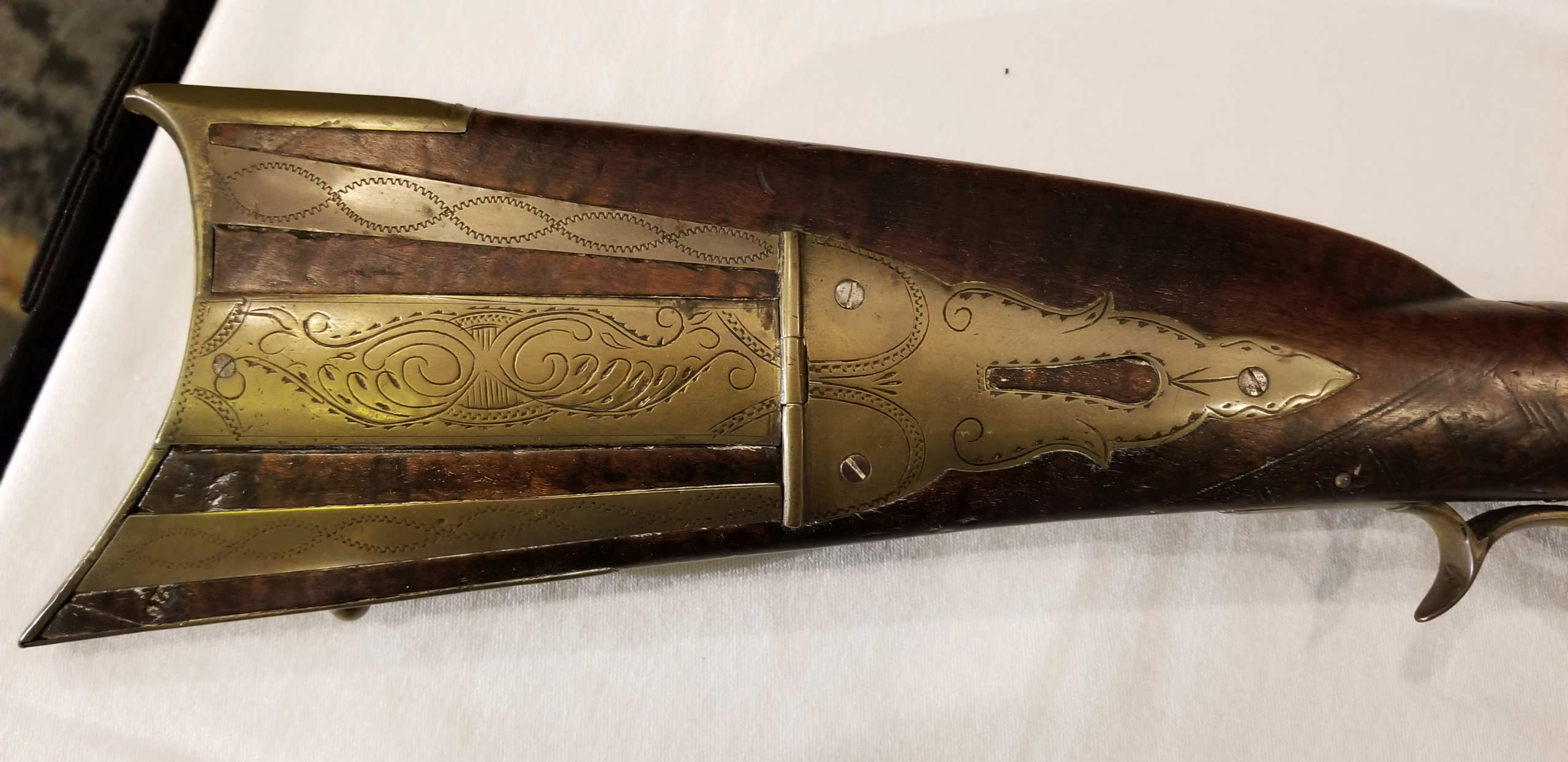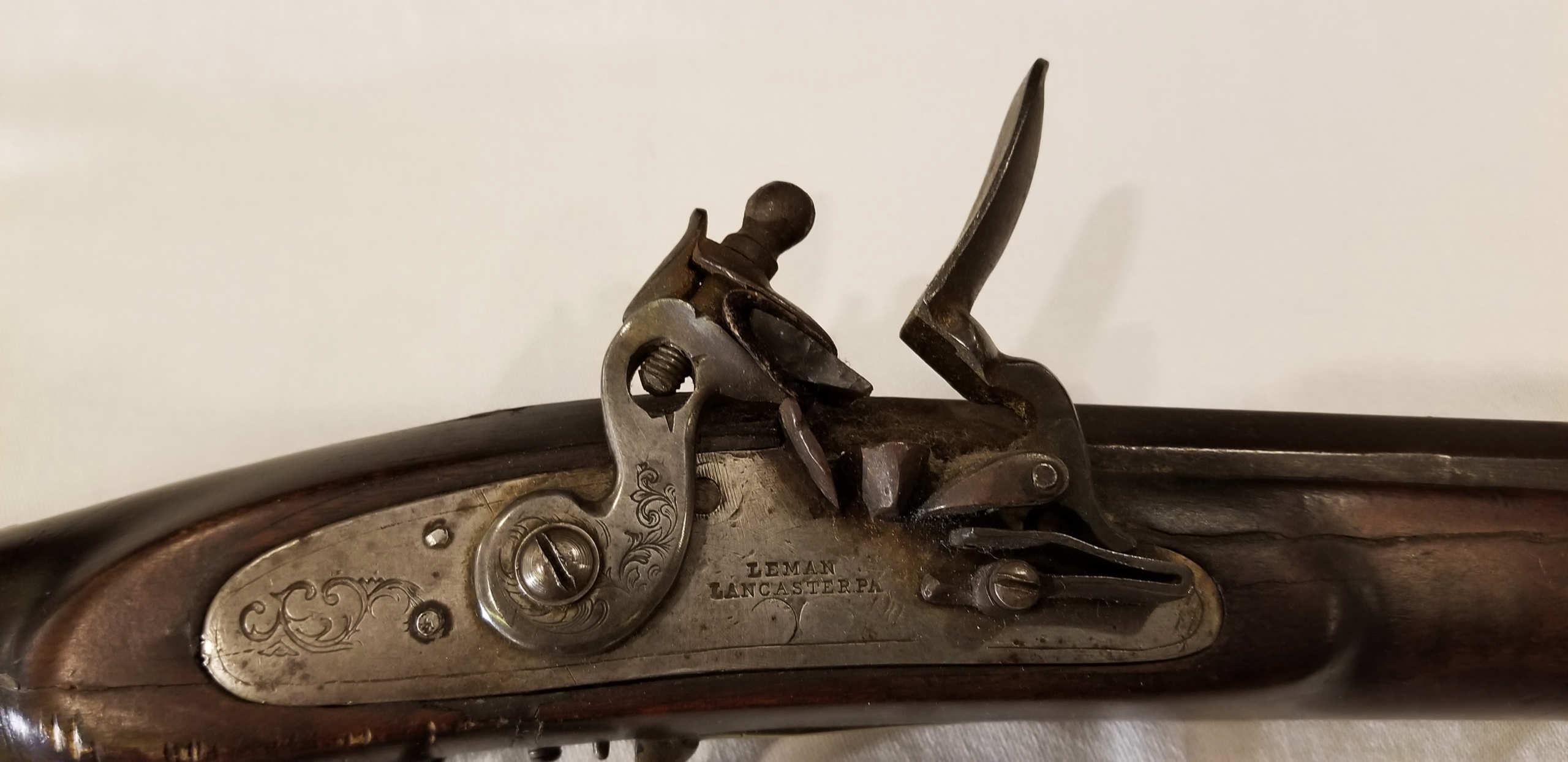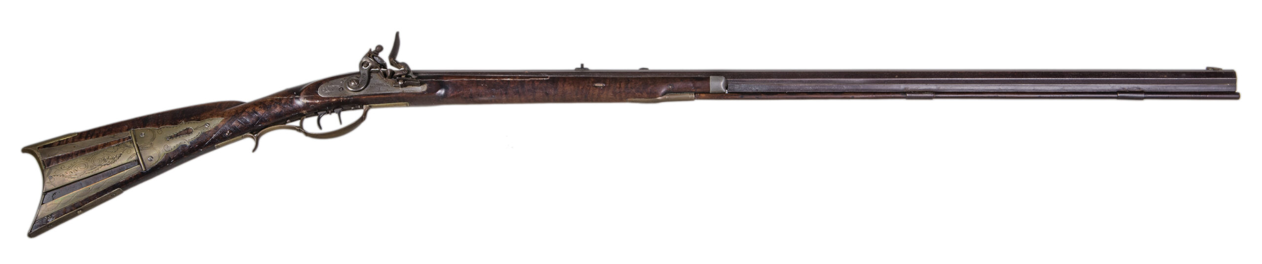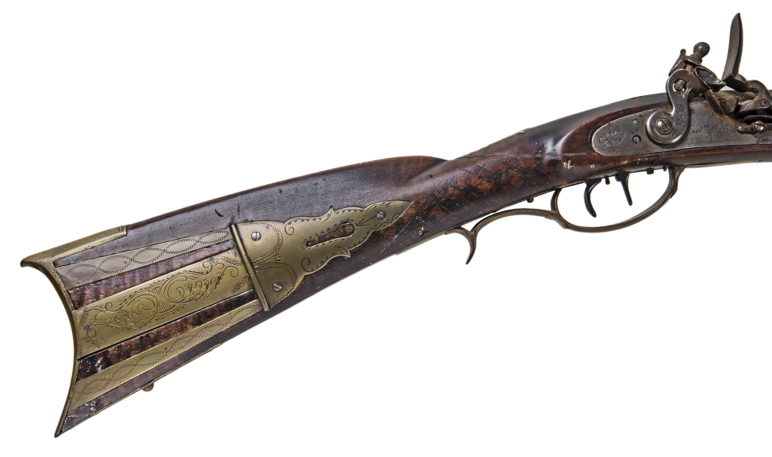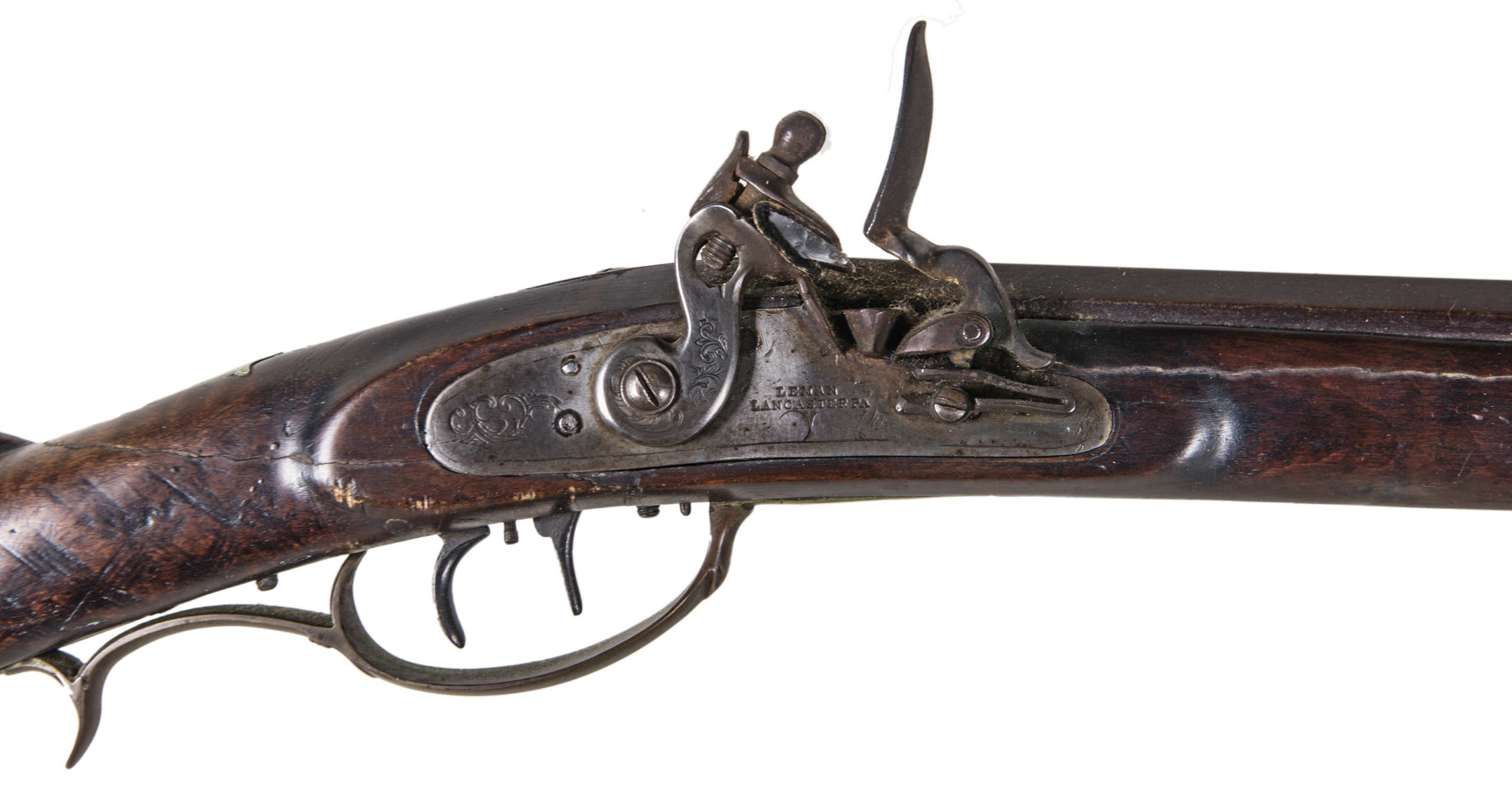 Flintlock, tiger maple stock, c. 1830-1840, octagonal, signed “Leman, Lancaster, Pa” on lock plate, finely engraved brass patch box, double trigger, brass trigger guard, appears to be original wood ram rod, stock shows a crack with old repair, very fine patina, 53″ l.