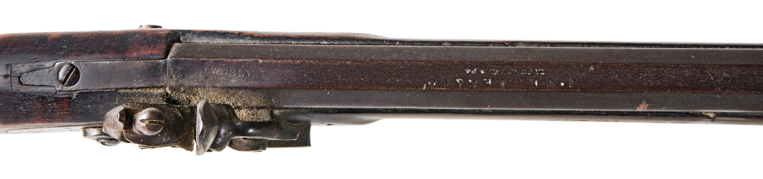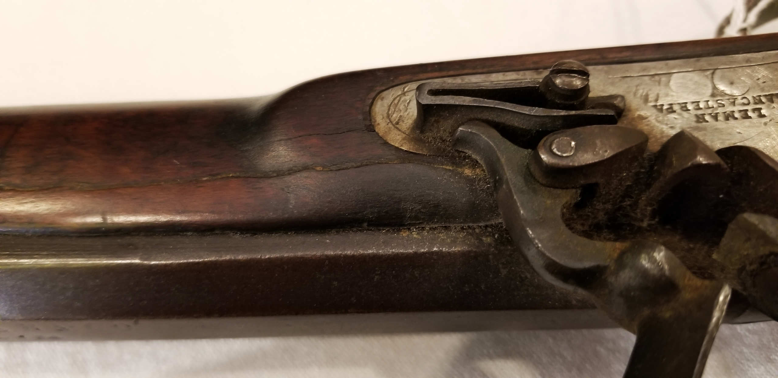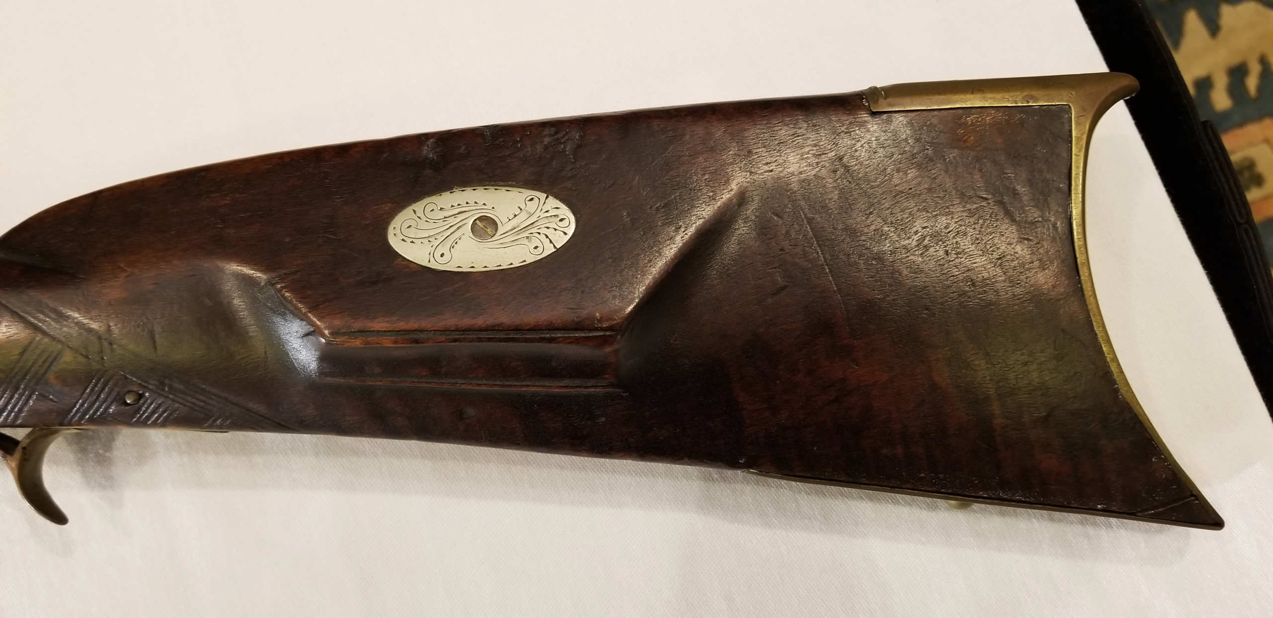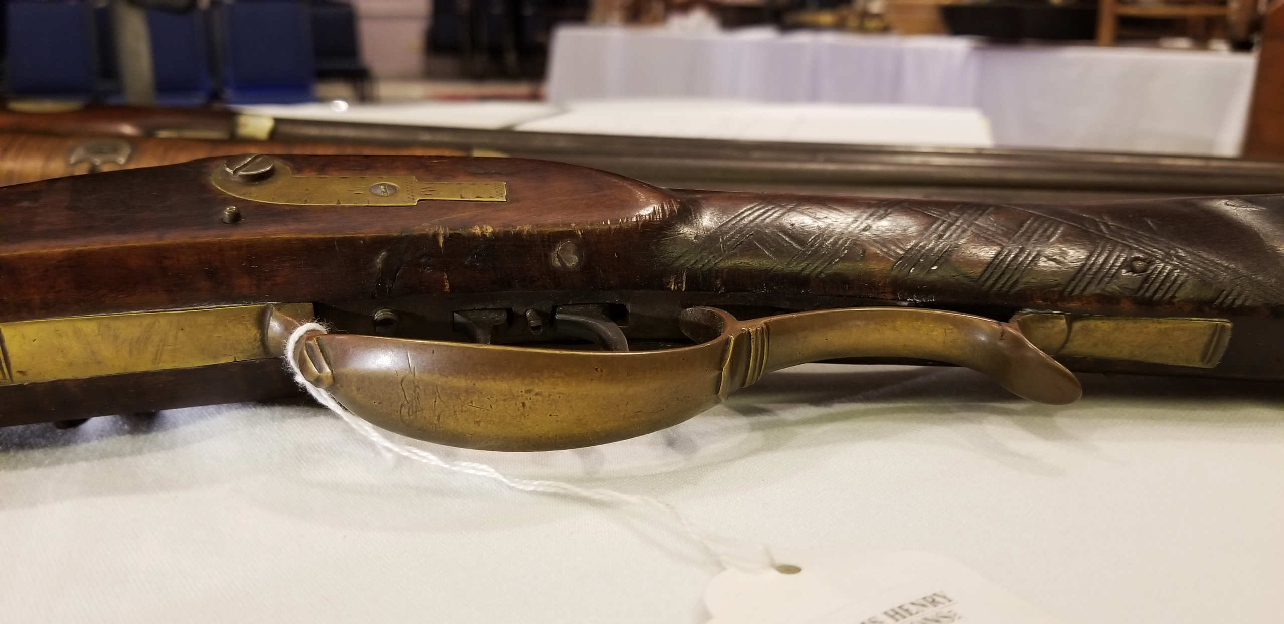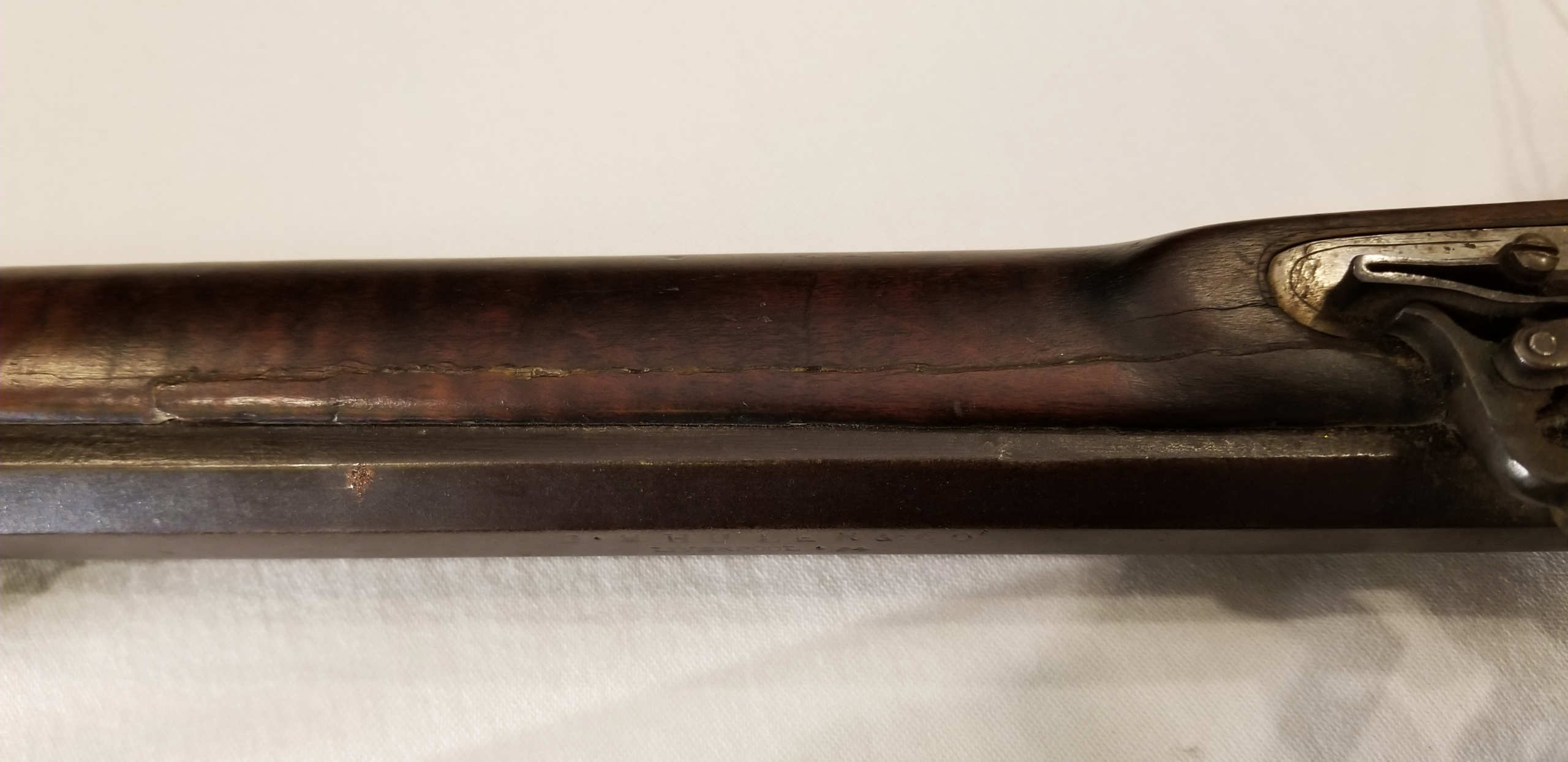 Flintlock, tiger maple stock, c. 1830-1840, octagonal, signed “Leman, Lancaster, Pa” on lock plate, finely engraved brass patch box, double trigger, brass trigger guard, appears to be original wood ram rod, stock shows a crack with old repair, very fine patina, 53″ l.