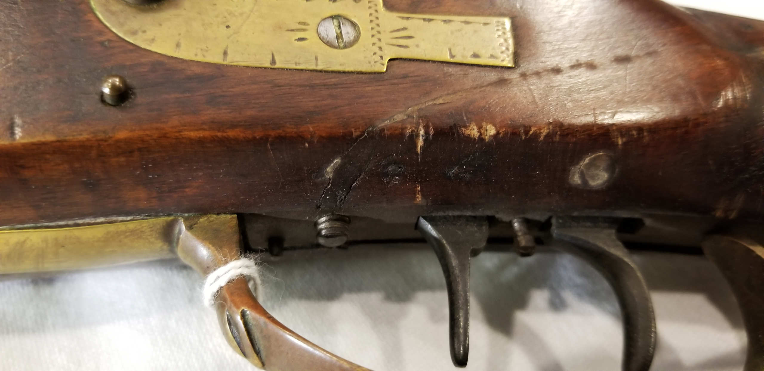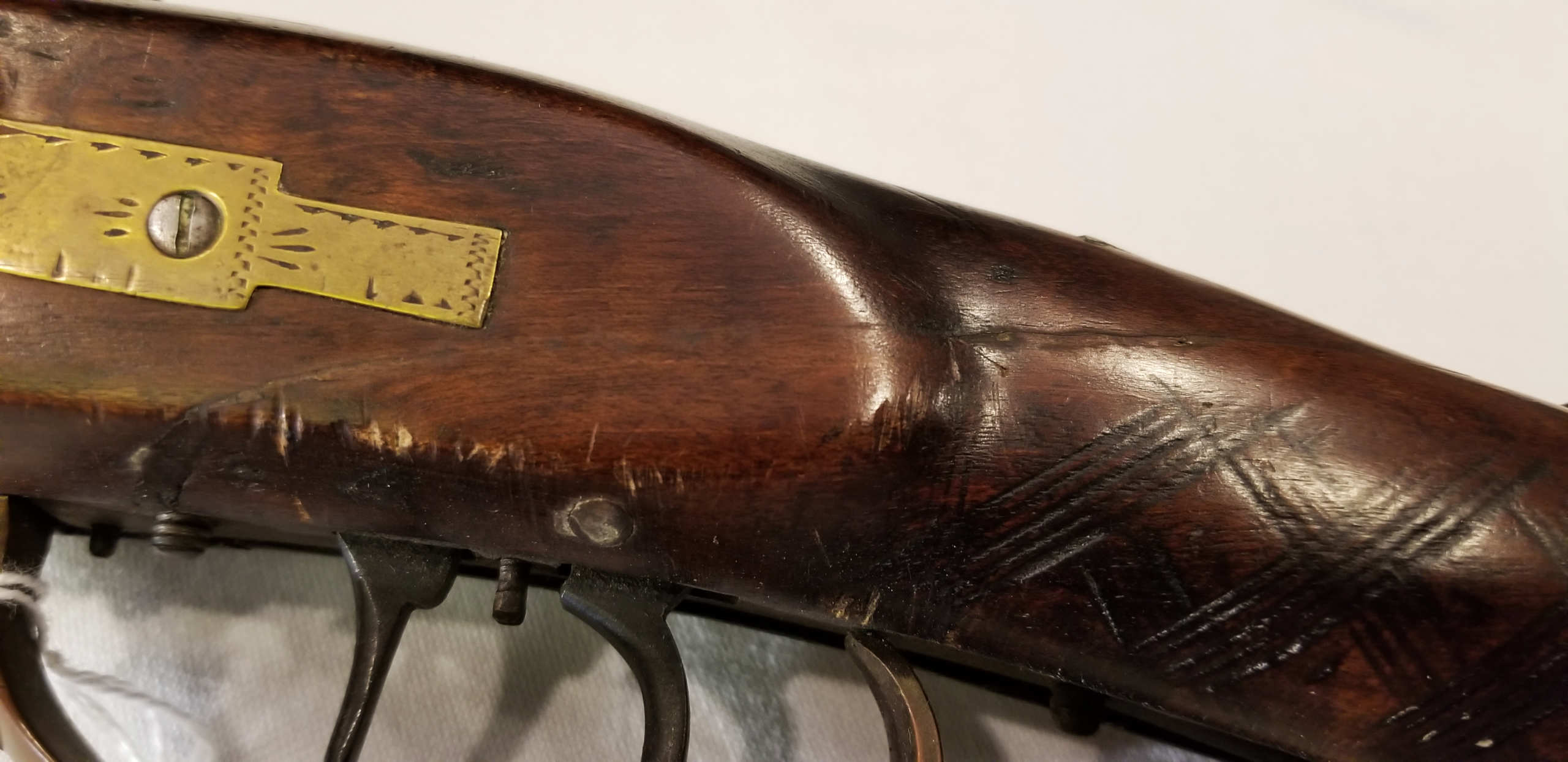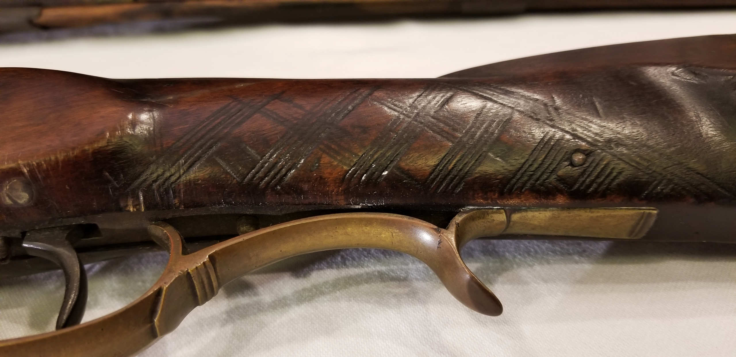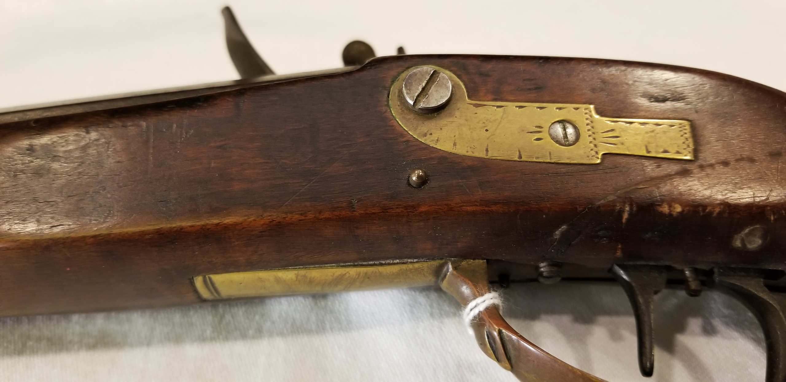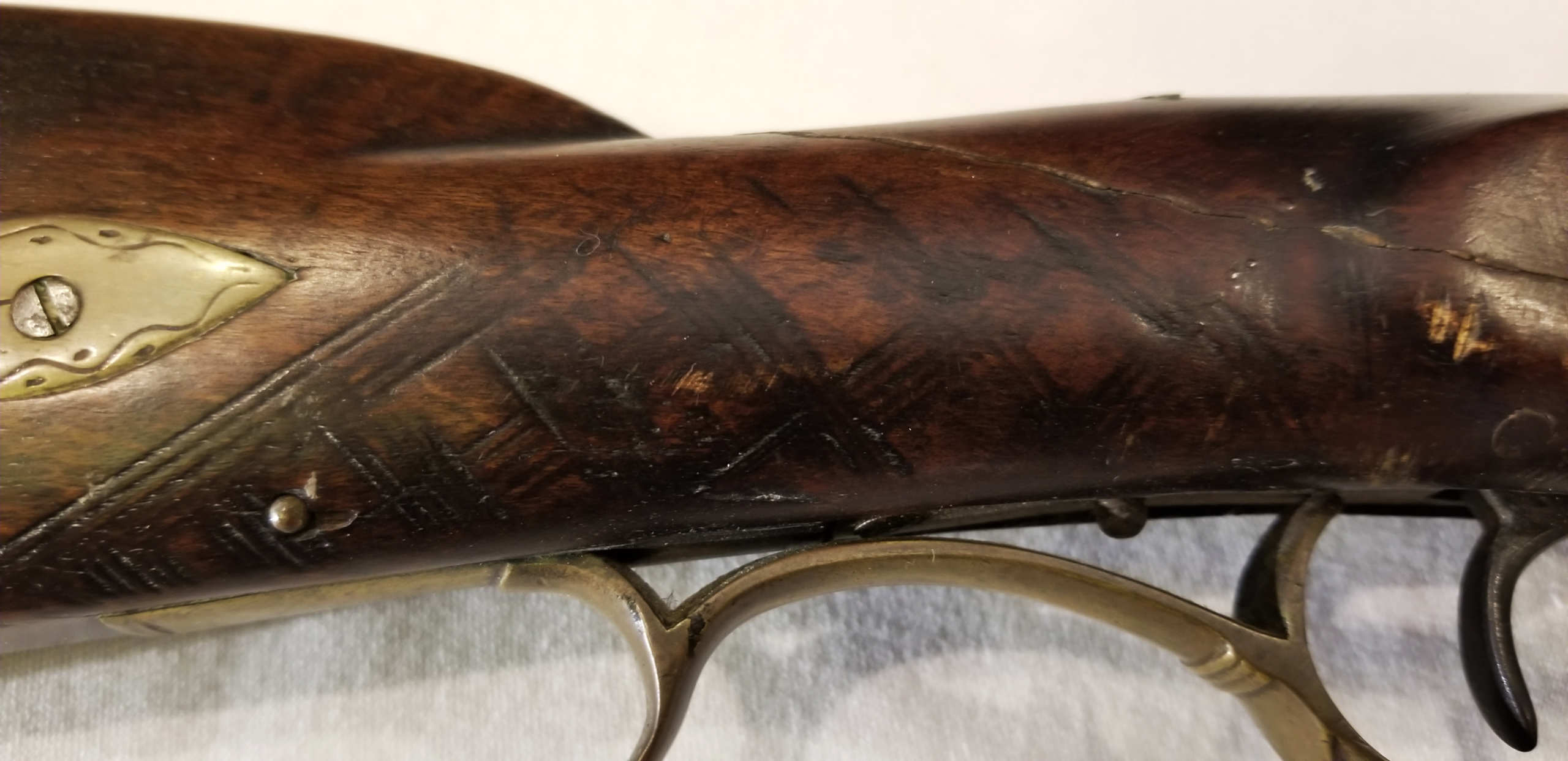 Flintlock, tiger maple stock, c. 1830-1840, octagonal, signed “Leman, Lancaster, Pa” on lock plate, finely engraved brass patch box, double trigger, brass trigger guard, appears to be original wood ram rod, stock shows a crack with old repair, very fine patina, 53″ l.