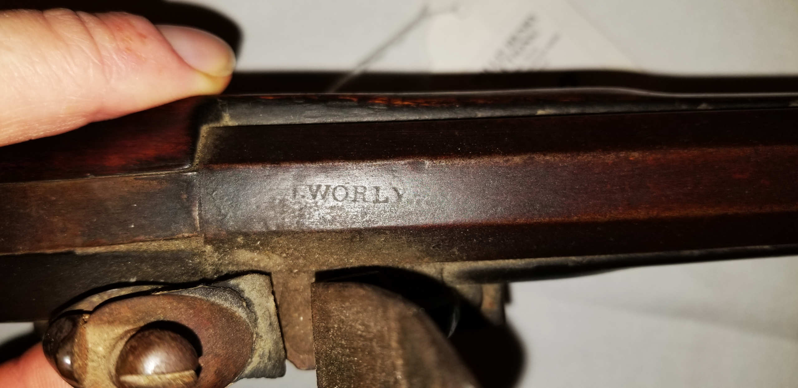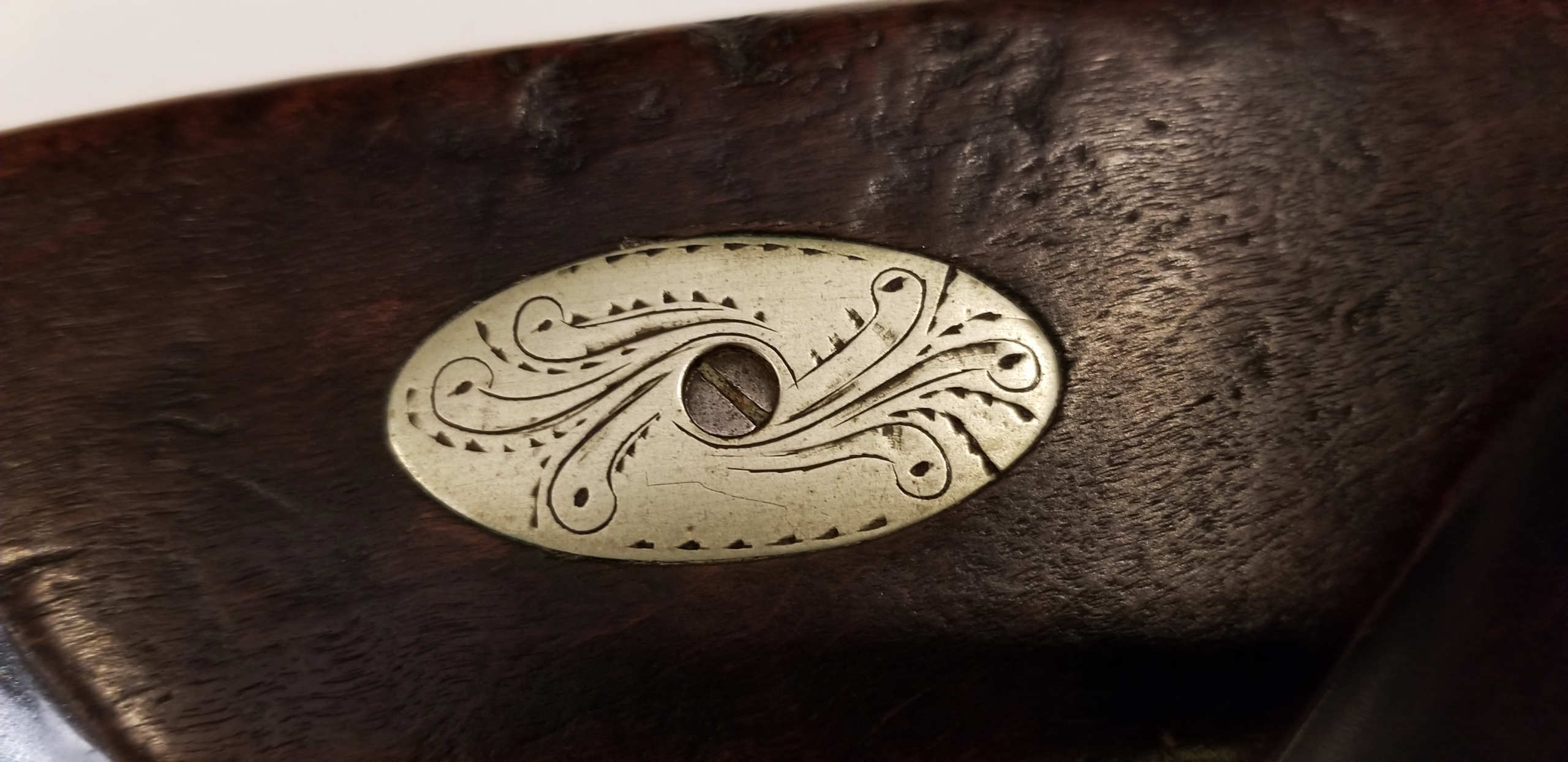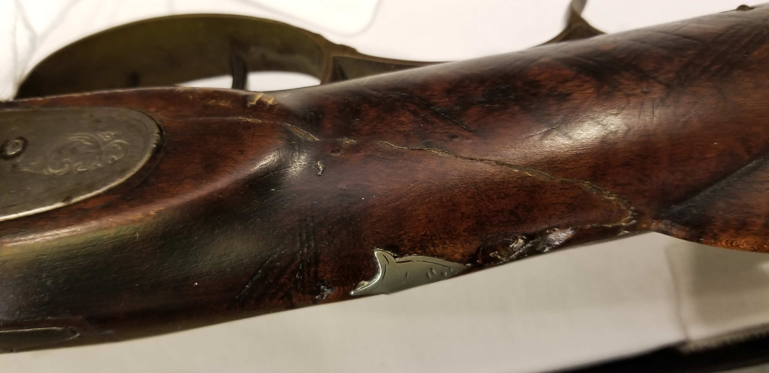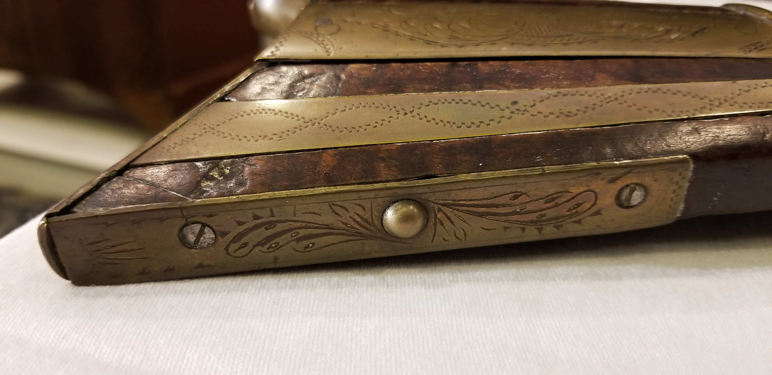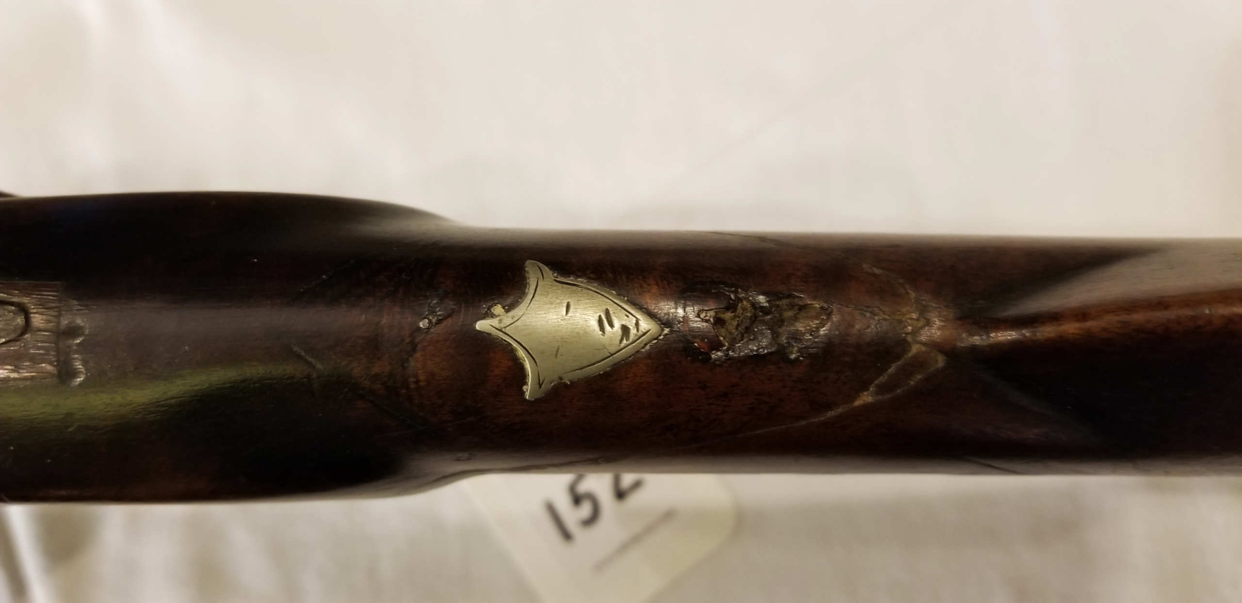 Flintlock, tiger maple stock, c. 1830-1840, octagonal, signed “Leman, Lancaster, Pa” on lock plate, finely engraved brass patch box, double trigger, brass trigger guard, appears to be original wood ram rod, stock shows a crack with old repair, very fine patina, 53″ l.