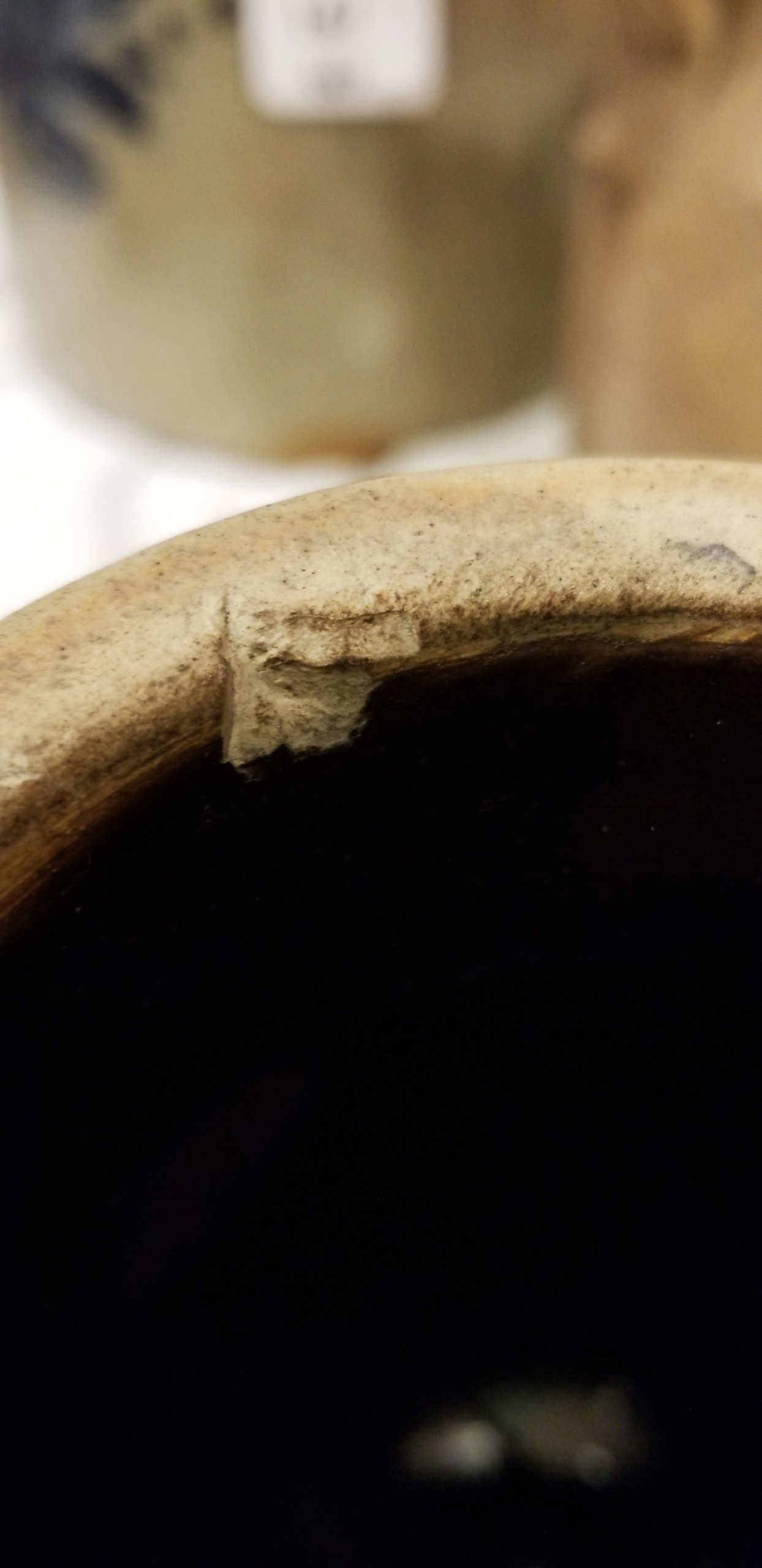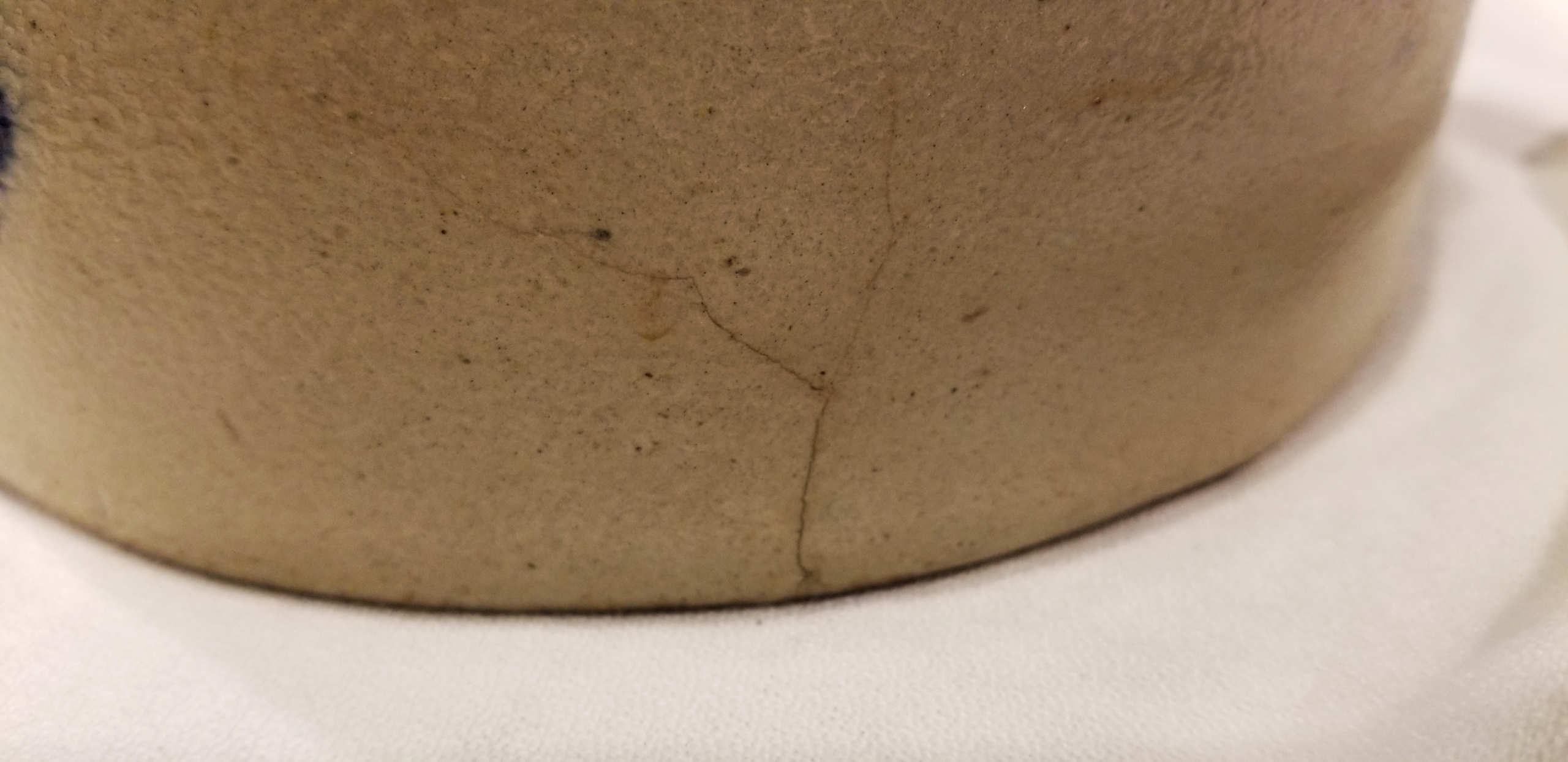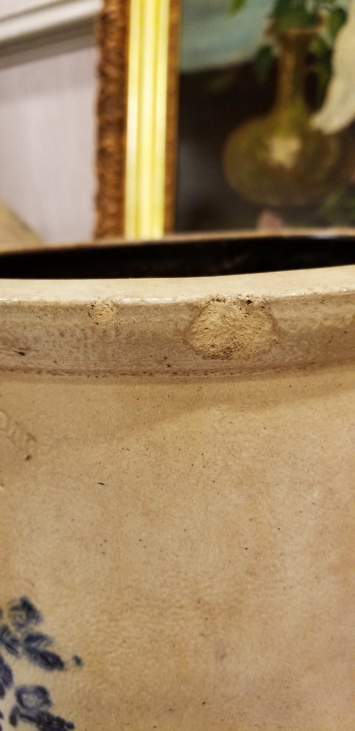 Two crocks with floral decoration, one marked “S.L. Pewtress & Co, Fairhaven, Conn”, two-gallon, and “F.T. Wright & Son Stoneware, Taunton, Mass”; a sprig decorated jug marked “E. Norton, Bennington, VT”, and a wider mouth handled jug, marked “The J.A. Budlong & Son Co.”.