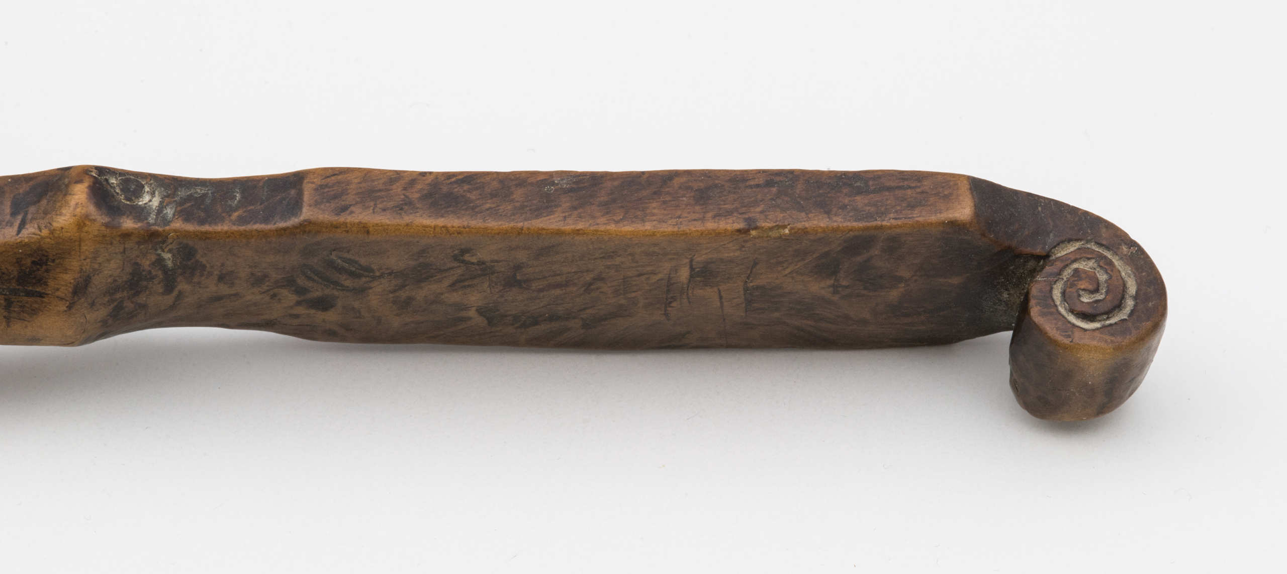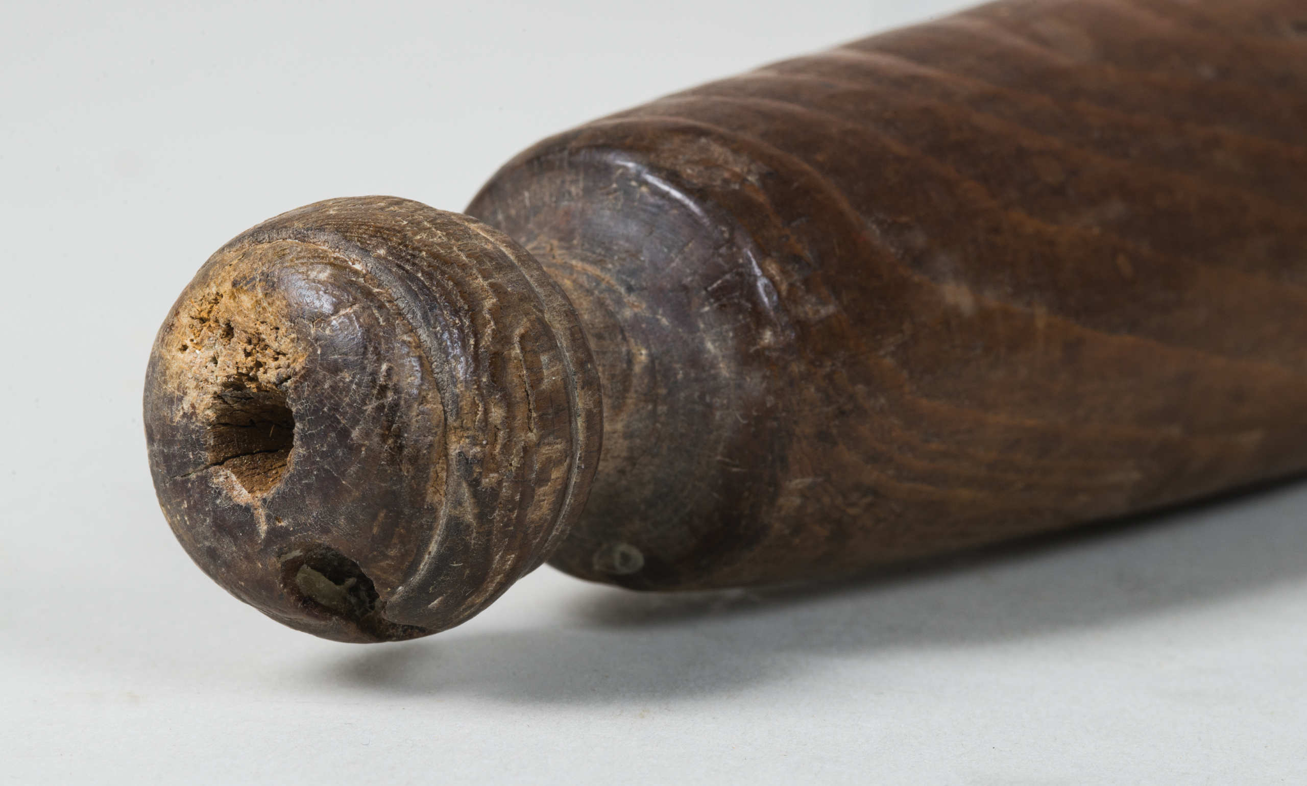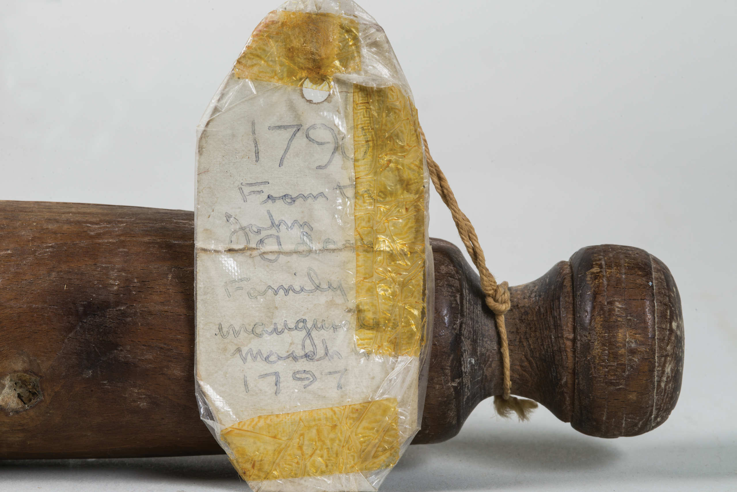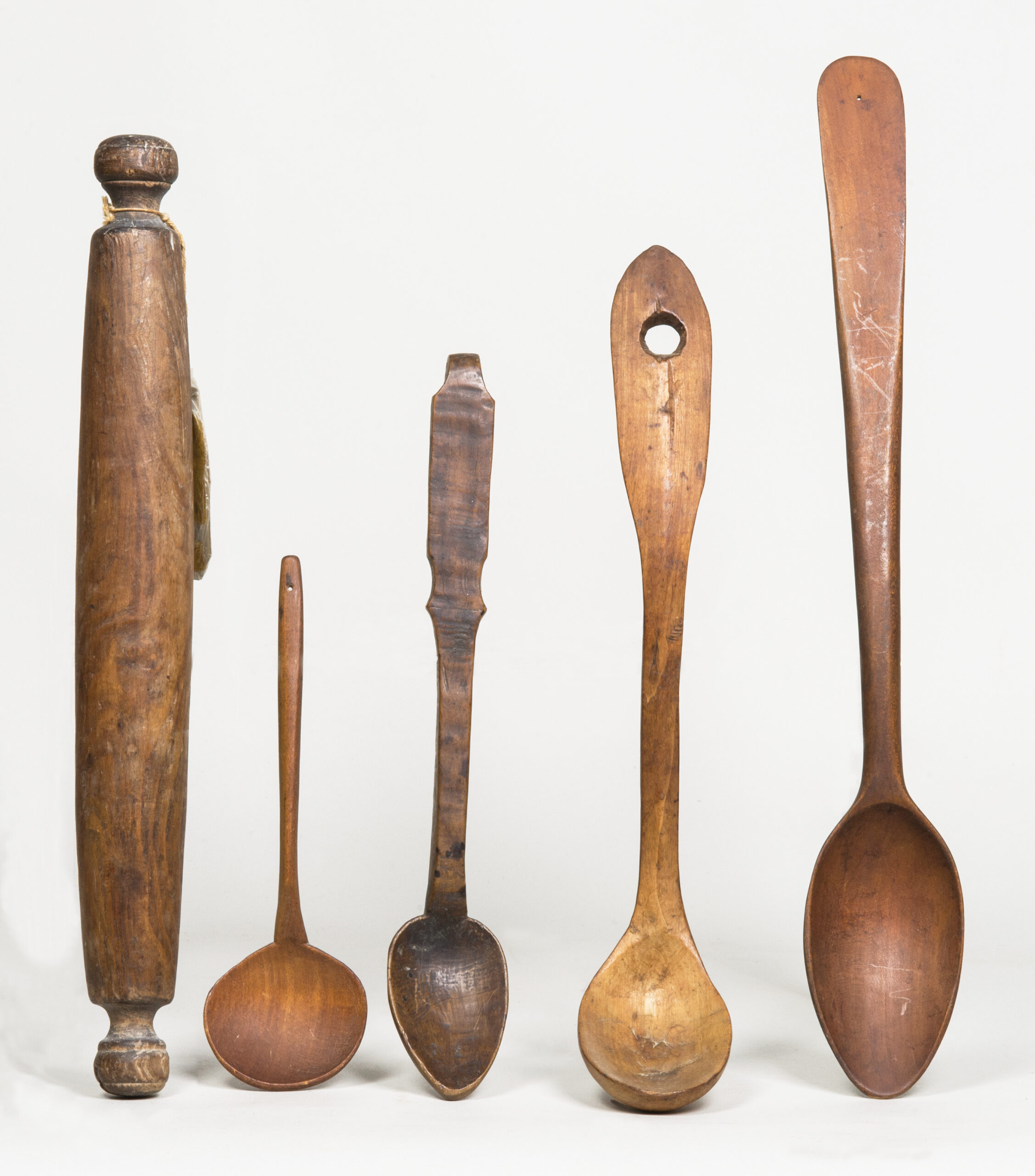 Finely carved spoon, with tip of handle carved into a rat tail, 12″ l; Long handled spoon with flattened top, 17 1/2″ l; Carved maple spoon with bent handle, 14″ l; Spoon, 9″ l; Tagged rolling pin, “from the John Adams family”, c. 1790, 15 1/2″ l.