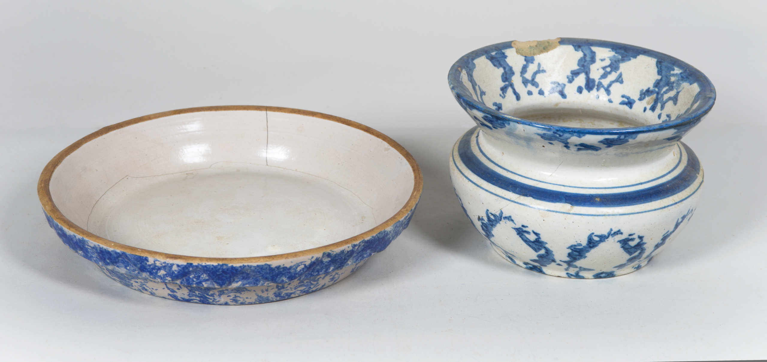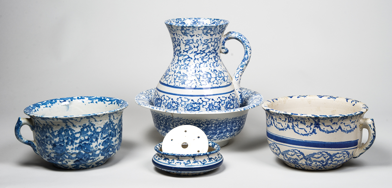 Bowl (13″ dia) and pitcher (11 1/2″ h) set, (small rim chip), with exceptional applied handle; Two handled chamber pots; Rare butter dish, with original pottery insert; Spittoon with rim chip, 5″ h; Rare pie plate, (cracked), 2″ h, 11″ dia.