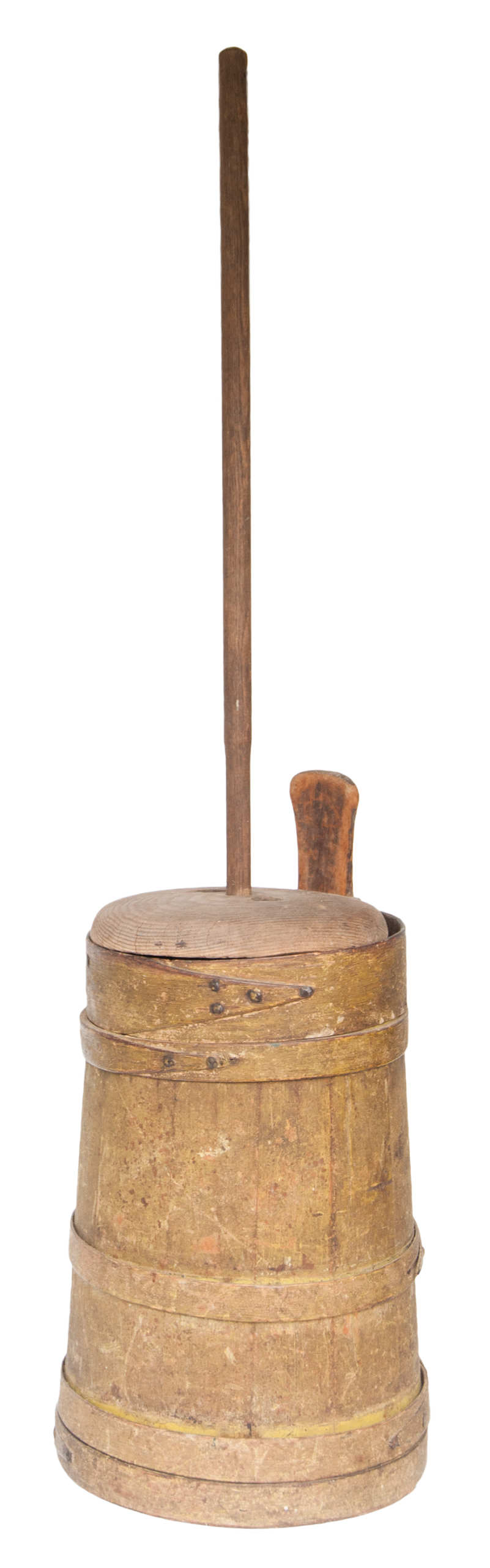 Original yellow green paint, rosehead nailed bands, piggen handle, dasher is a replacement, 19″ h, (ex. Curry collection).