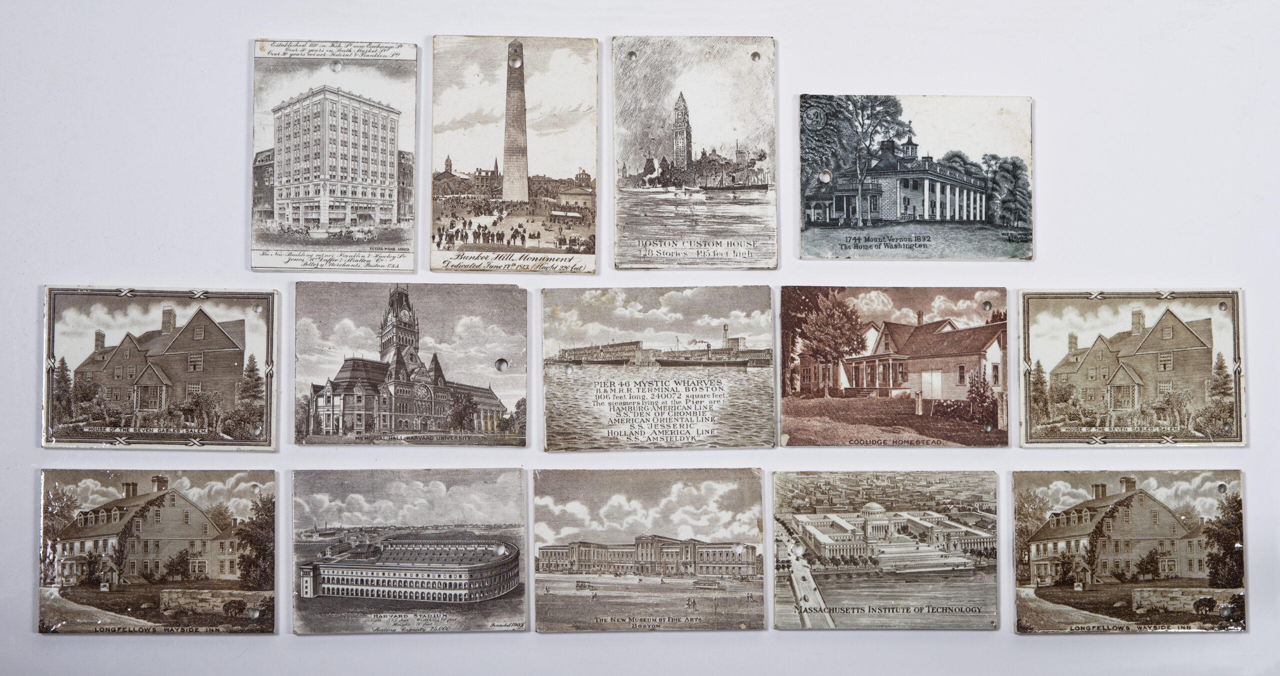 “James McDuffee & Stratton Co…Boston, U.S.A., 1892 Mt. Vernon 17444892, “The Home of Washington”; 1916 “M.I.T.; 1909 “The New Museum of Fine Arts”; 1929 “House of Seven Gables”, Salem (2); 1927 “Longfellows Wayside Inn” (2); 1926 “Coolidge Homestead”; 1913 “Pier 46 Mystic Wharves, Boston”; 1901 “Bunker Hill Monument”; 1915 “Boston Custom House”; 1919 “Memorial Hall, Harvard”, (small chip at upper right corner); 1906 “Federal & Franklin St, Boston”; 1907 “Harvard Stadium”.