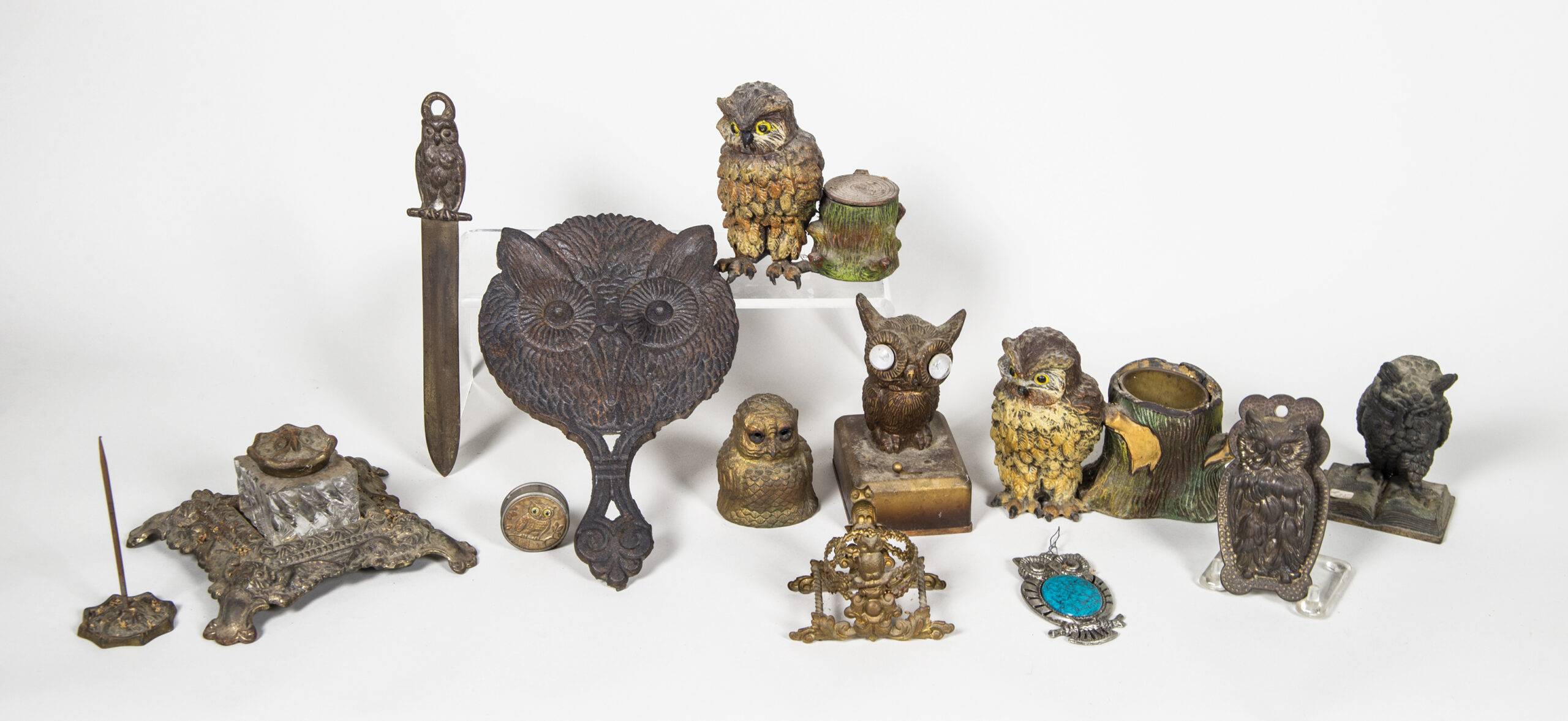 Paperweights, match holders, hanging clamp, incense burner, trivet, letter opener, inkwell, paper, needle, measuring tape, (ex. Marjorie Ellis estate, Sandwich, MA).