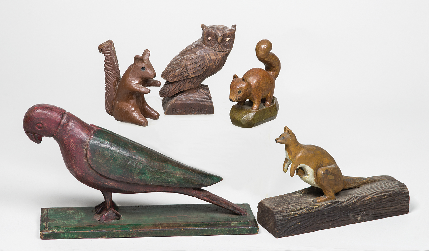 Squirrels; owl signed “Boyd Young”; kangaroo with one in the pouch on a carved wood log; and a parrot in green and red, 6″ h, 10″ l.