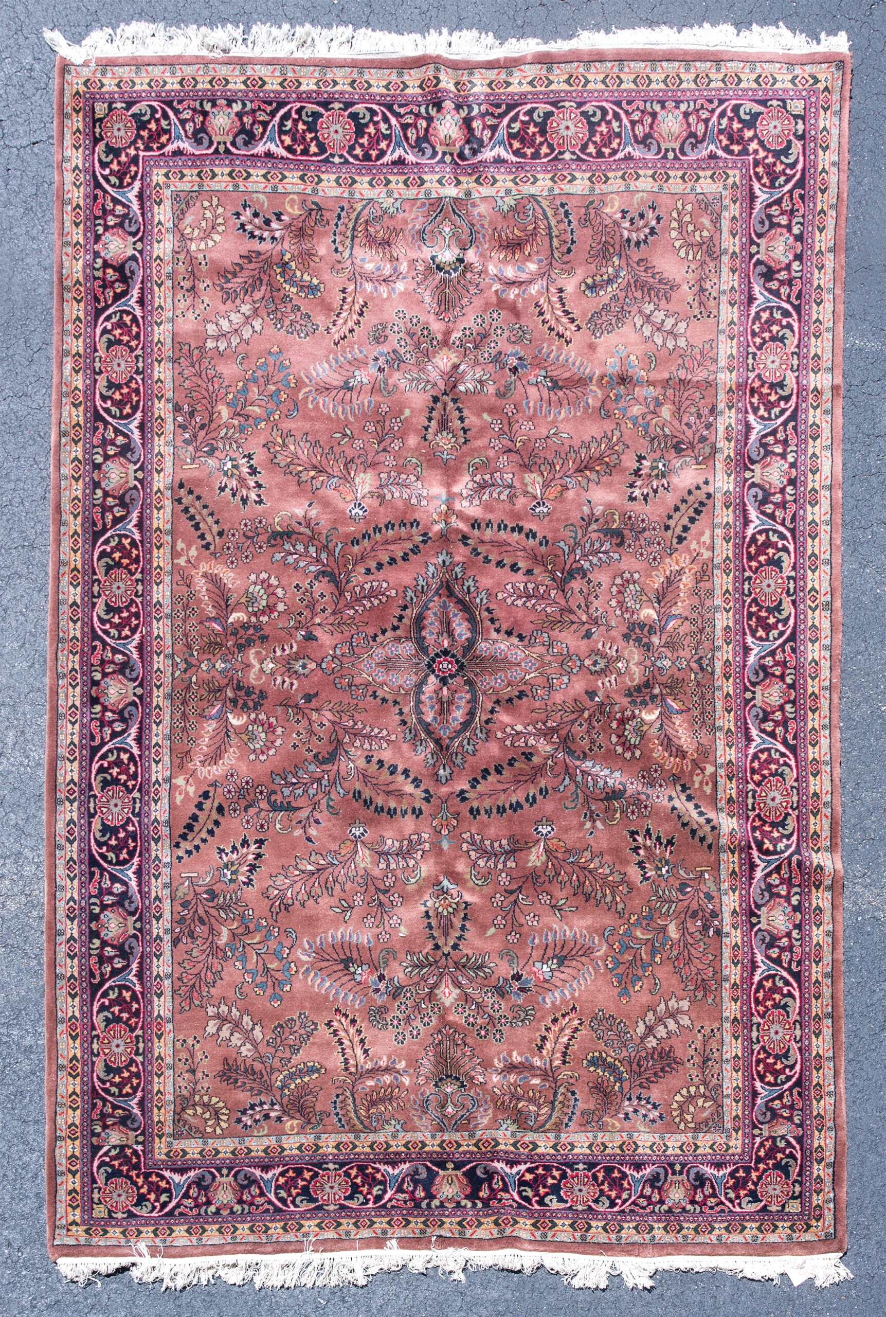 Oriental rug, light brown field, border with reds and blues, overall vines and floral, 6′ 6″ x 10′ 2″.