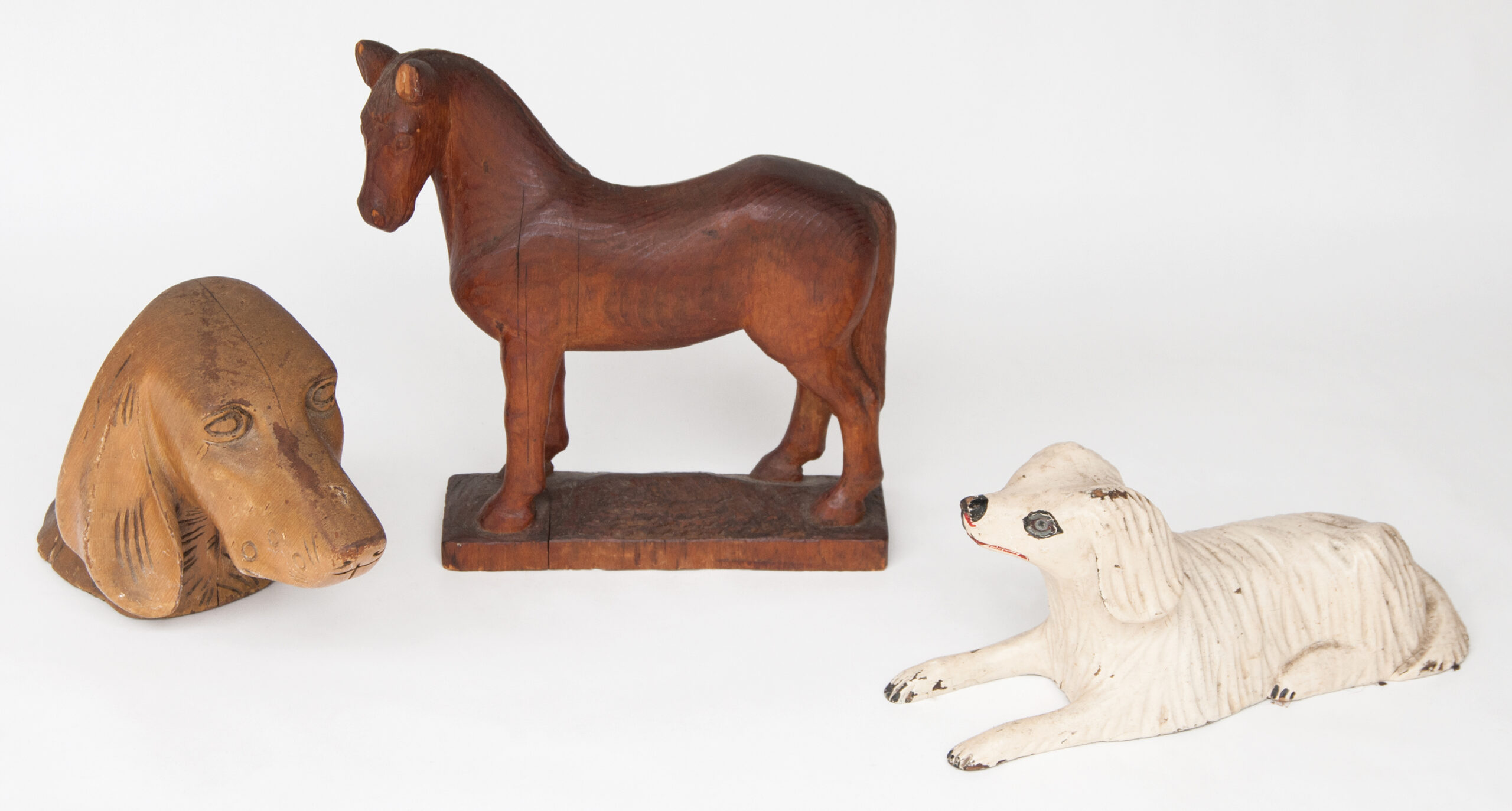 Standing horse, 8 1/2″ h; Carved head of a setter, 5 1/2″ h; Painted white dog with black eyes and nose, 19″ l.