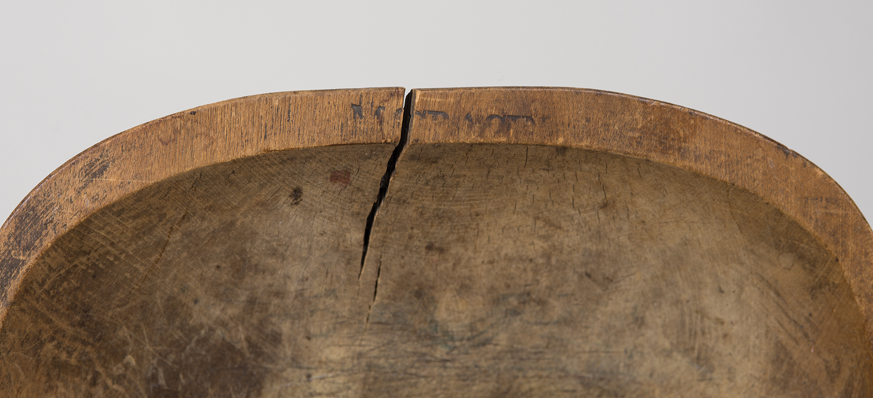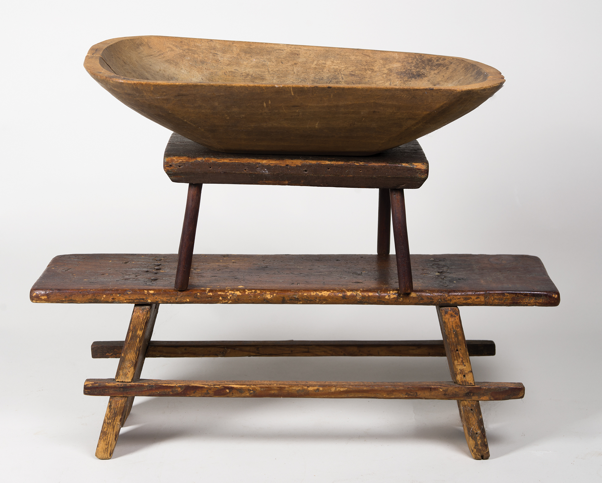 Pine stool with rectangular stretchers, 24 1/2″ l; Small pine stool with turned splayed legs, 12″ l; Maple trencher, carved from one piece of wood, canted sides, small splits at ends, 18″ l (all from an early Rhode Island collection).