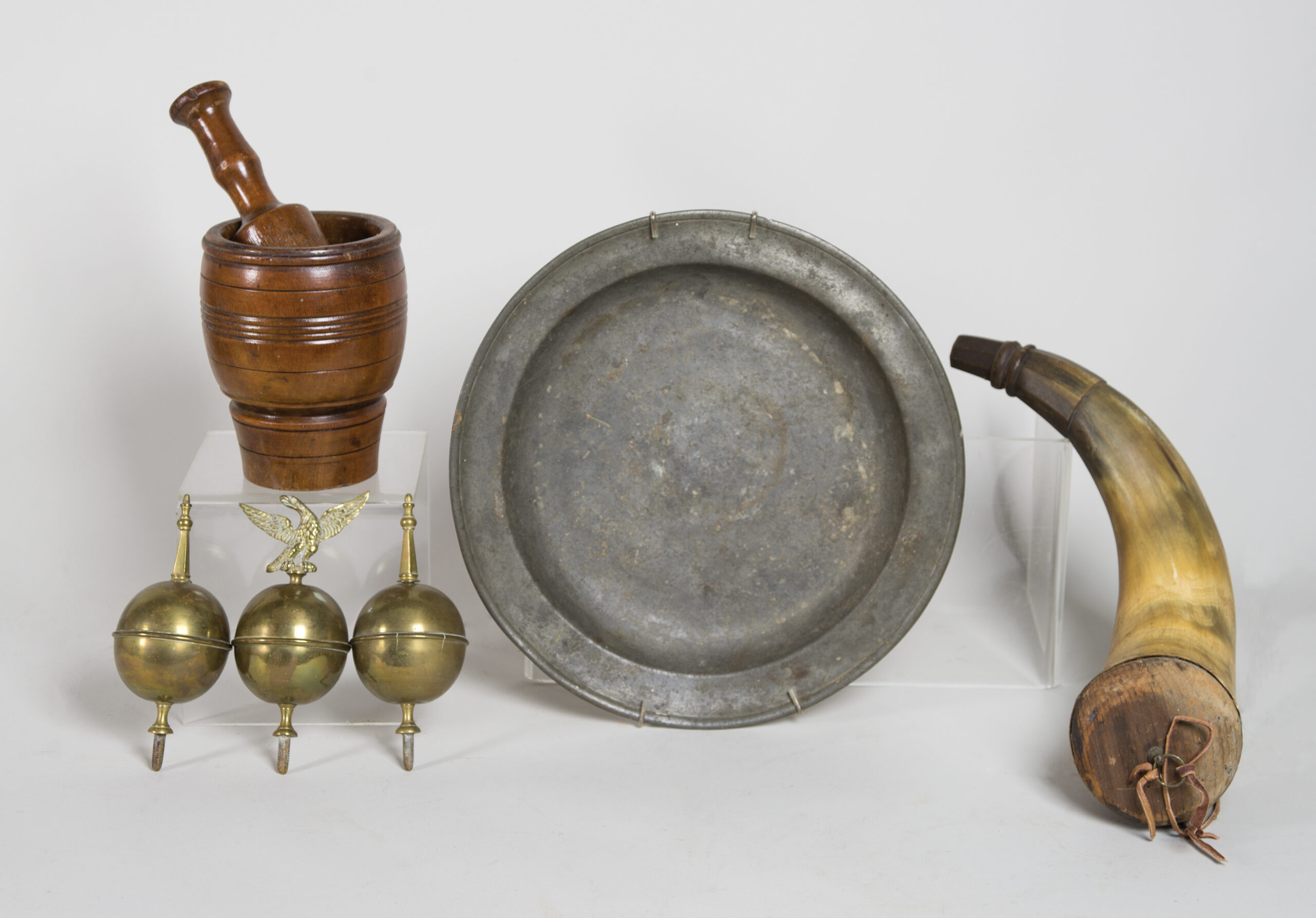 Finely turned mortar and pestle, 10″ h; 19th c. pewter charger, 13″; Large 18th/19th c. carved powder horn, with original turned pine stop, 14″ l; Three brass tall clock finials, one with eagle (20th c.), 6″ h; (from a Hingham collection).