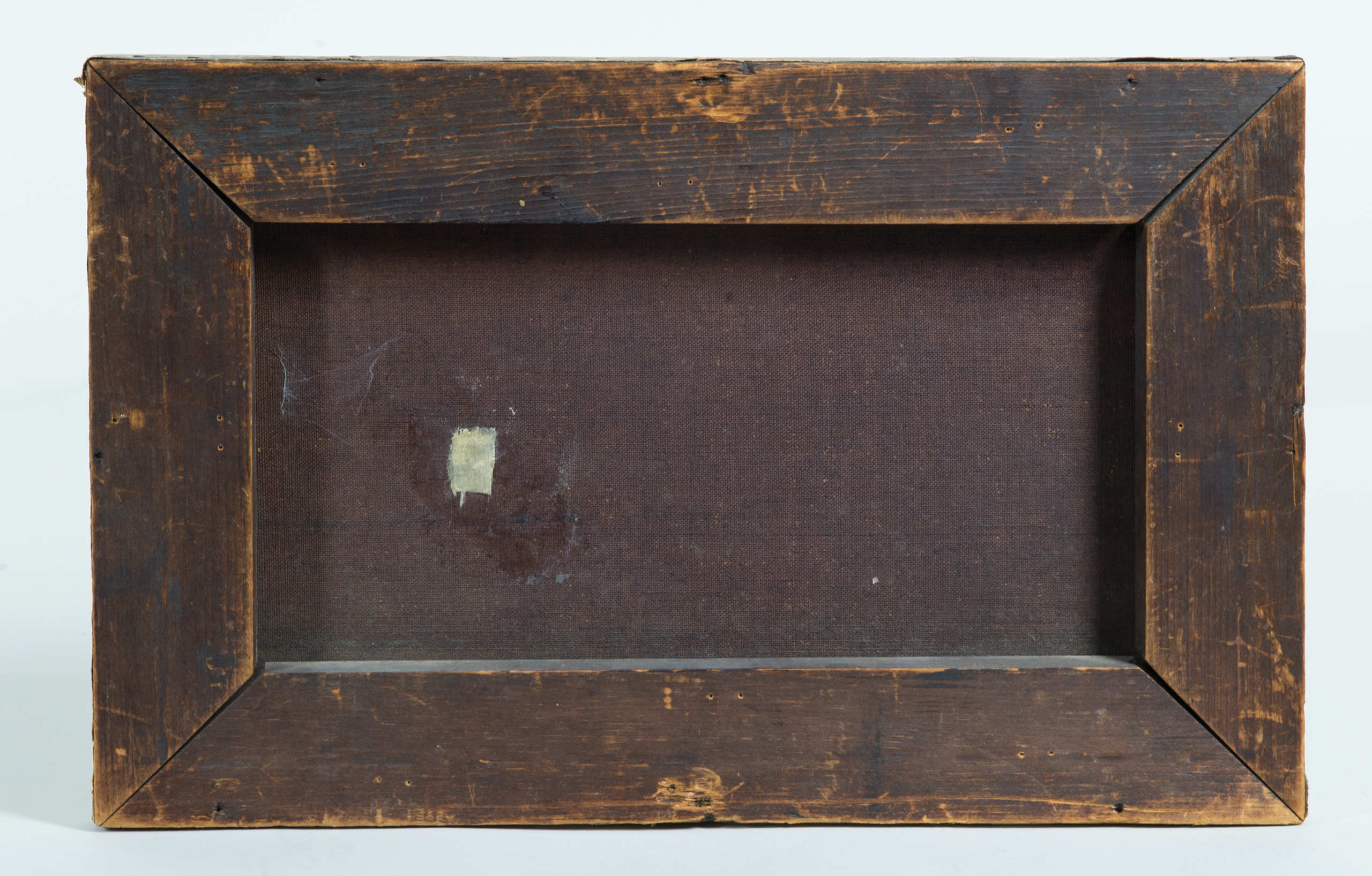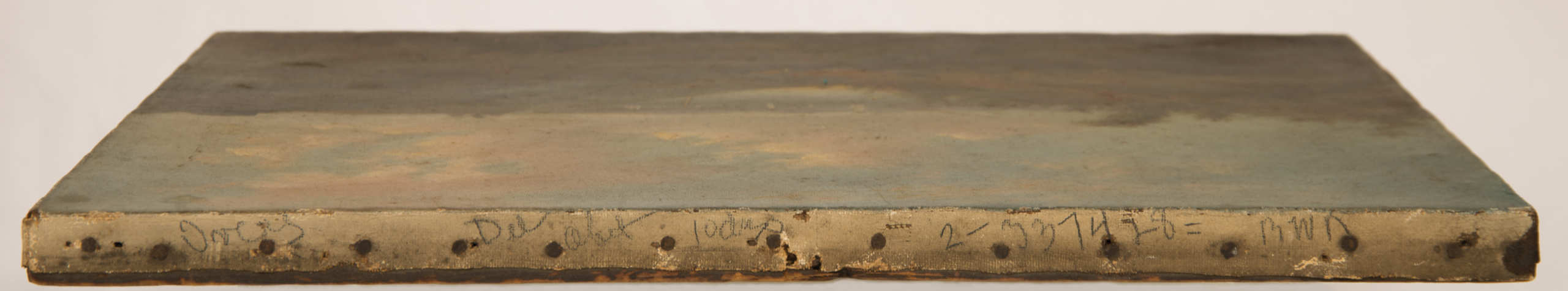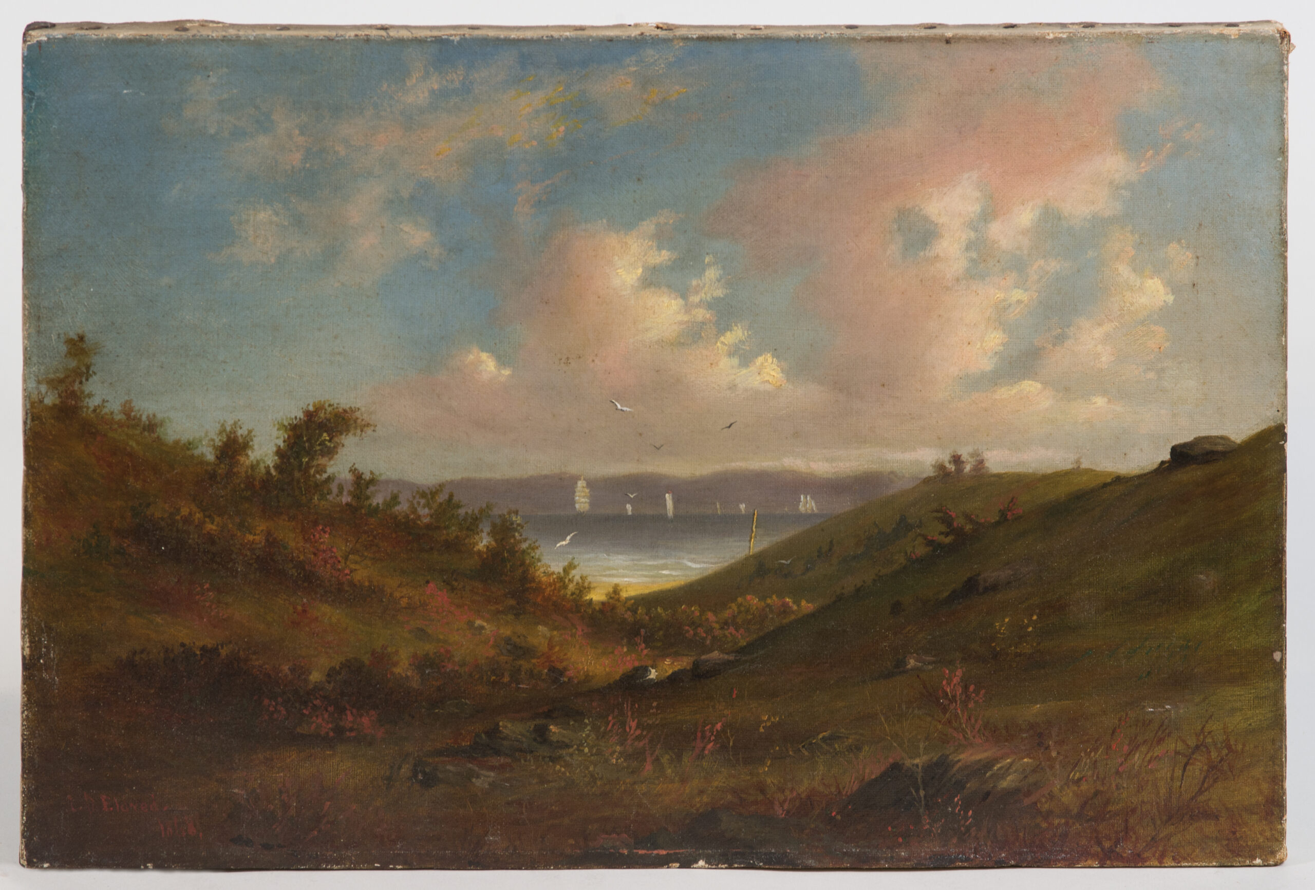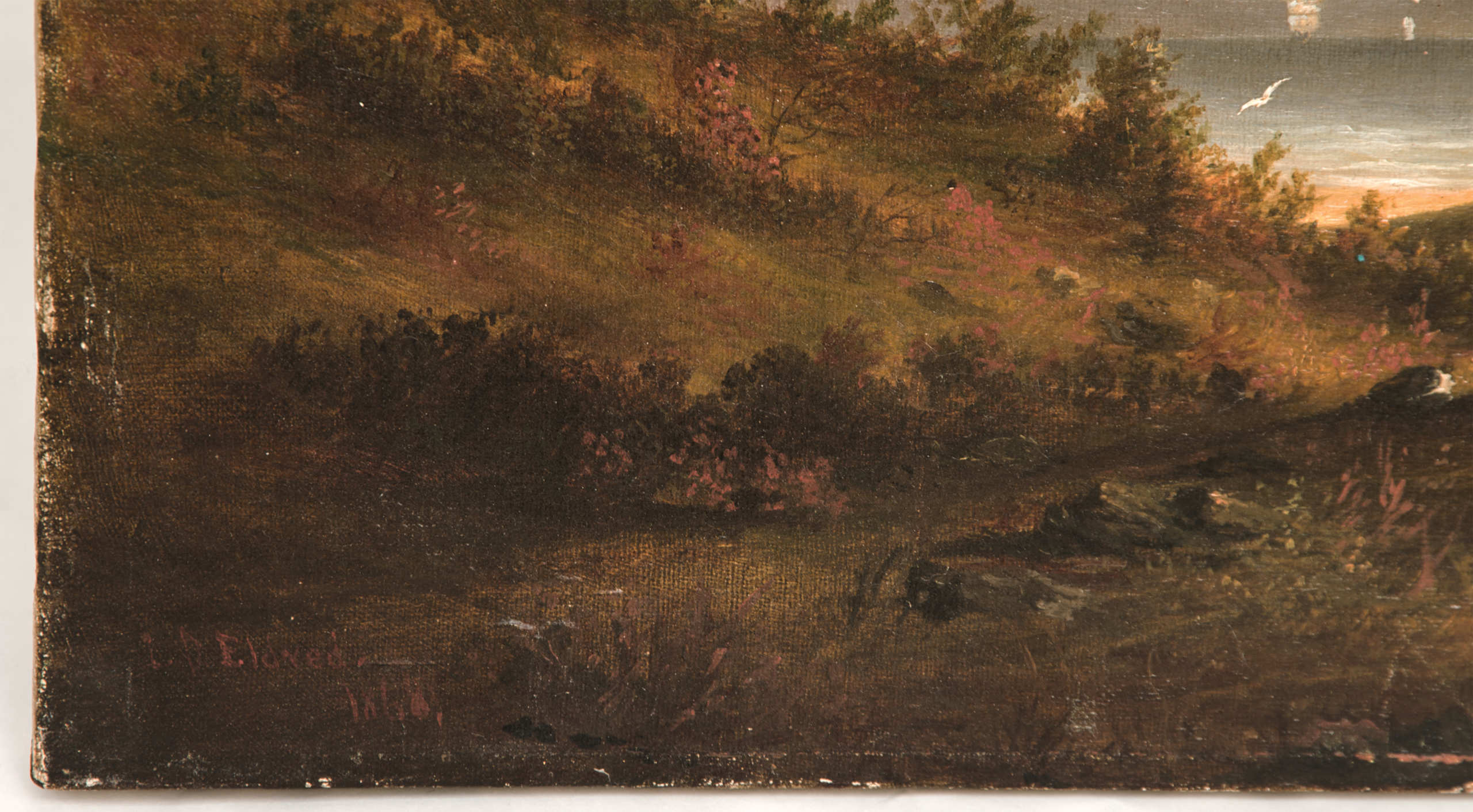 Oil on canvas of sunset pink clouds over sailboats in a harbor, fall plants and floral background, signed l.l. in red “L.D. Eldred. 1868.”, (American, Lemuel D. Eldred, 1848-1921), pencil inscription on top edge, small old repair shows on back left center of canvas, sans frame, 10″ x 15 1/2″, (ex. Ernie Sattler estate).