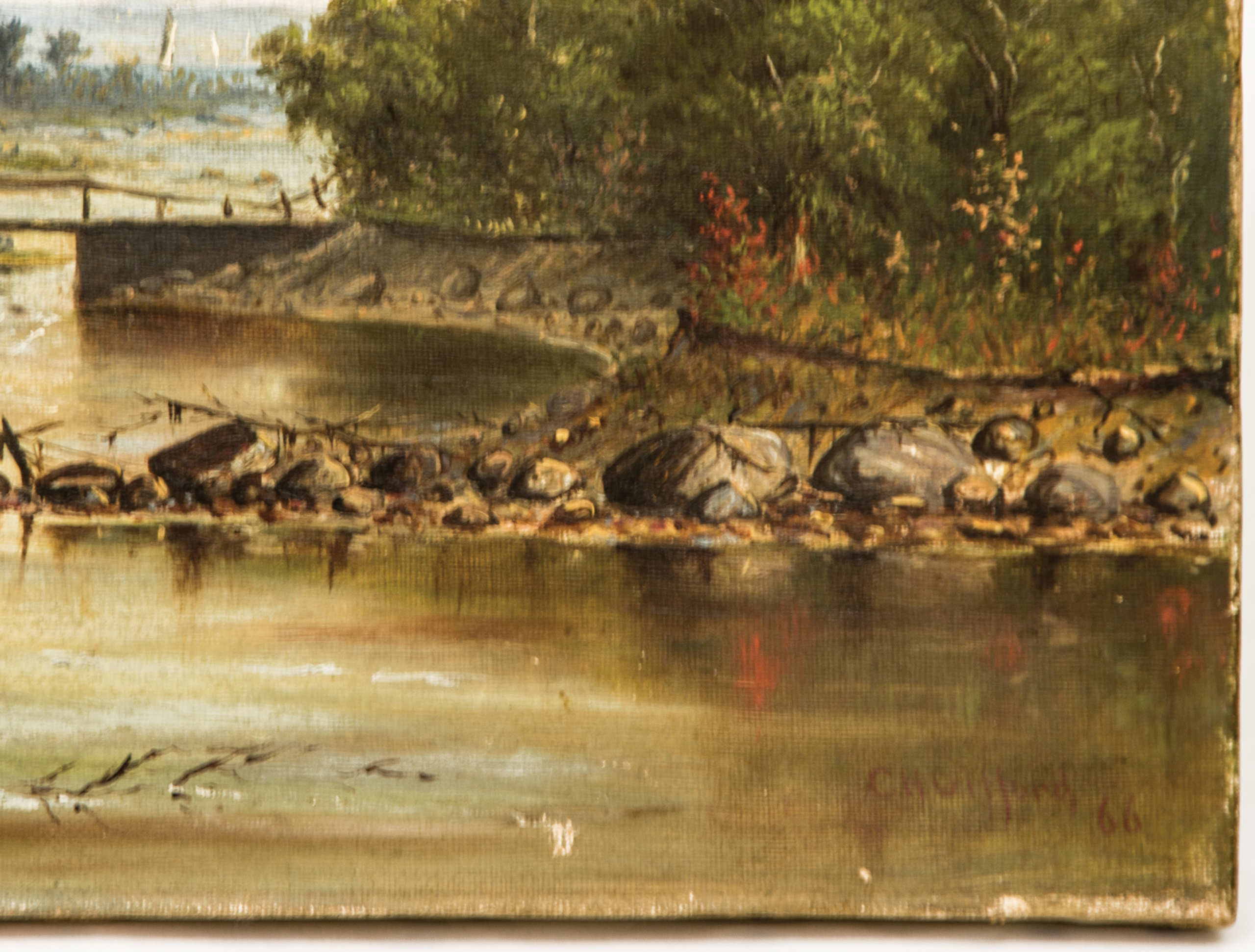 Oil on canvas, beach with inlet and small bridge, with sailboats in the distance, rocks and trees, signed l.r. in red “C.H. Gifford ’66”, (American, Charles Henry Gifford, 1839-1904), minor paint loss upper right corner, sans frame, 10″ x 14″, (ex. Ernie Sattler estate).
