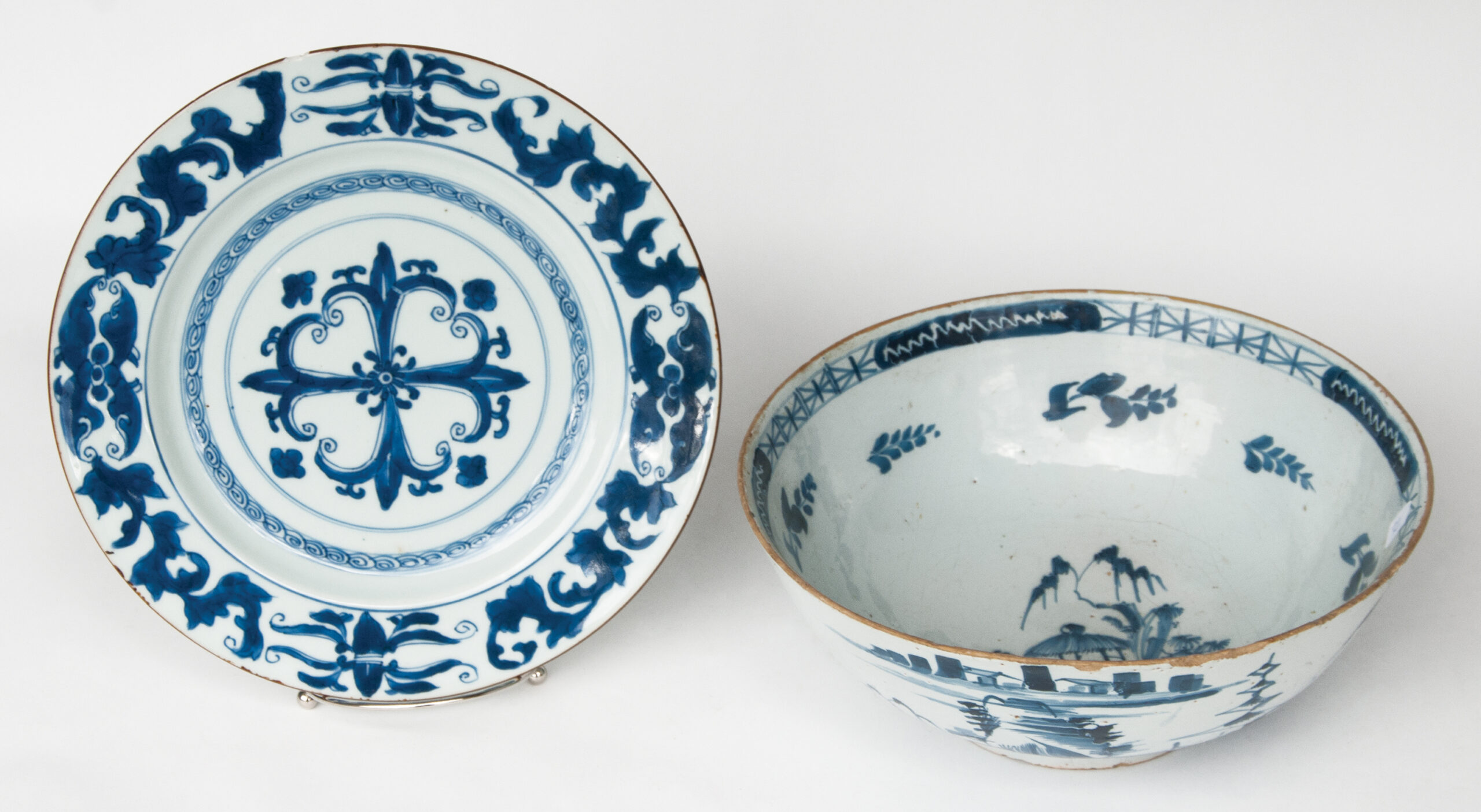 Blue and white Chinese style bowl with pagoda interior, and around outside perimeter, some roughage at rim and interior age line, 4 1/2″ h, 10 1/2″ dia; Plate with deep cobalt blue decoration, 10 1/4″ dia.