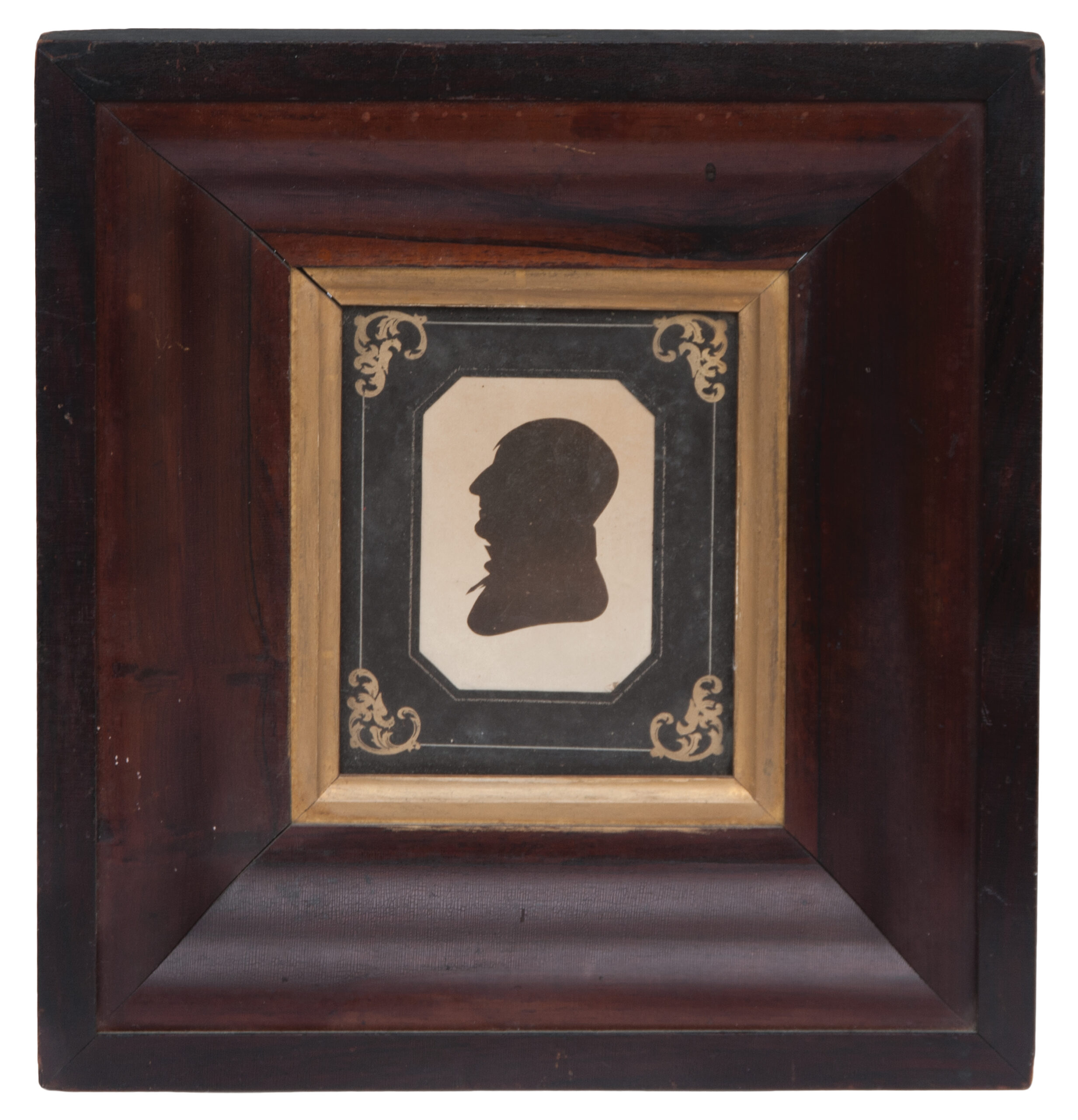 Black matte with gilded corners, rosewood large ogee frame, 5 1/2″ x 4 1/2″ (sight), 12 1/4″ x 11 1/4″ (frame).