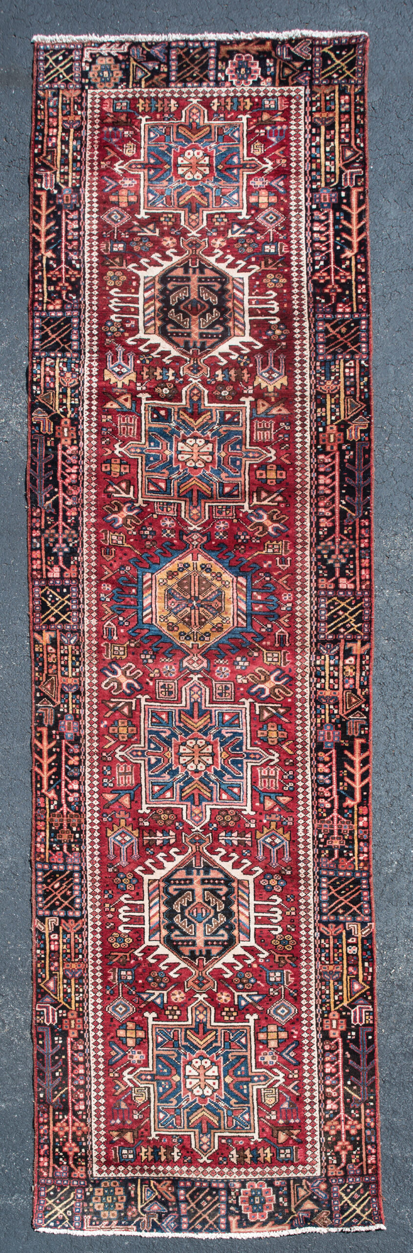 Oriental rug, red field with seven medallions in dark and light blue, yellow central medallion, 3′ 6″ x 12′ 2″.