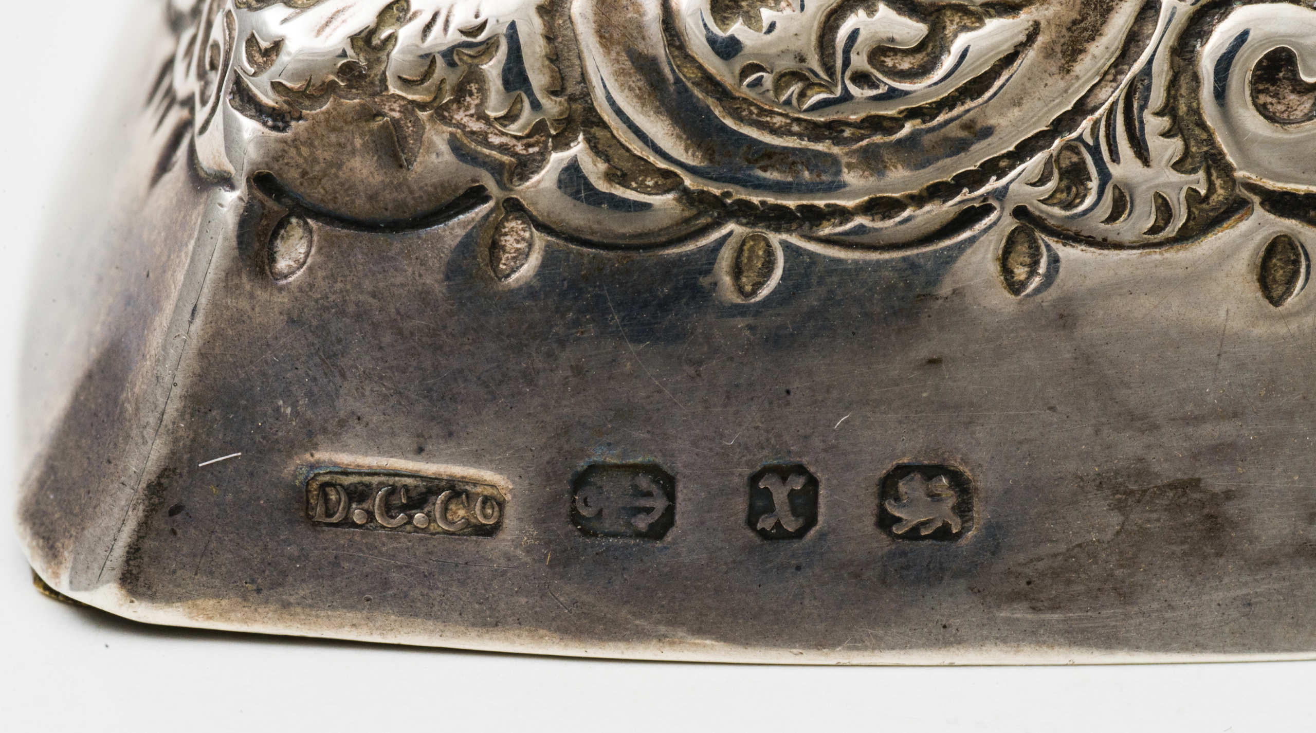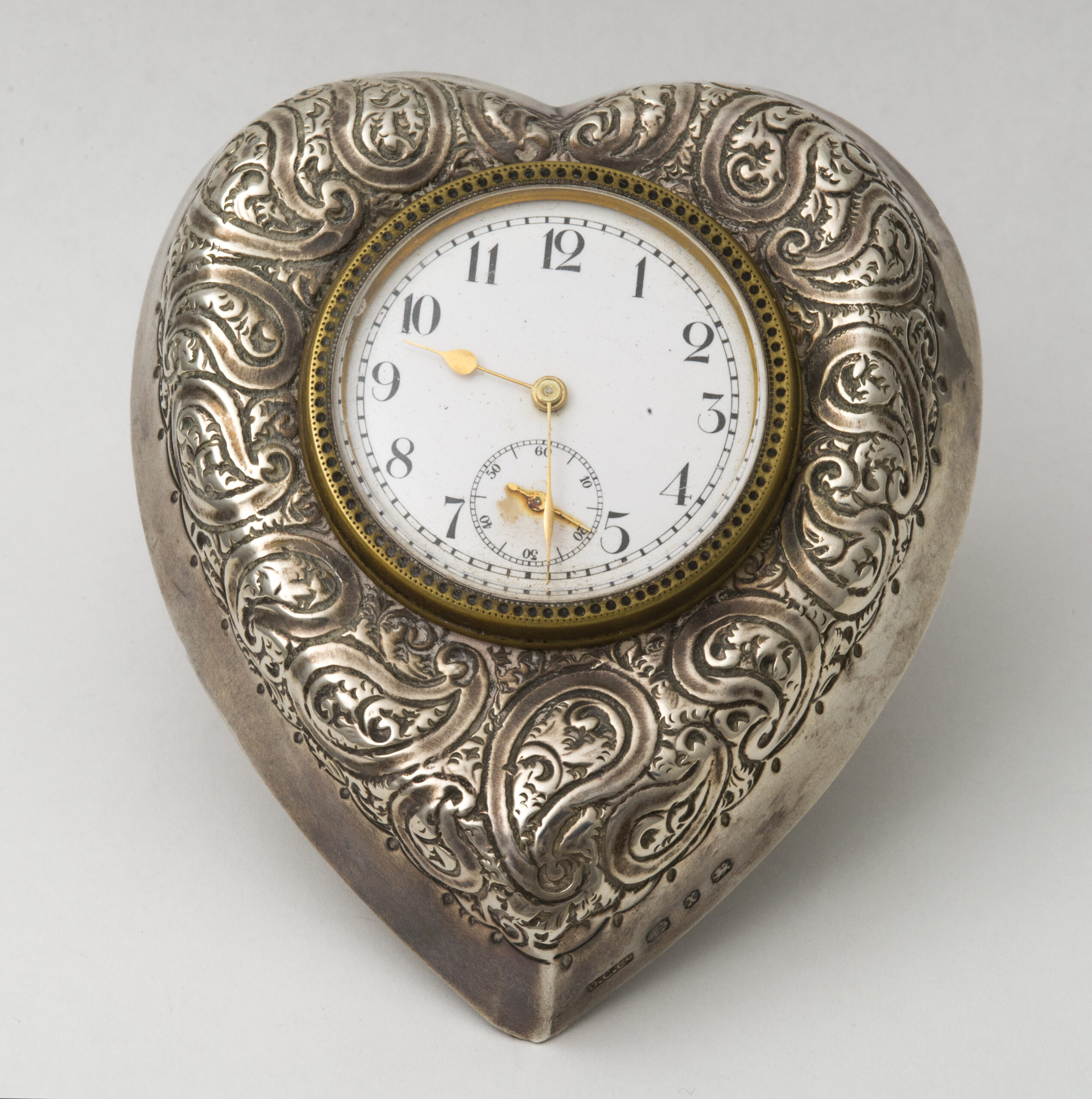 Key wind with beveled glass, hallmarked “D.C.Cr.”, with an anchor and “X”, and a rampant lion, finely engraved with arabesque design in Boteh around the face, with a stand in the back.