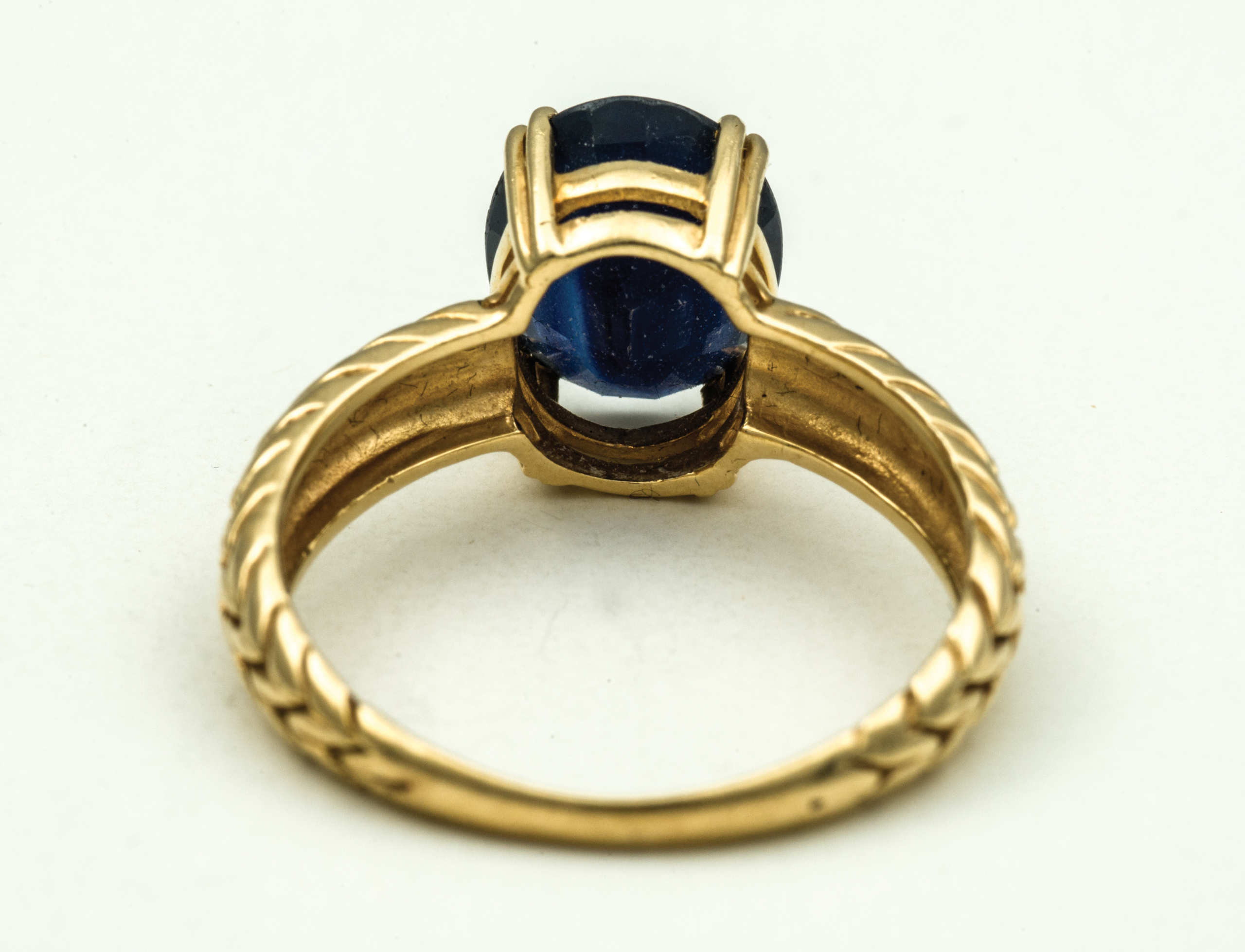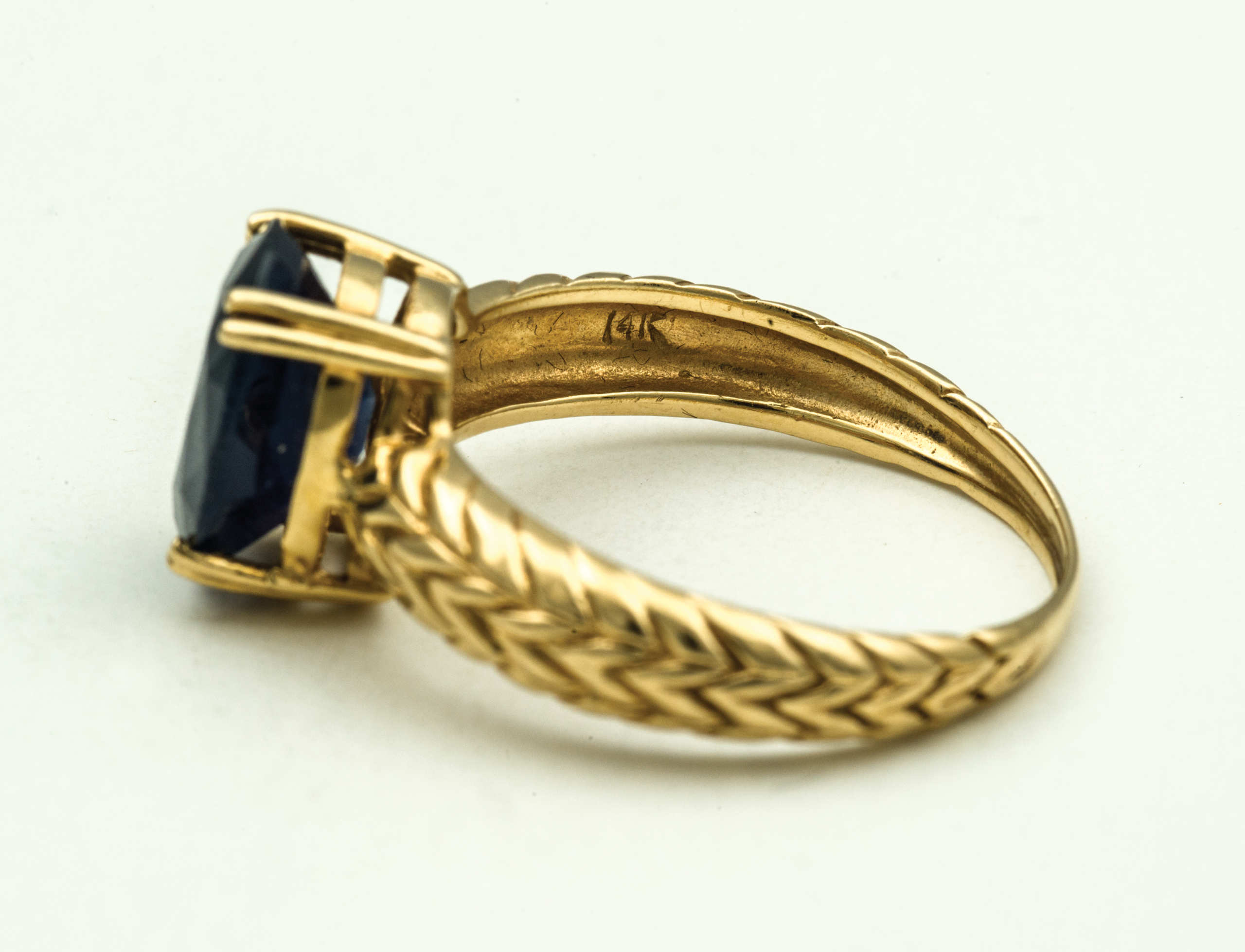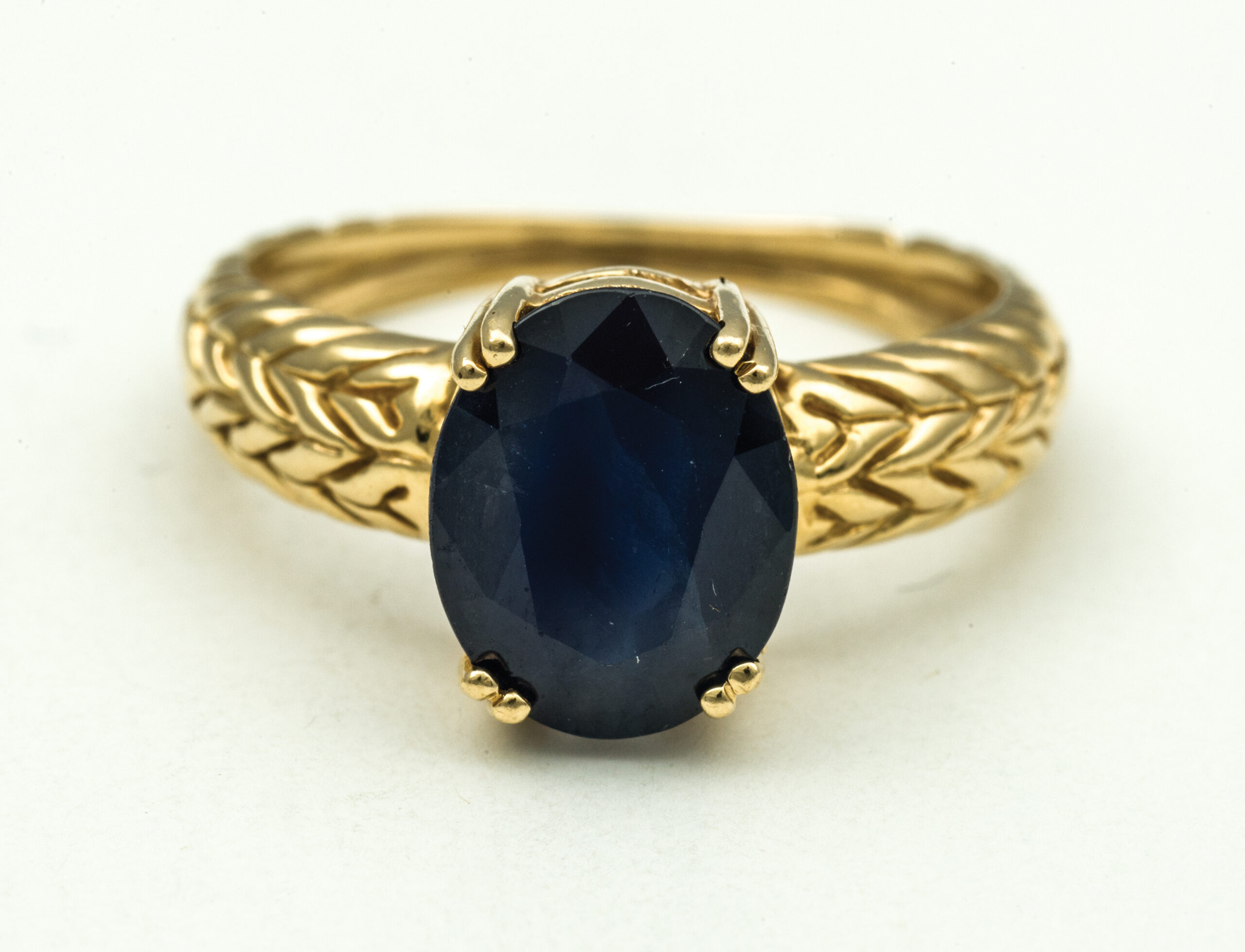 14K gold ring with dark blue sapphire, oval cut, from a Duxbury, MA estate, 10.42 x 7.94 x 5.05mm.