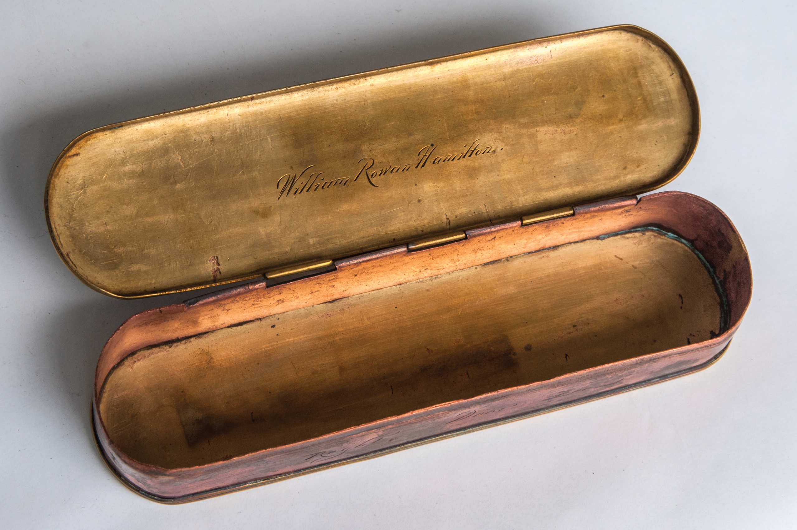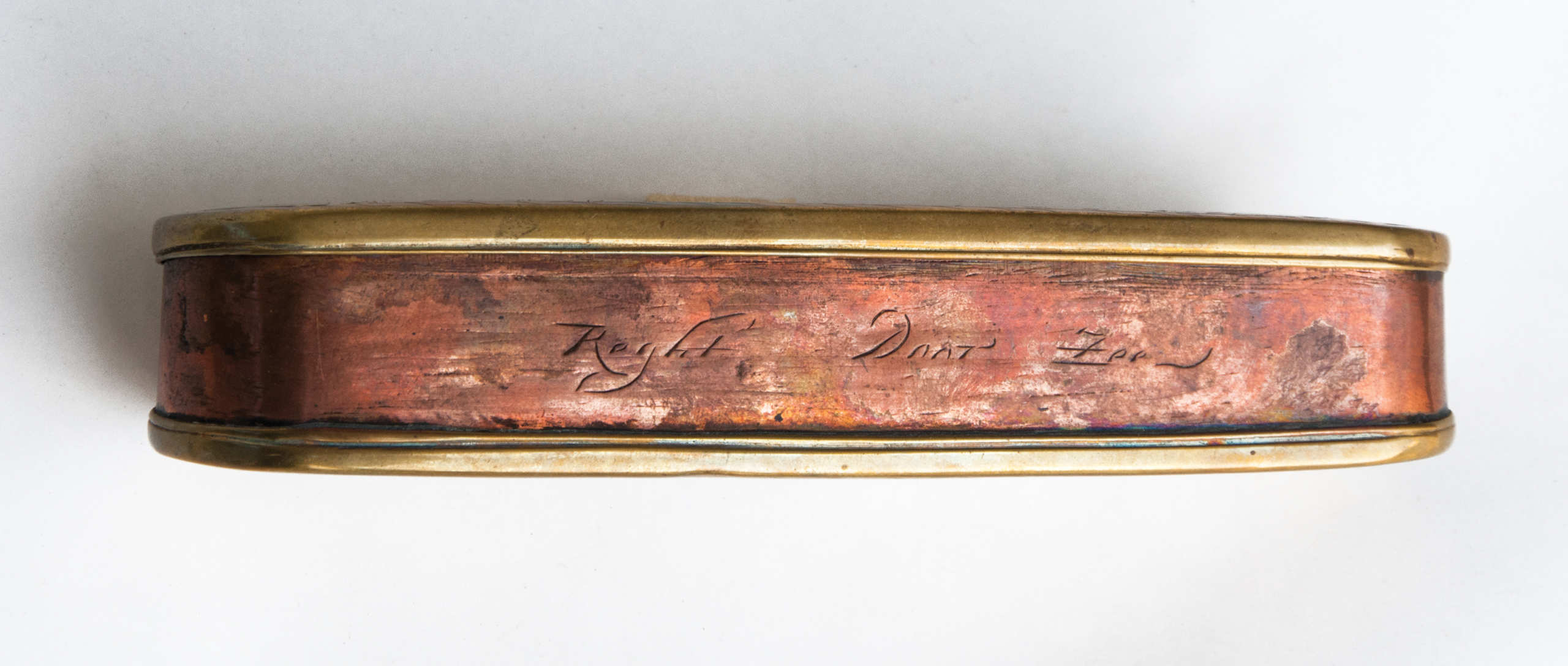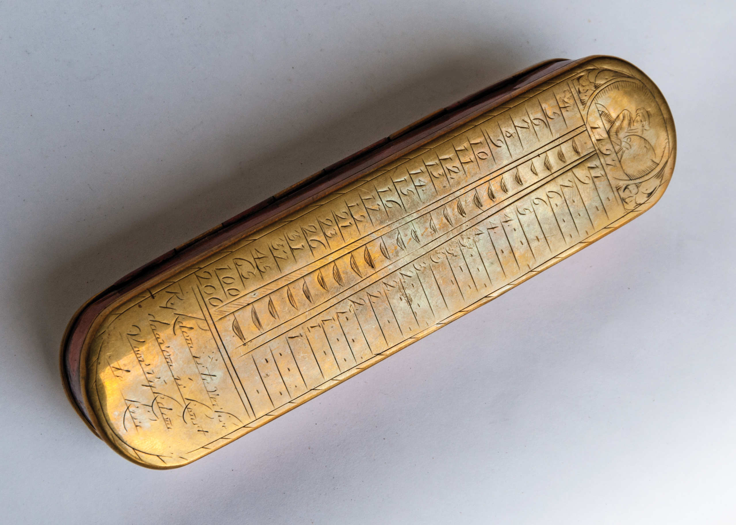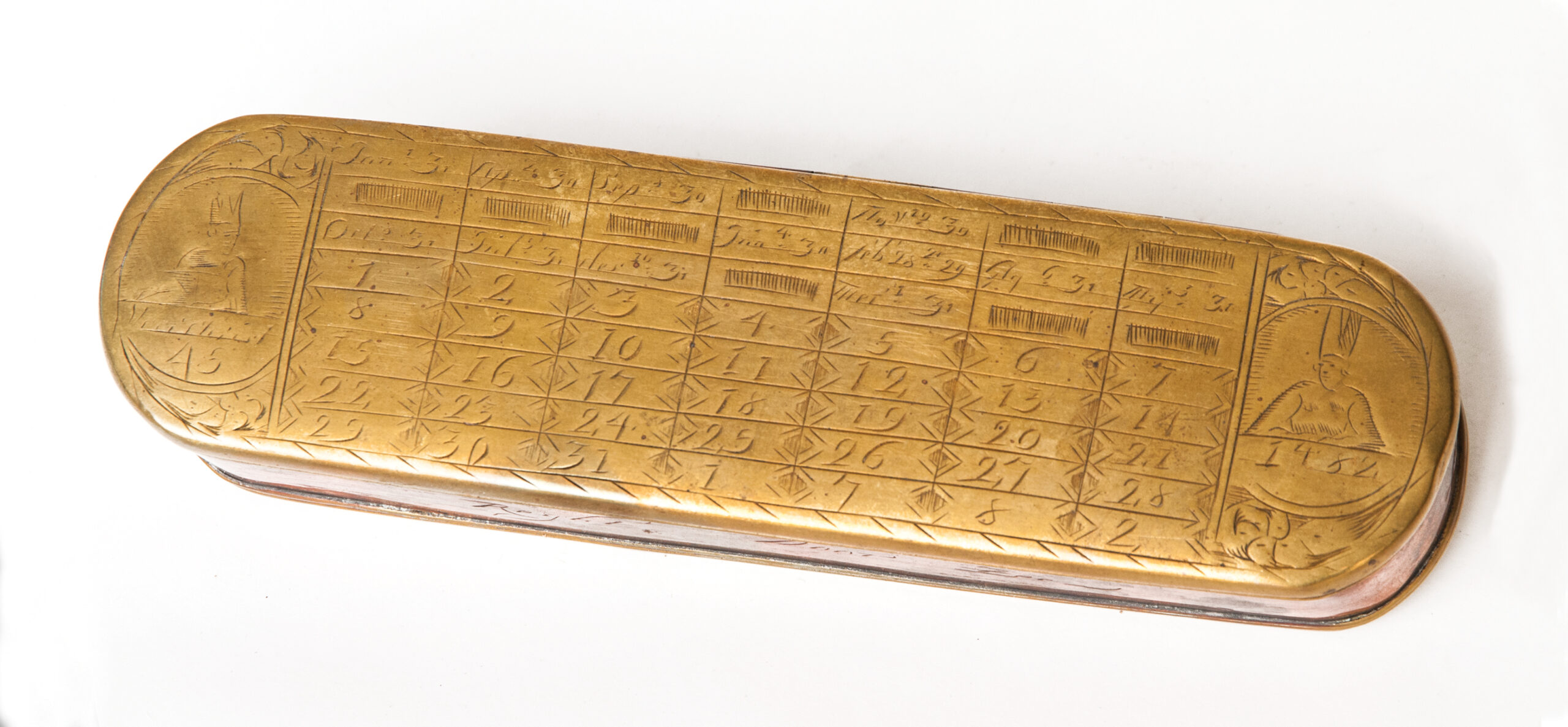 Oblong, lidded container, dated in three places “1482”, “1497” and “1782”, possibly a Dutch tobacco box, with portraits of a Pope, a Queen, and a Navigator, a numbered perpetual calendar on one side, and a numbered ladder on the opposite, an owner’s name on paper on the inside “Peter Holm Zee Meter”, 1 3/8″ h, 7″ l.