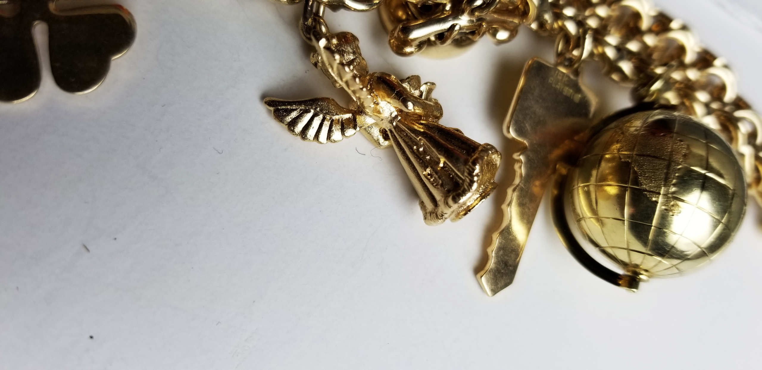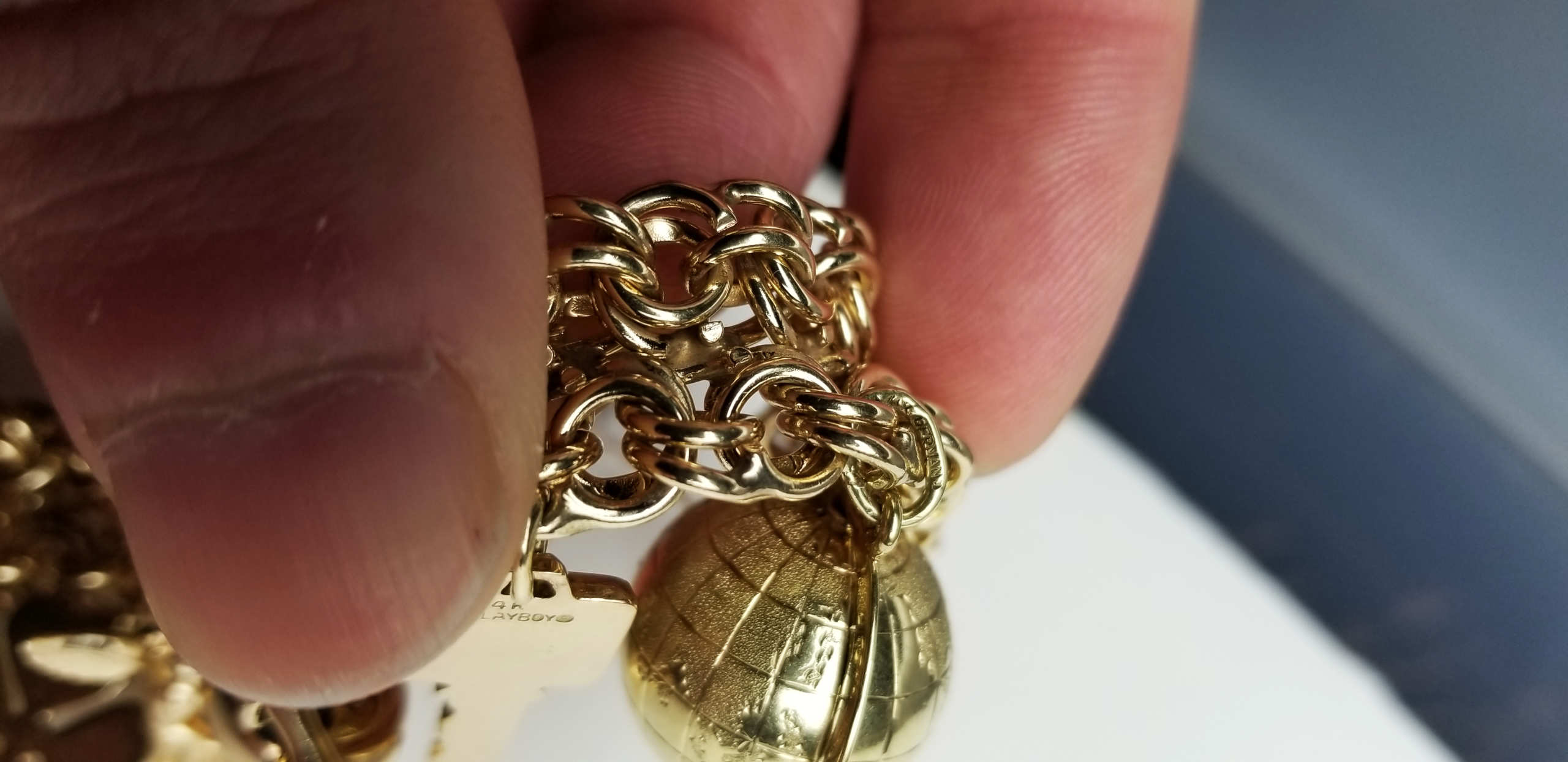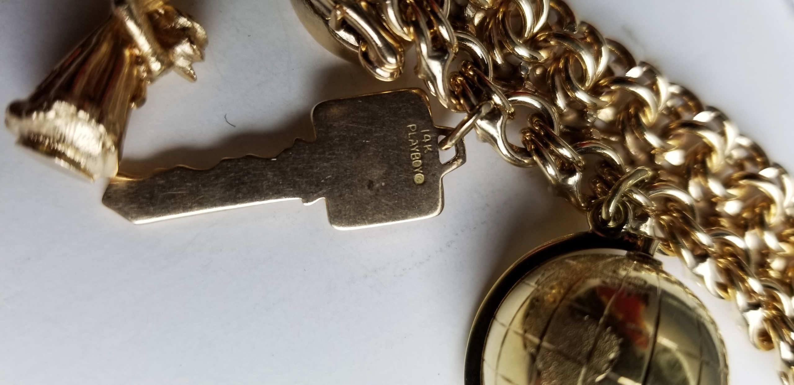 Bracelet with seven charms: globe, “Playboy Bunny” key, dial telephone, angel “June”, four-leaf clover “13”, San Francisco trolley car “Powell & Hyde”, and American flag, 7 3/4″ l, 85.23 G Total Wt, 2.609 oz t, 54.80 DWT.