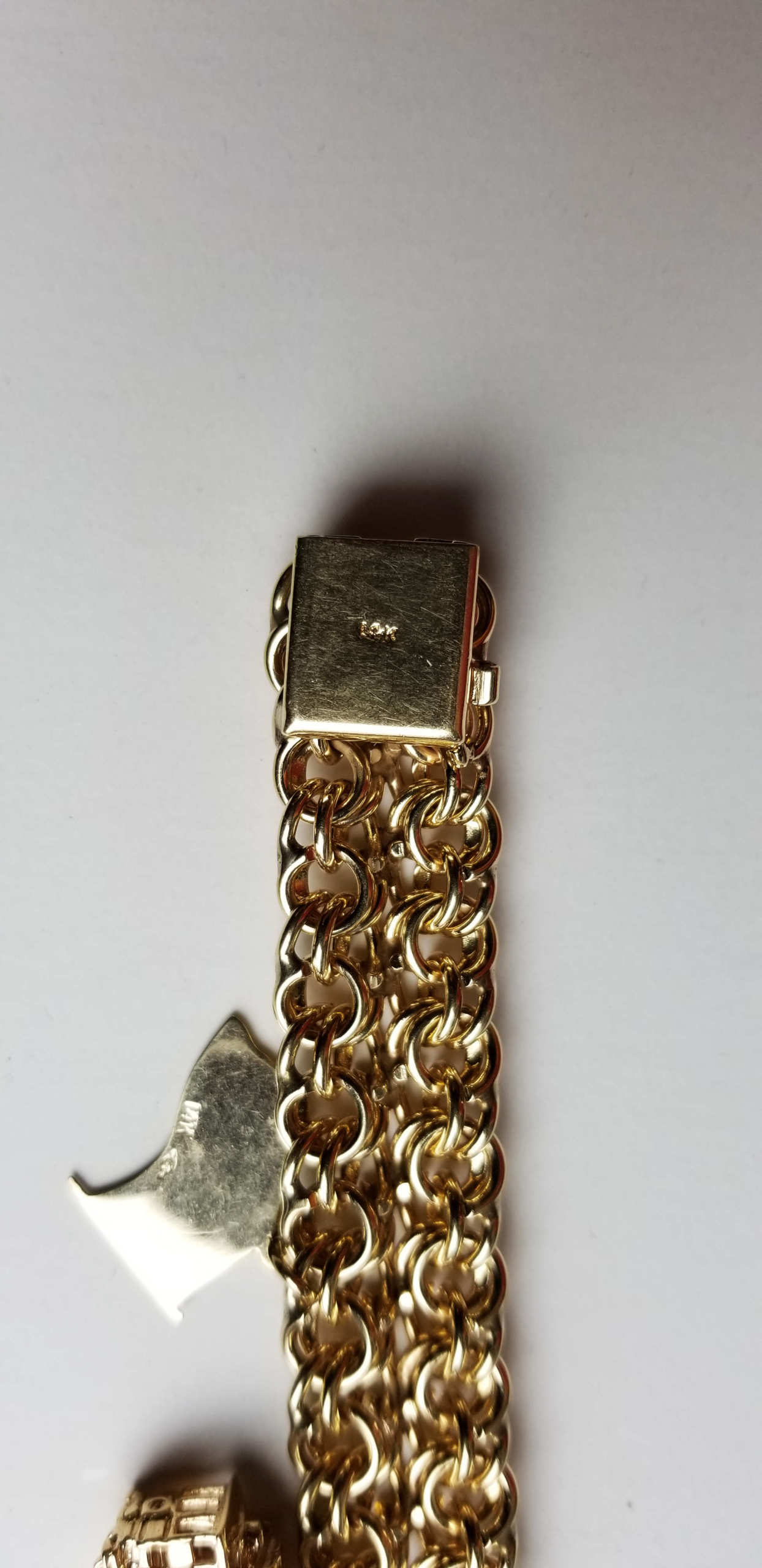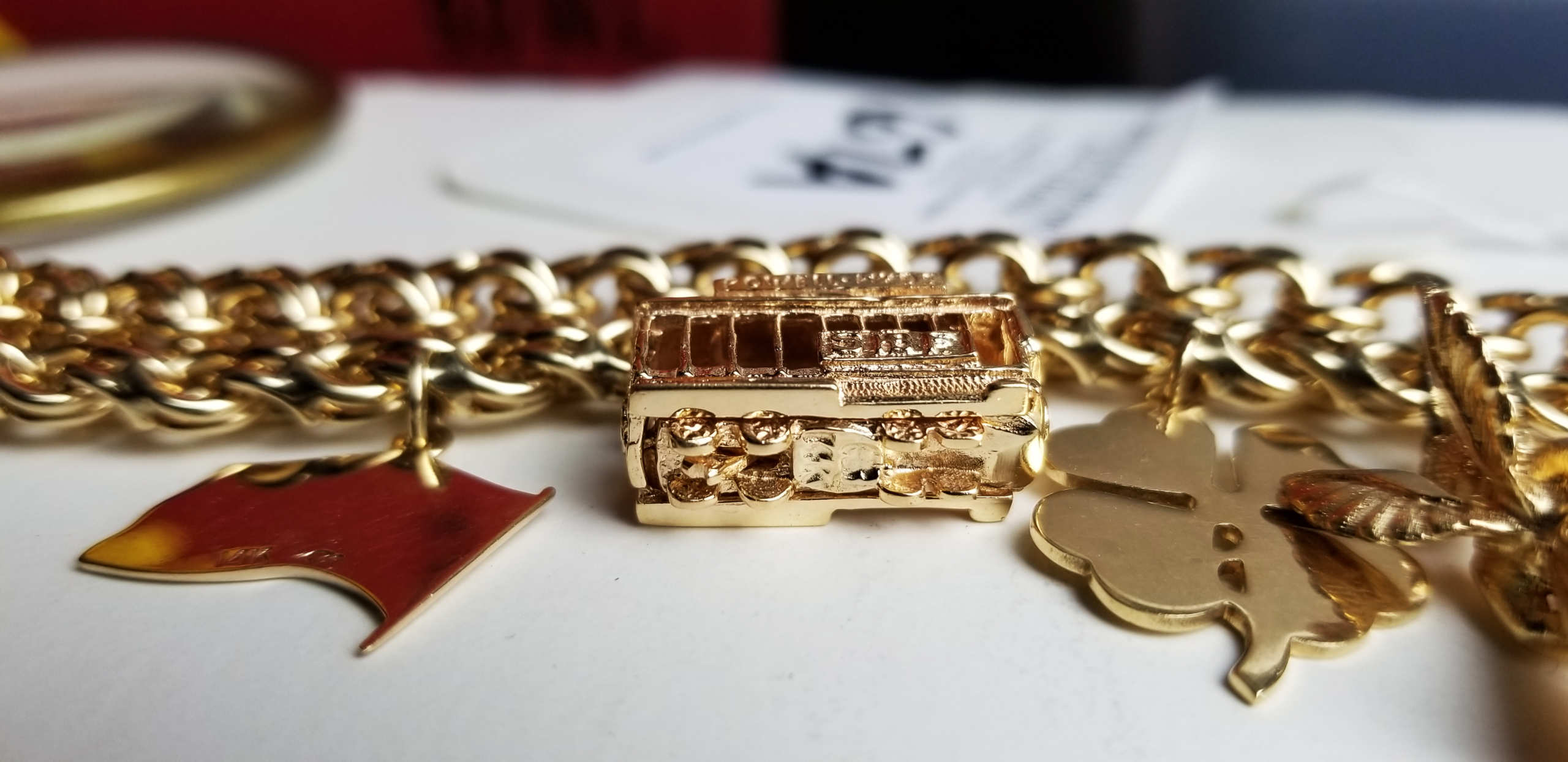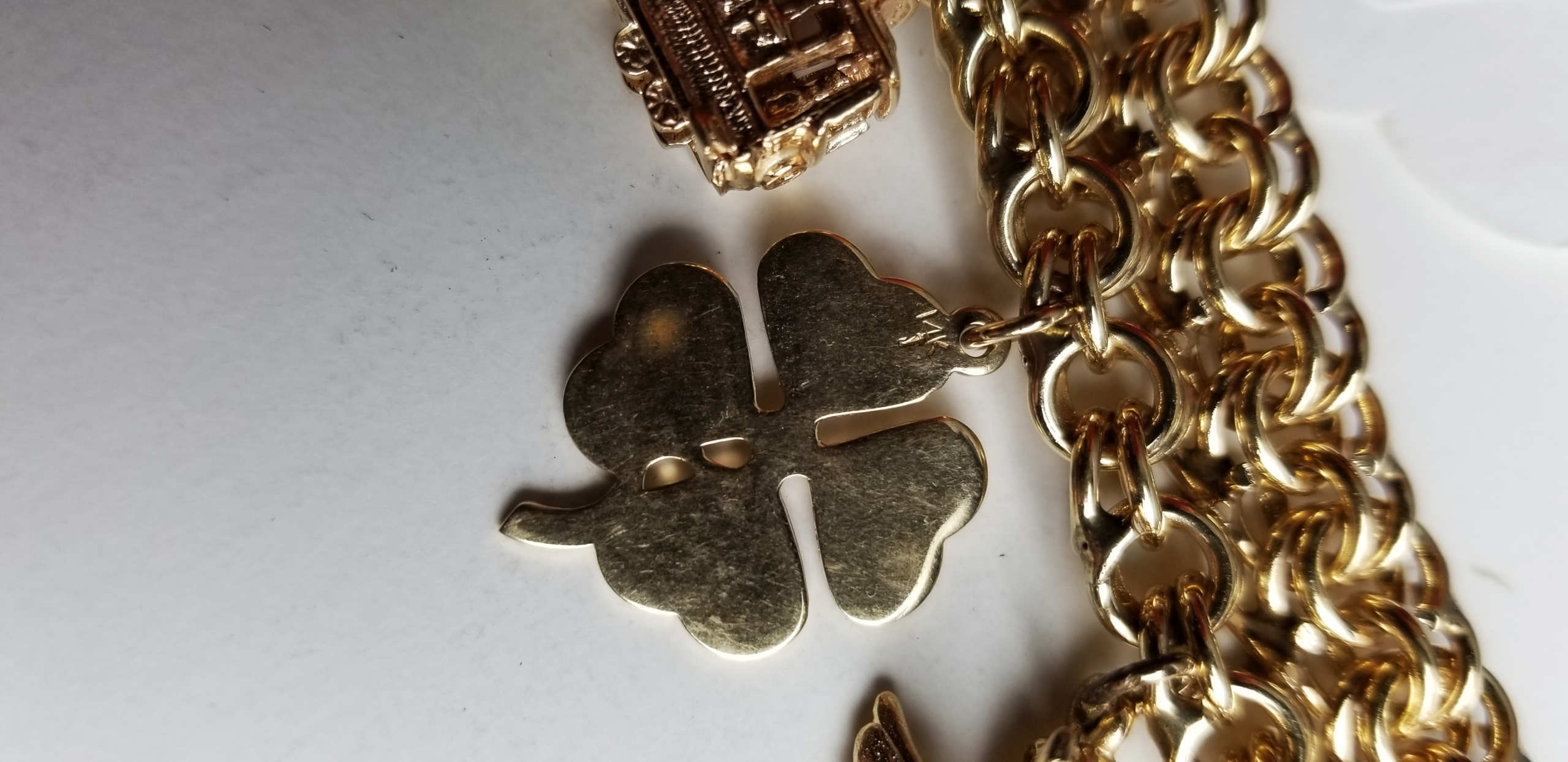 Bracelet with seven charms: globe, “Playboy Bunny” key, dial telephone, angel “June”, four-leaf clover “13”, San Francisco trolley car “Powell & Hyde”, and American flag, 7 3/4″ l, 85.23 G Total Wt, 2.609 oz t, 54.80 DWT.