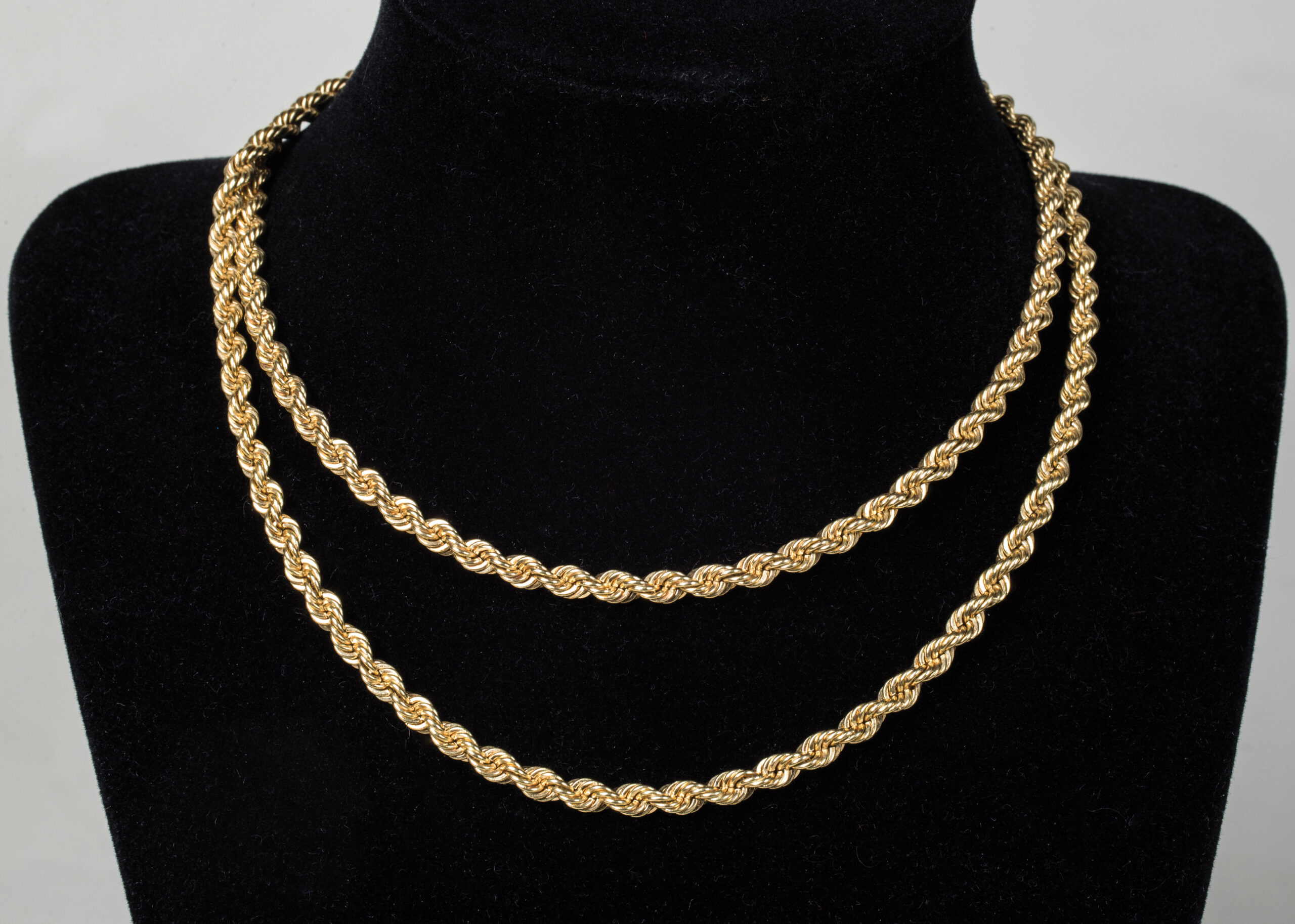 14K gold rope twist necklace, 28″ l, 41.42 G Total Wt, 1.332 oz t, 26.63 DWT.
