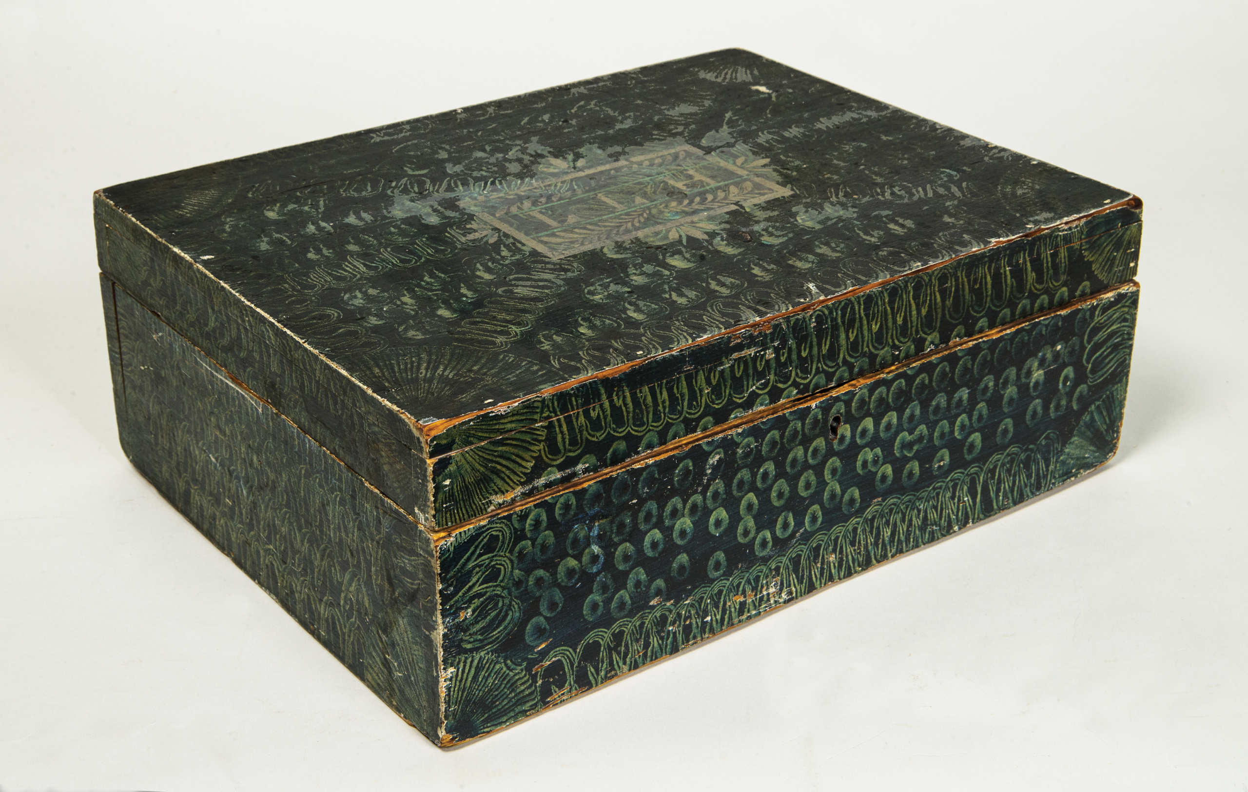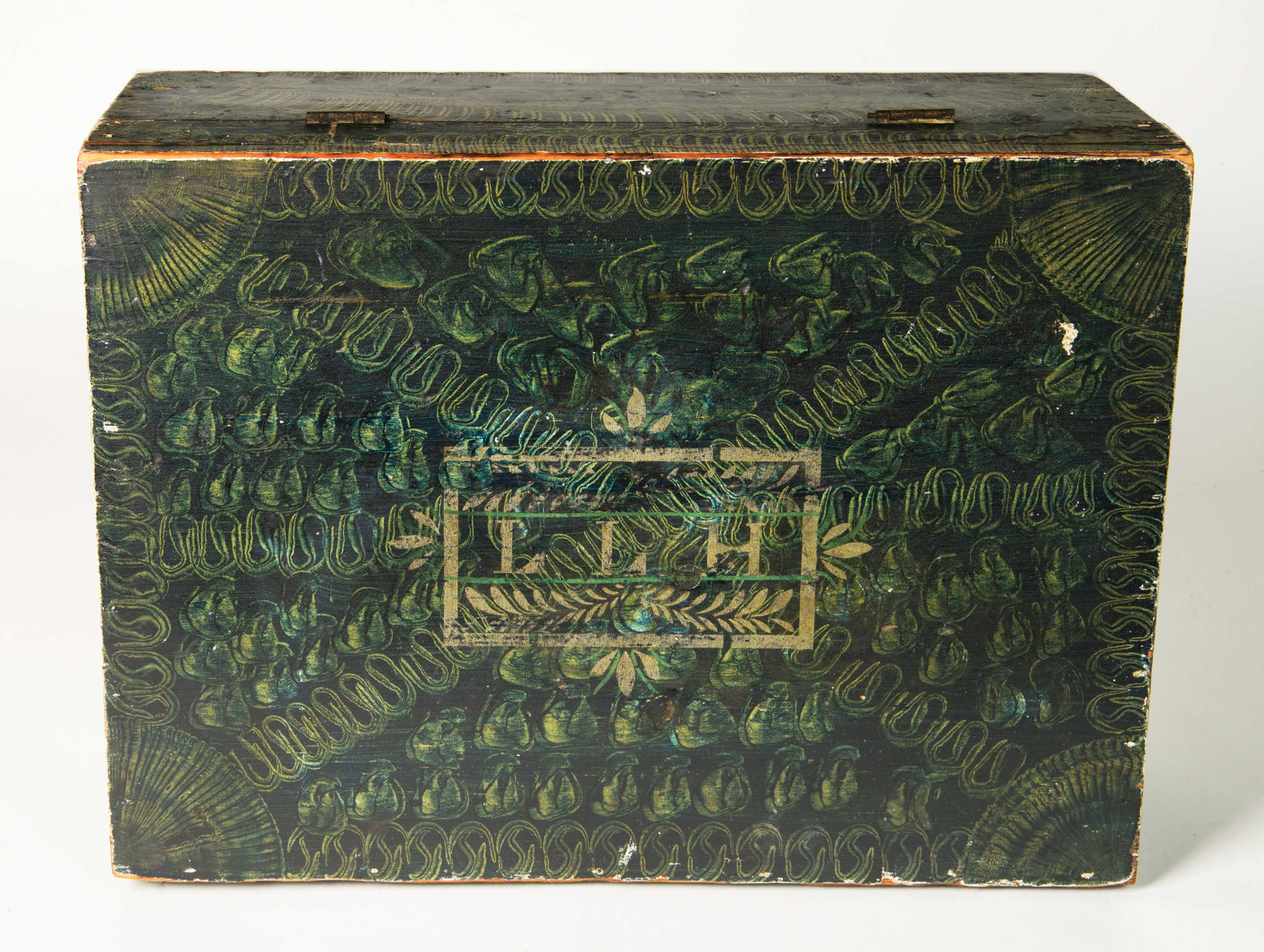Original green paint with exceptional graining, with squiggles and thumbprint, and fans in the corners, “LLH” in gold on the lid, 5″ h, 14″ l, 10 1/2″ d.
