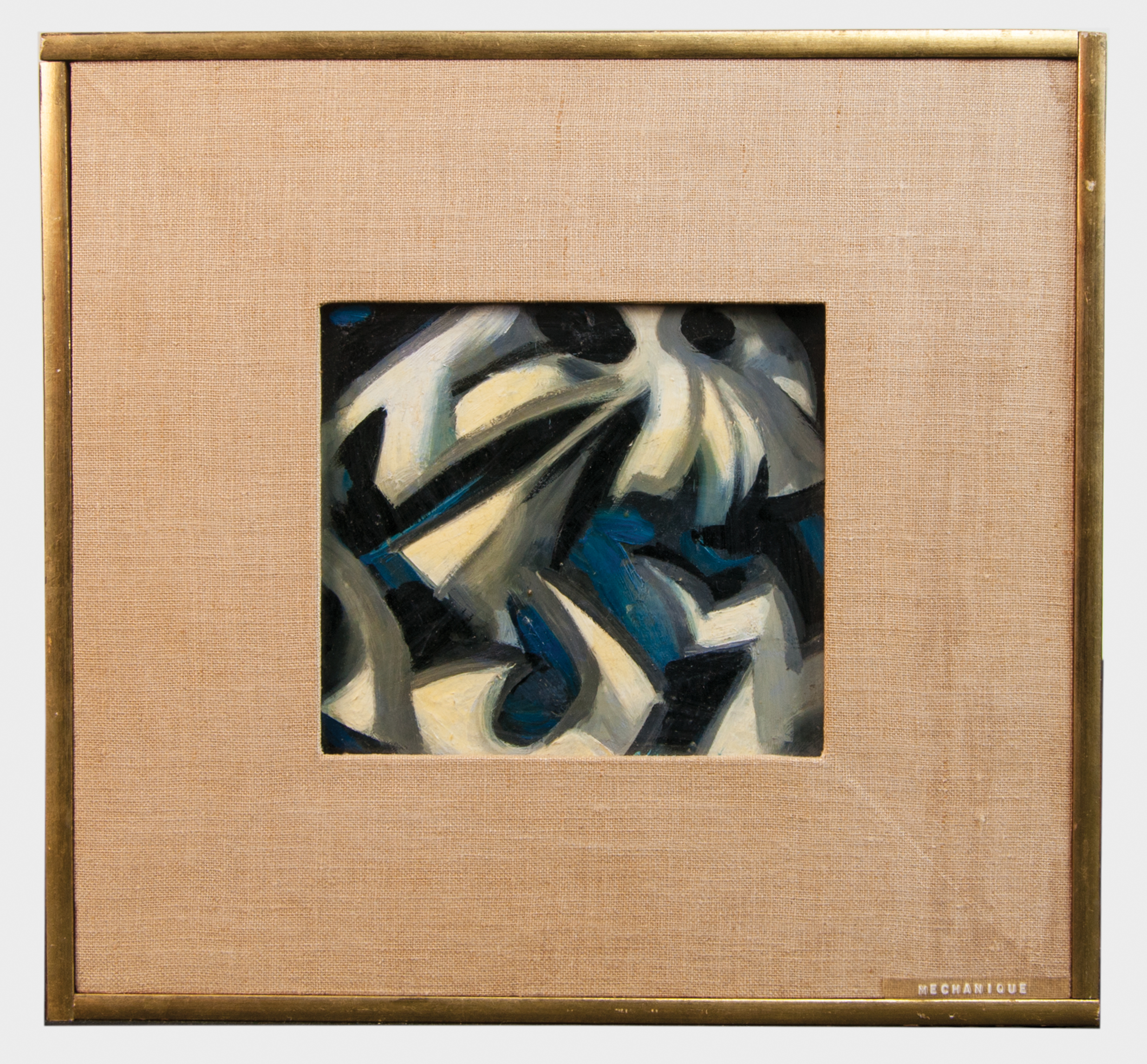 Early 20th c. oil on board, abstract painting, “Mechanique” by Alexander Geiss, framed with cloth mattes, wood frame with gilt edge, 5″ x 5 1/2″, (ex. Tony Geiss estate, NYC).
