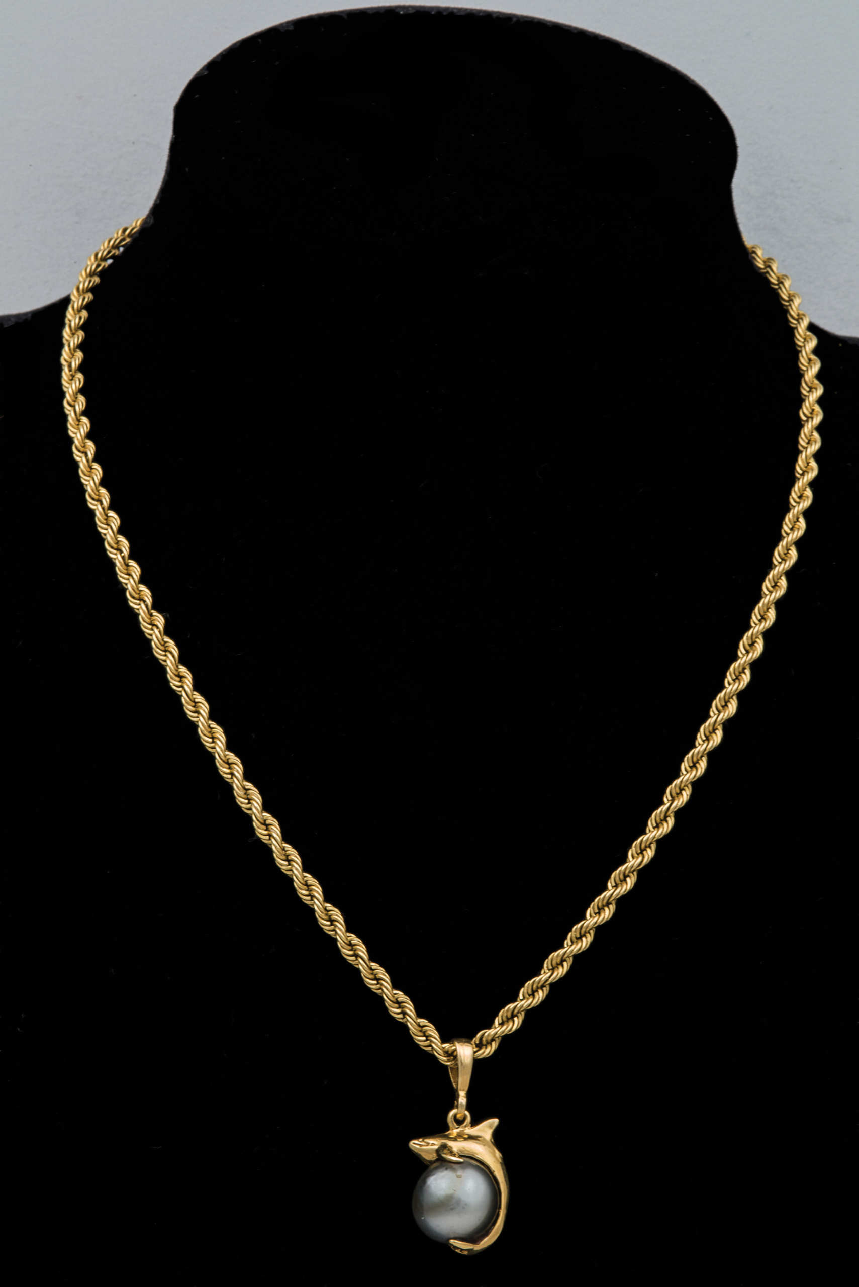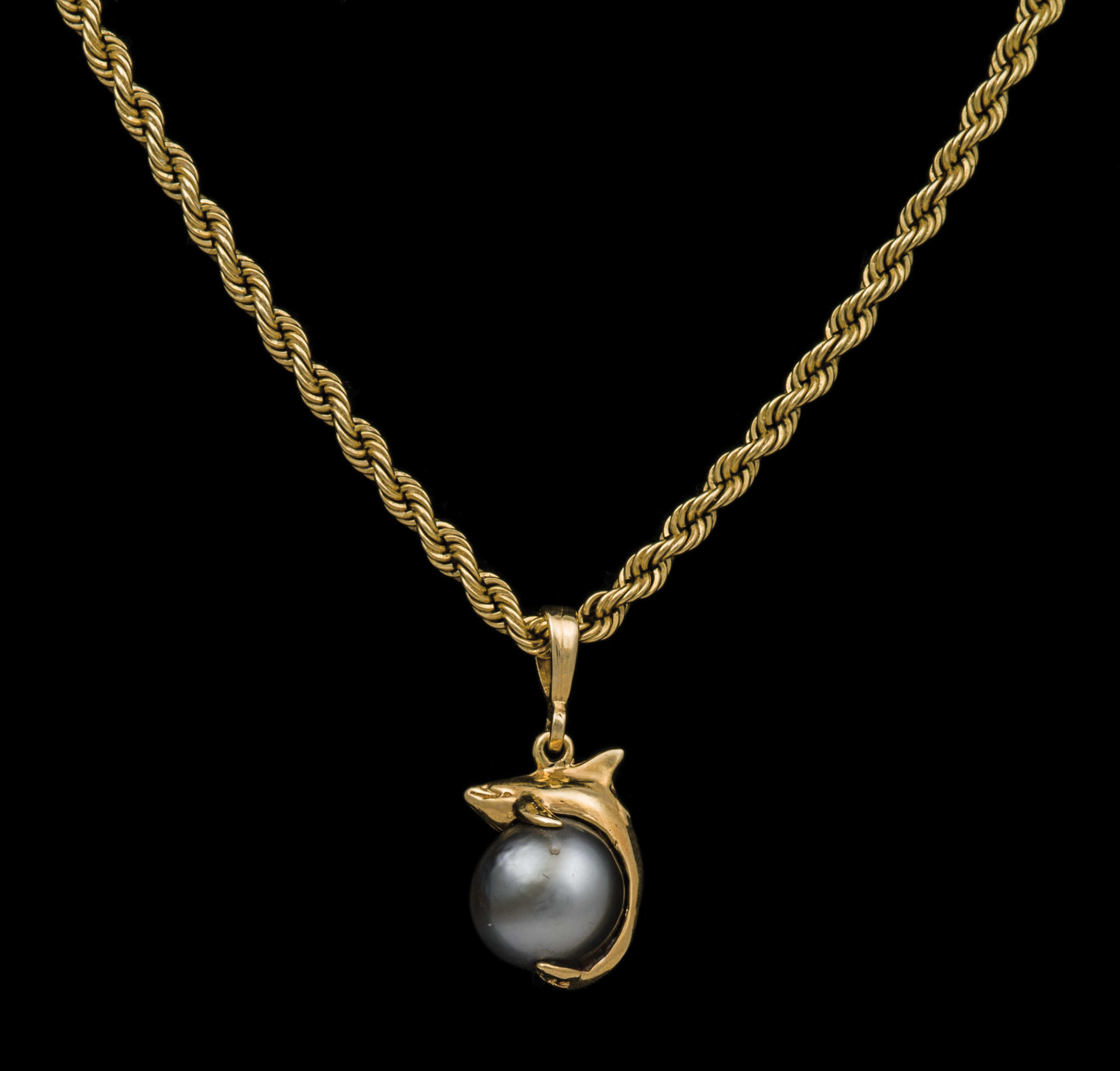 14K dolphin holding a black pearl, on a 14K twist gold chain, 15″ l, 12.05 G Total Wt chain, 7.75 DWT, 10.5mm pearl.