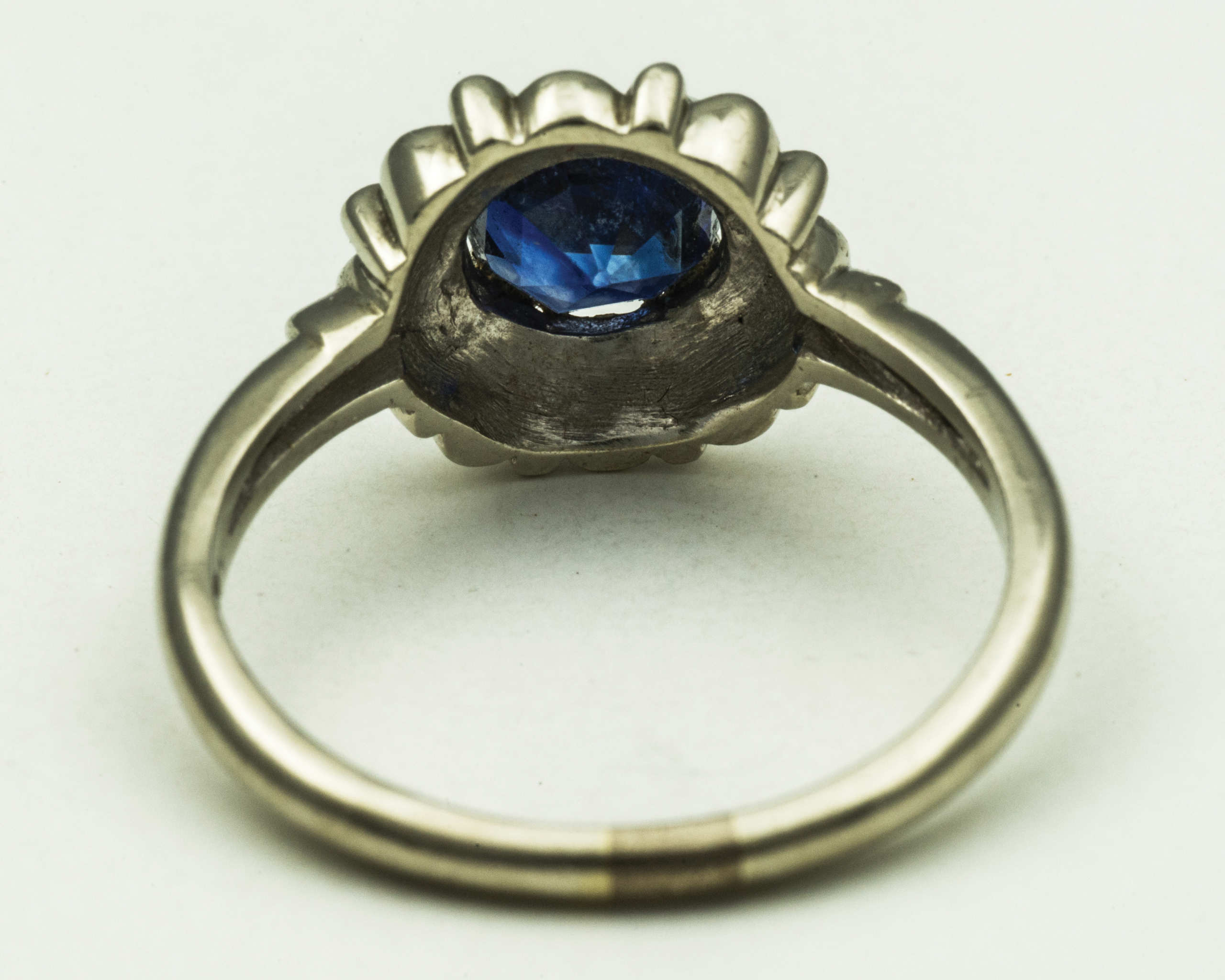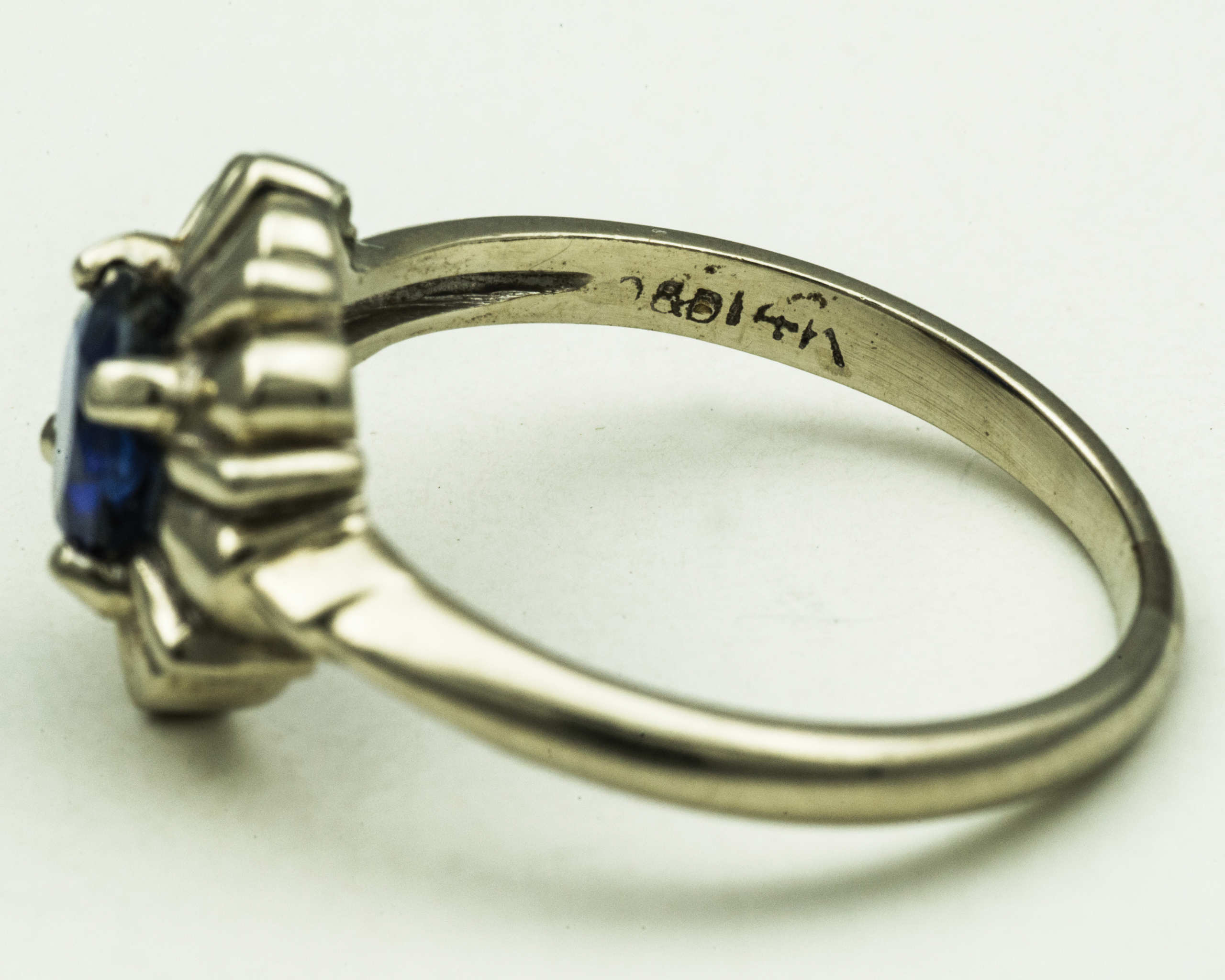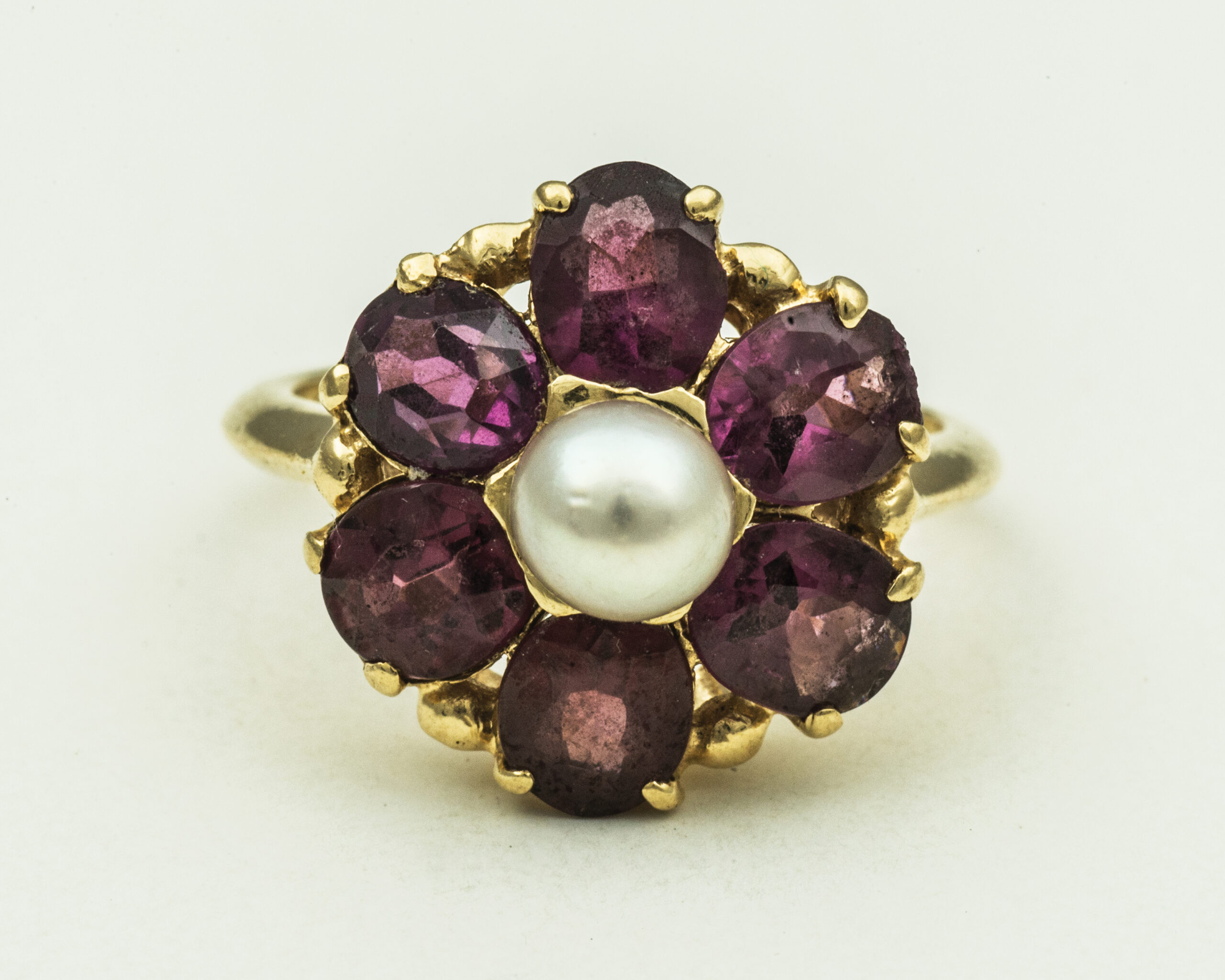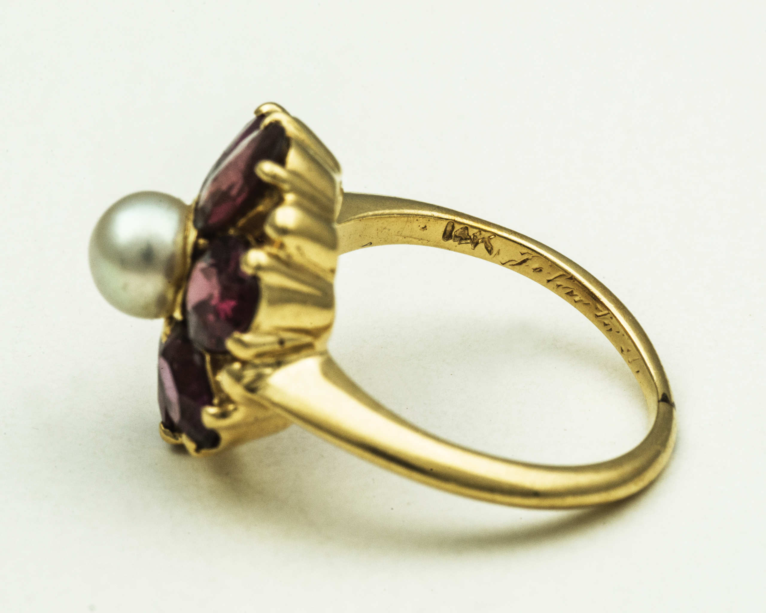 Gold ring with pearl surrounded by six garnets; Gold ring with blue round sapphire in a 14K white gold setting.