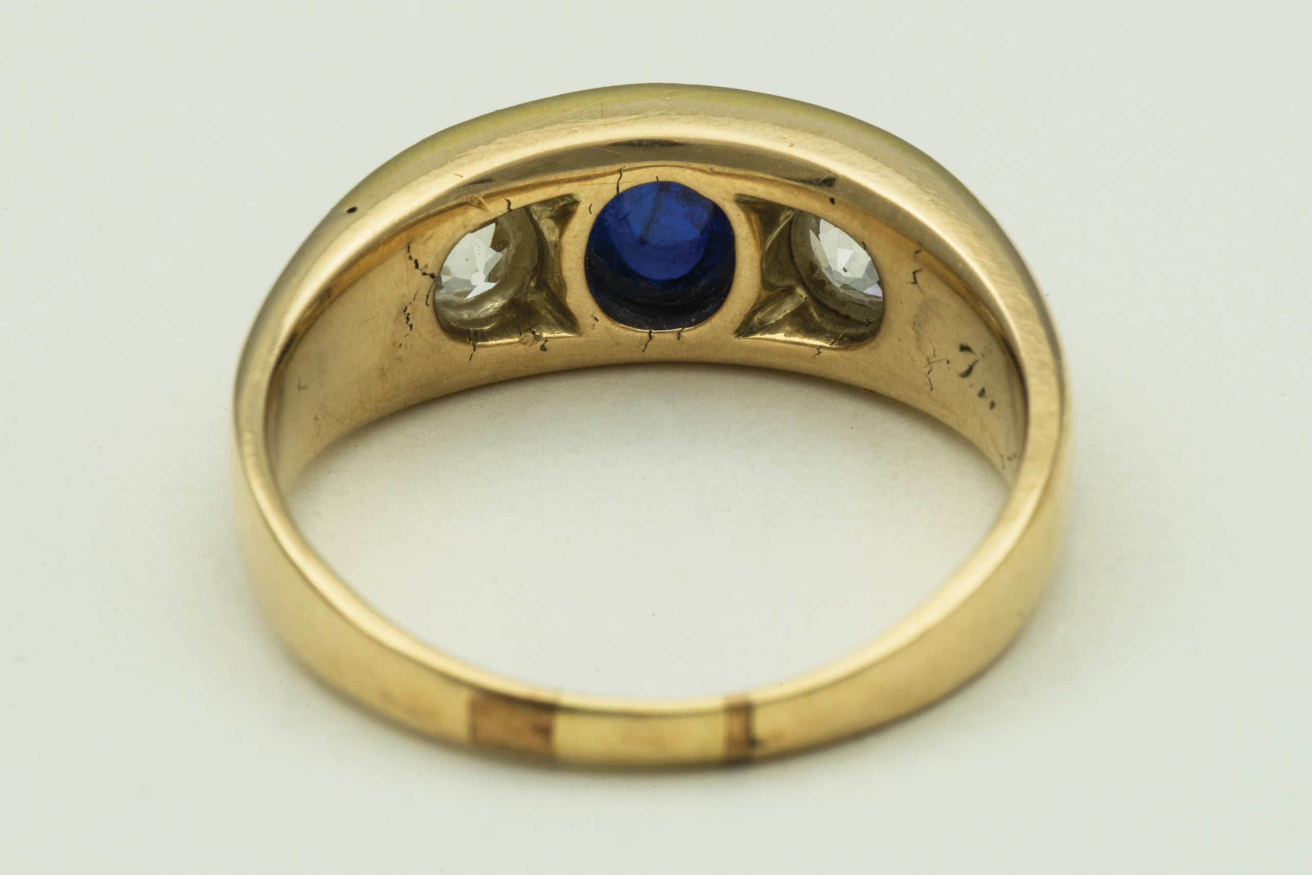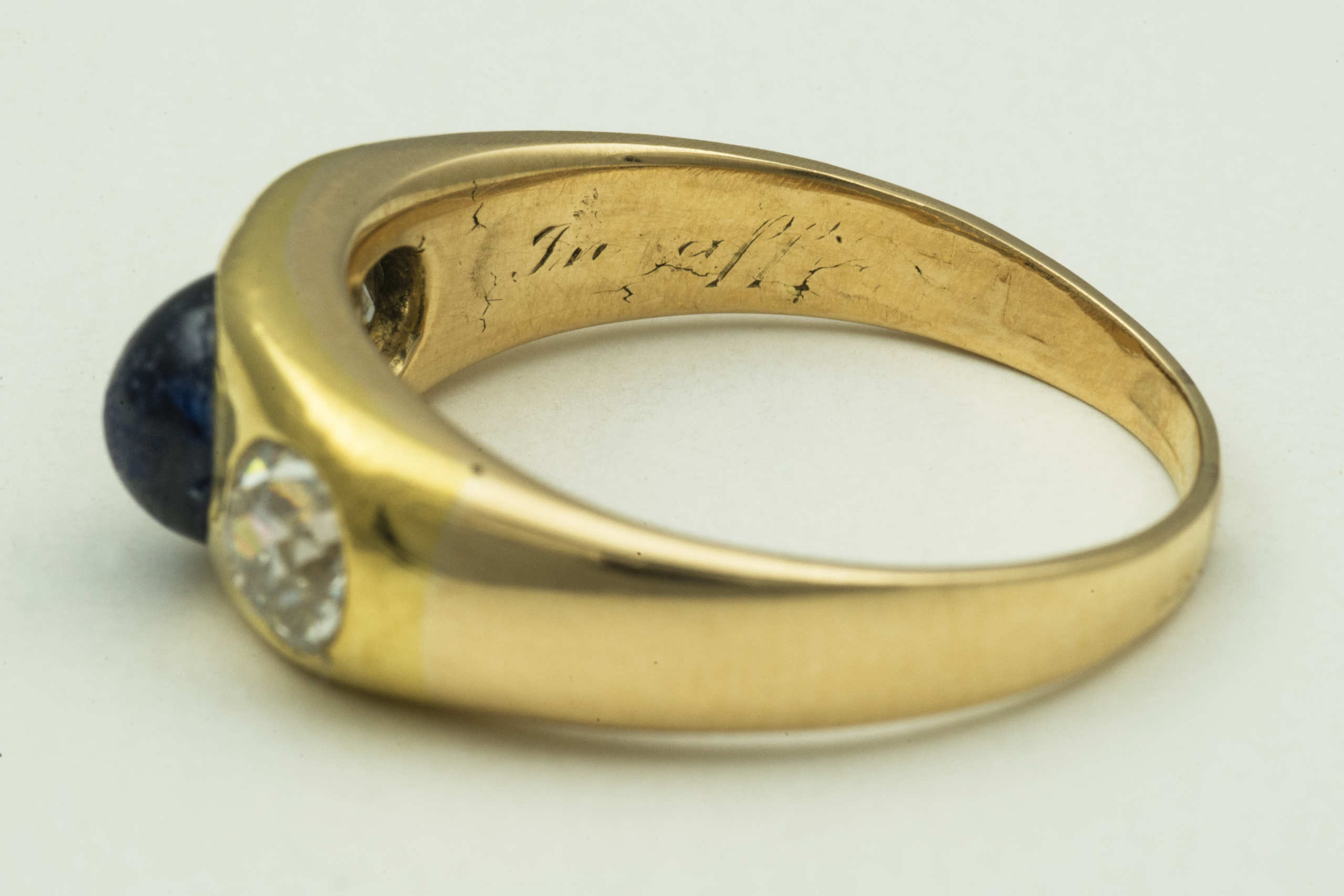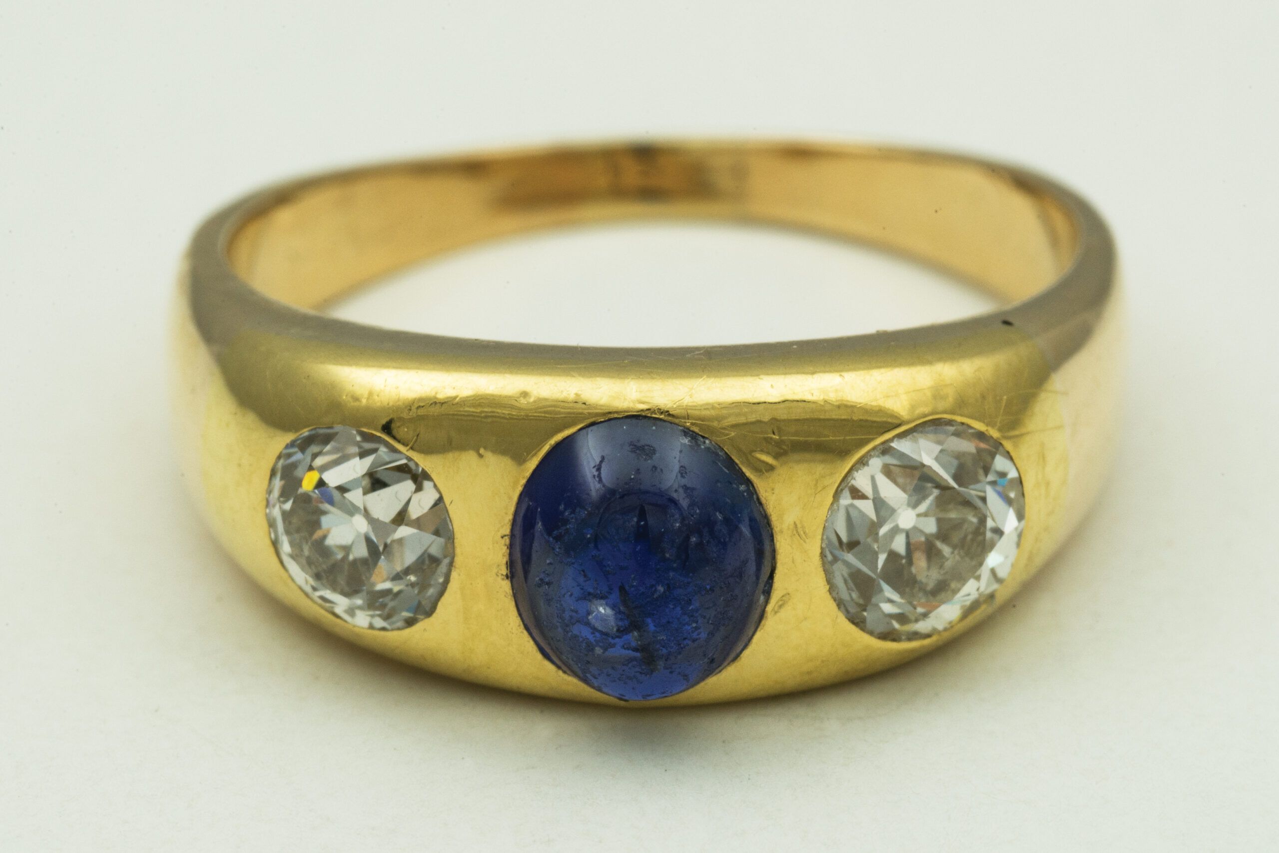 Gold ring with an oval sapphire cabuchon 7 x 5.96 x 3.810, set with two diamonds on either side, 1.34 CTW, 18.94mm ring size.