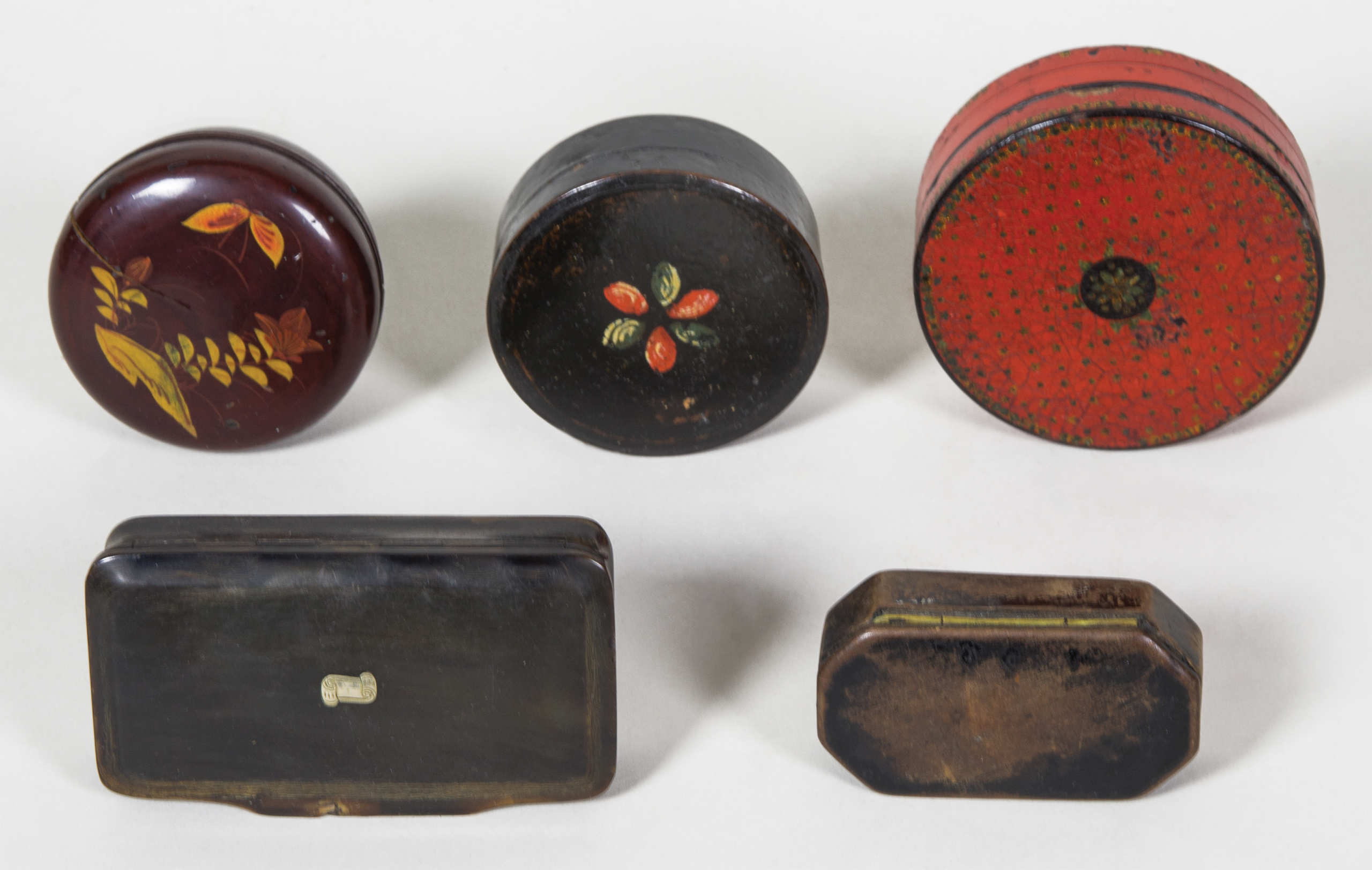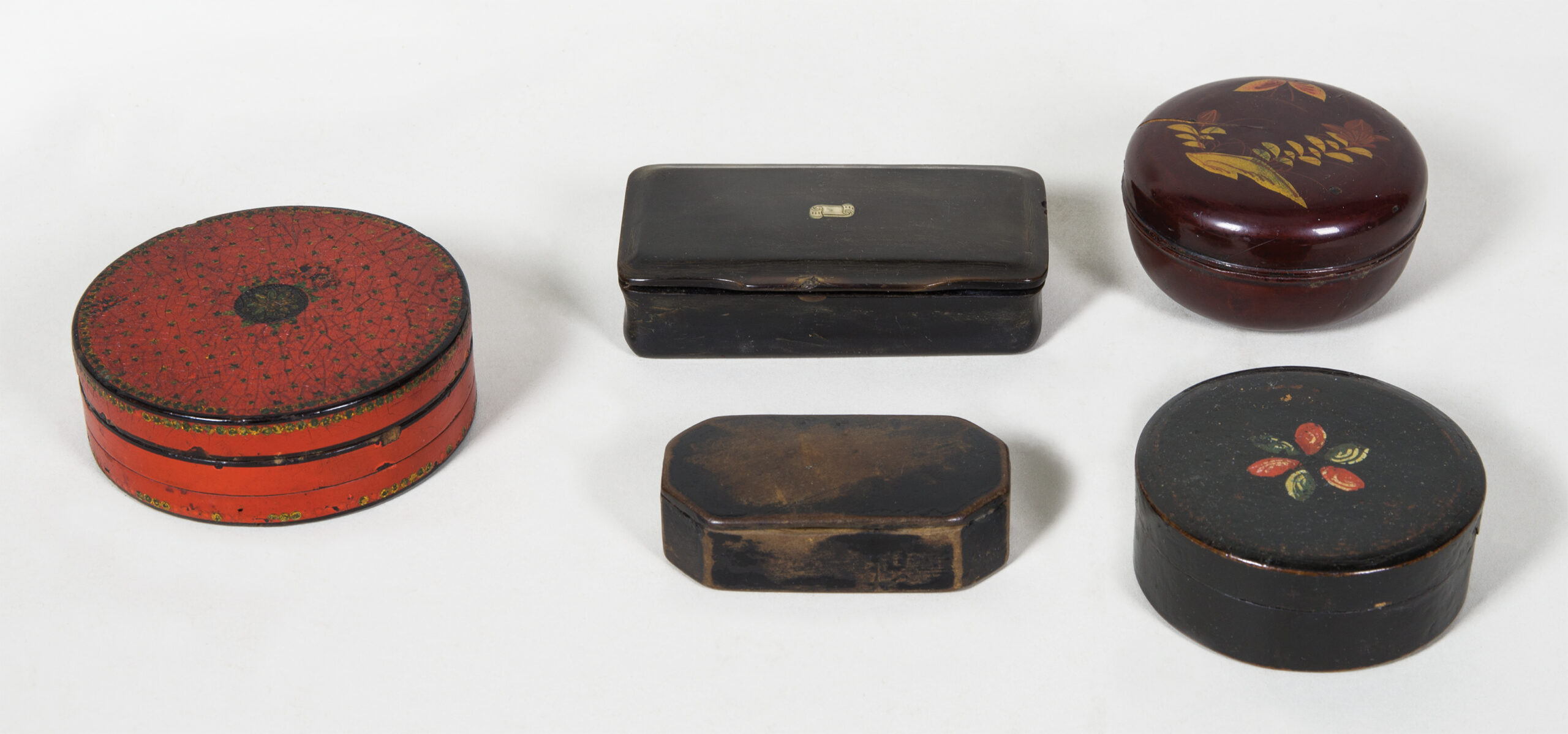 Burl rectangular snuff, 3 3/4″ l; Two small brass decorated pill boxes, birds and flowers; 19th c. silver and tortoise snuff with gilt interior; Ivory and gold compact with interior mirror, 4″ l; Two lacquerware rectangular snuff boxes with hinged lids; Three lacquerware round snuff boxes with fitted lids, one red, Japanese, with butterfly and flowers (shows cracks), 2 3/4″ dia.