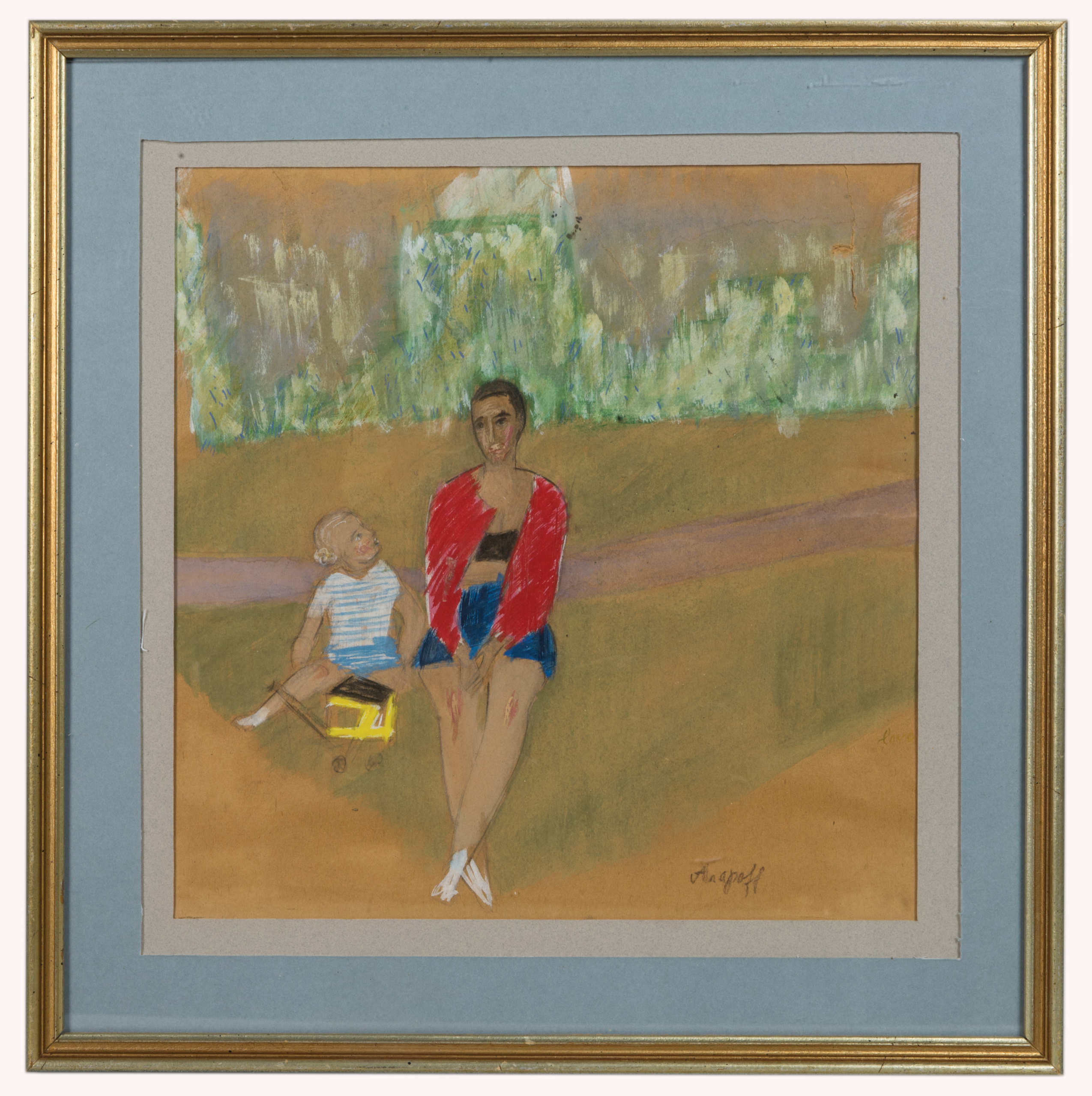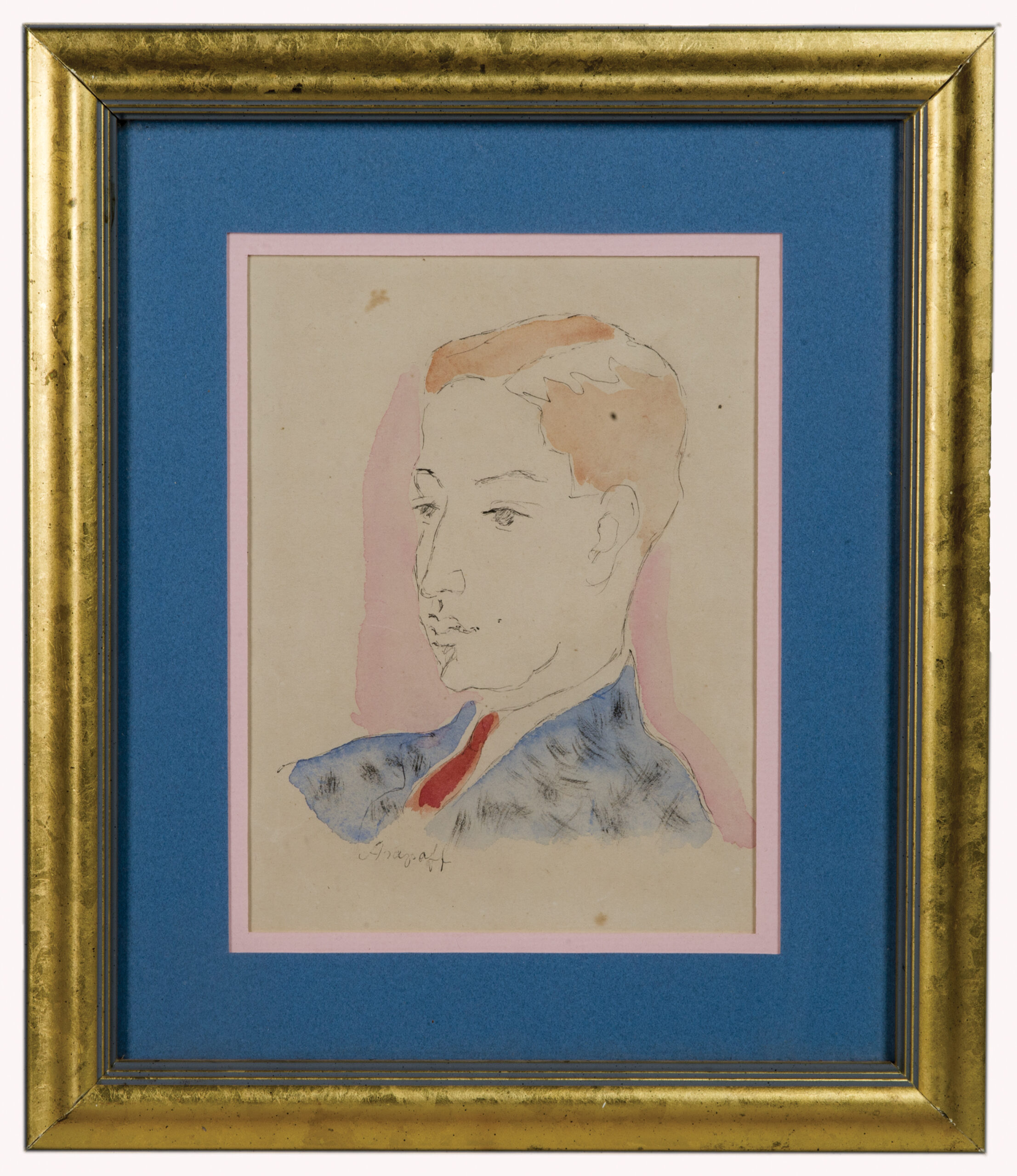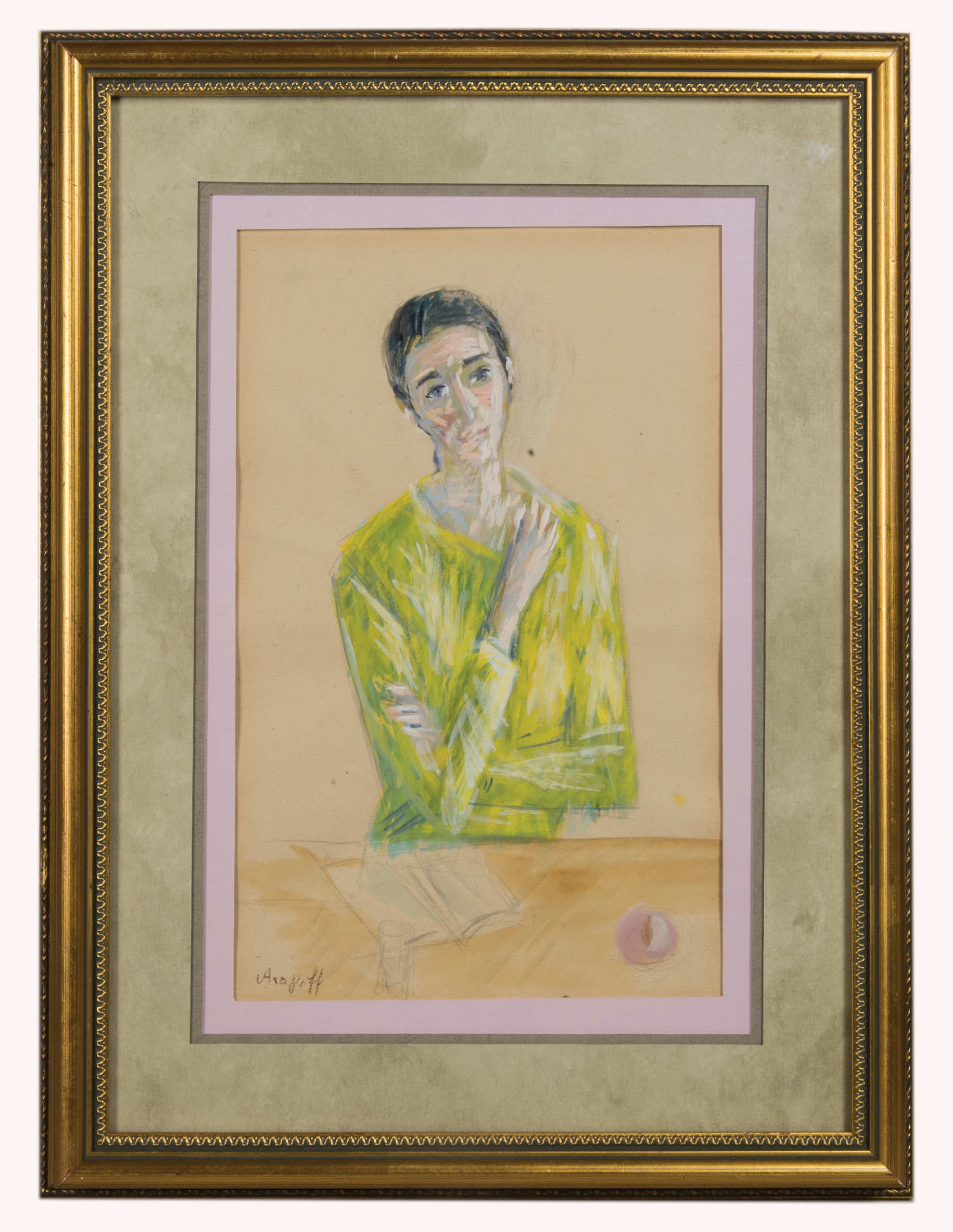 Pen and ink and watercolor of a young gentleman, with blue coat and red tie, signed l.l. “Arapoff” (Alexis Paul Arapoff, 1905-1948), framed and matted, 8″ x 6″ (sight); Pencil and pastel of a young mother and son in Scituate, MA, 1942, “B Day Gift, Paul 1 yr.”, signed l.r. “Arapoff”, framed and matted, 11″ x 11″ (sight); Mixed media portrait of a young lady, in a lime green blouse, signed l.l. “Arapoff”, framed and matted, 12″ x 8″ (sight).