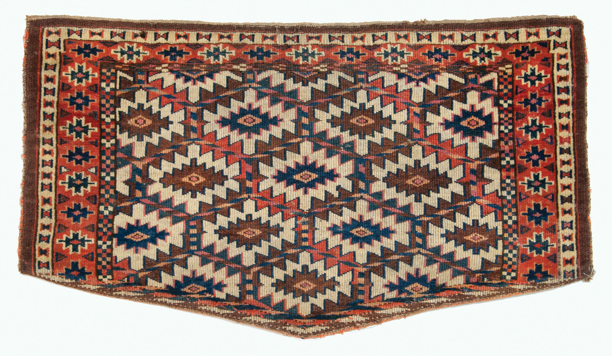 Two Turkoman tent bands or bags: Yomut chuval, 16 guls, red, light blue and cream on a brown field, three borders, good condition, 39″ x 28 1/2″; Tekke Amalyk bag, overall good condition, 32″ x 16″; (ex. William Moore estate, Milton, MA).