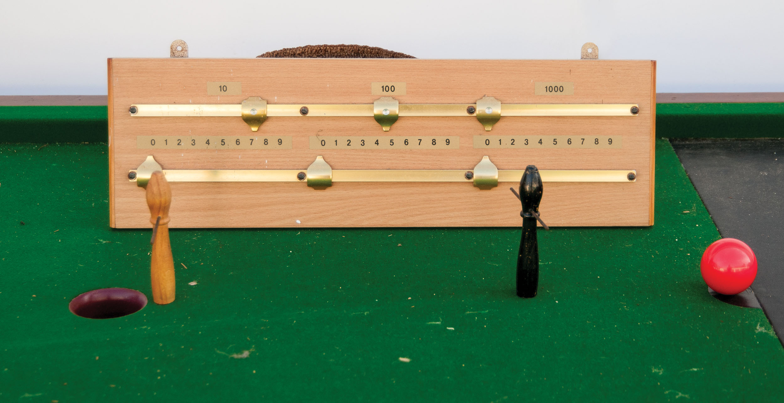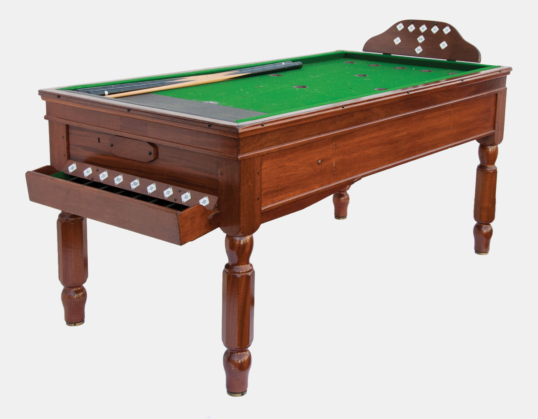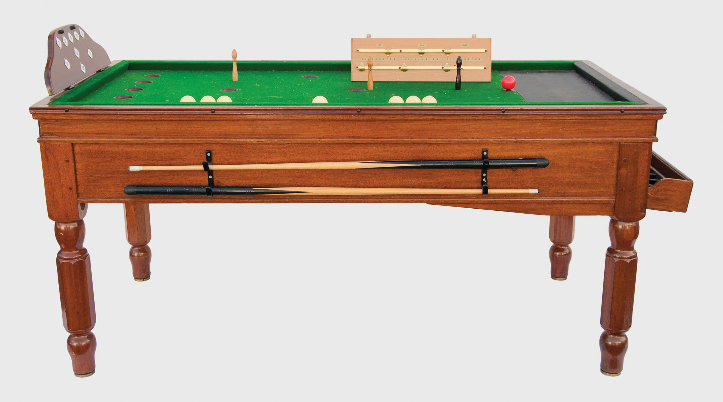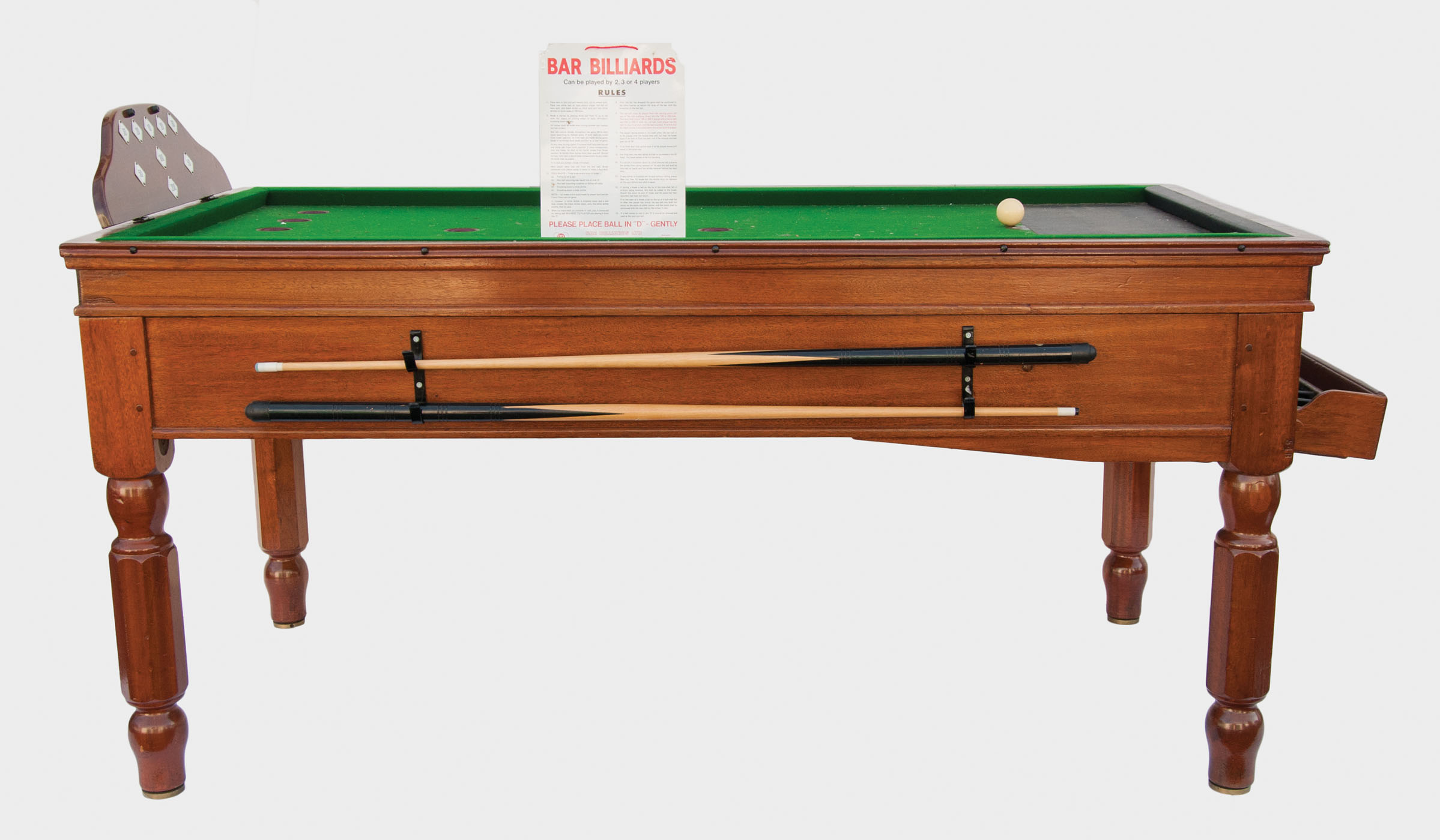 Estimate: $800 – $1,200 Mahogany, lined in green velvet, wood pegged skirt, carved and turned legs, four pool sticks, 34 1/2″ h, 6′ l, 37″ d.