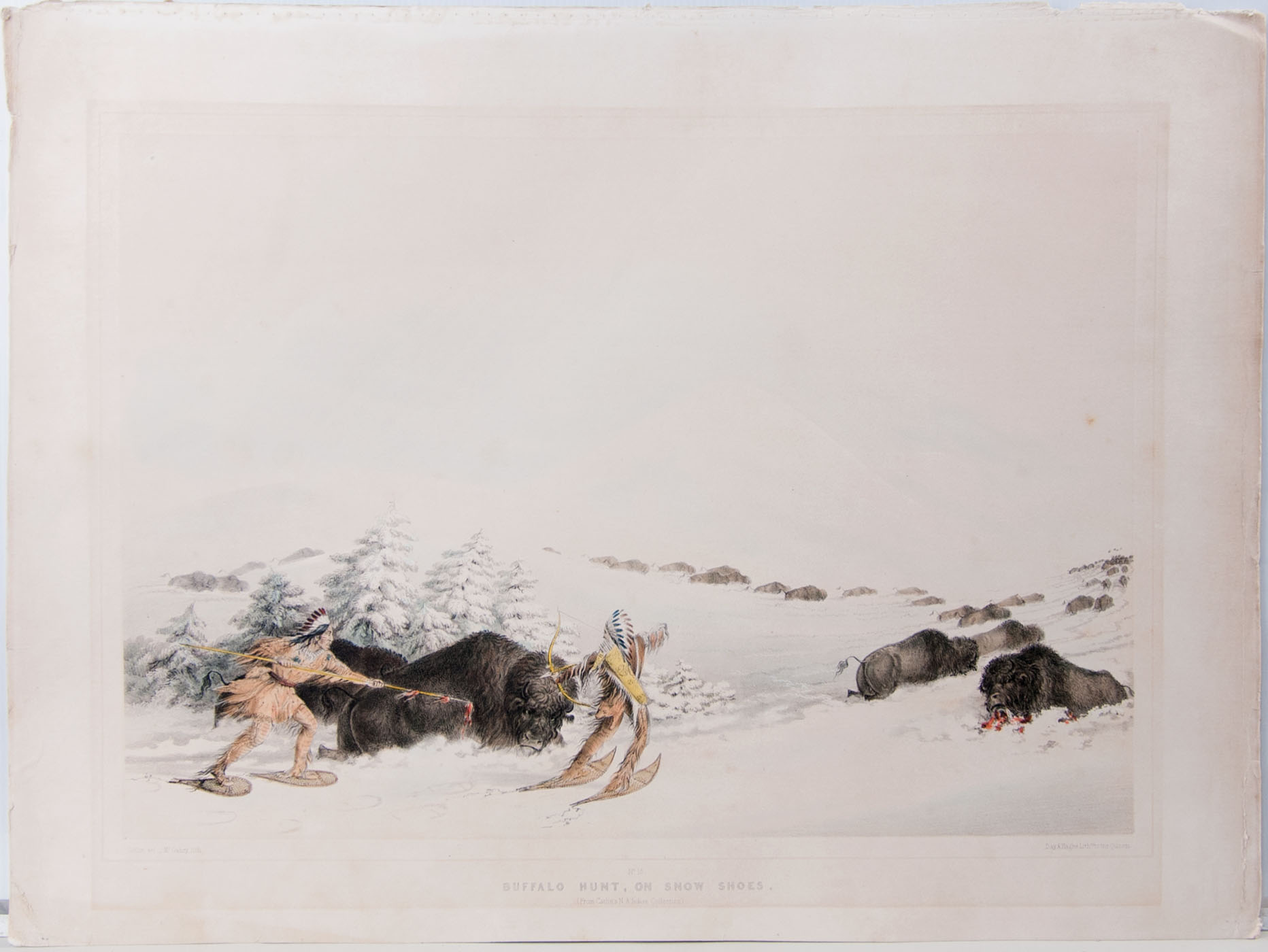 “Buffalo Hunt on Snow Shoes” lithograph, by George Catlin (American, 1796-1872), hand-colored, “No. 15, (From Catlin’s N.A. Indian Collection)”, Day & Haghe, Lith no, To The Queen, Catlin del __ McGahey Lith., lightly toned with minor staining, overall good condition, 16″ x 22″, (ex. Archibald estate, Powder Point, Duxbury, MA).