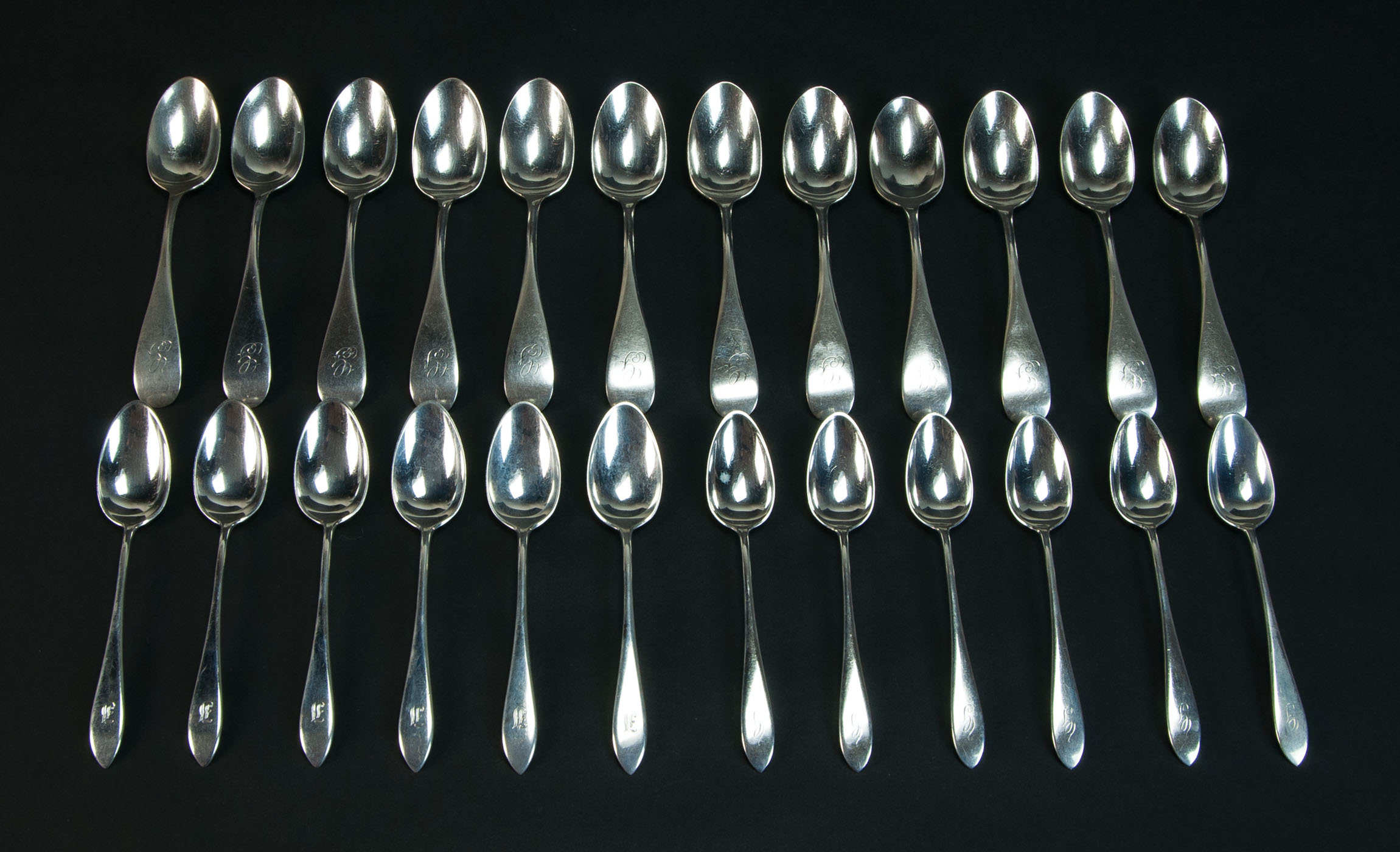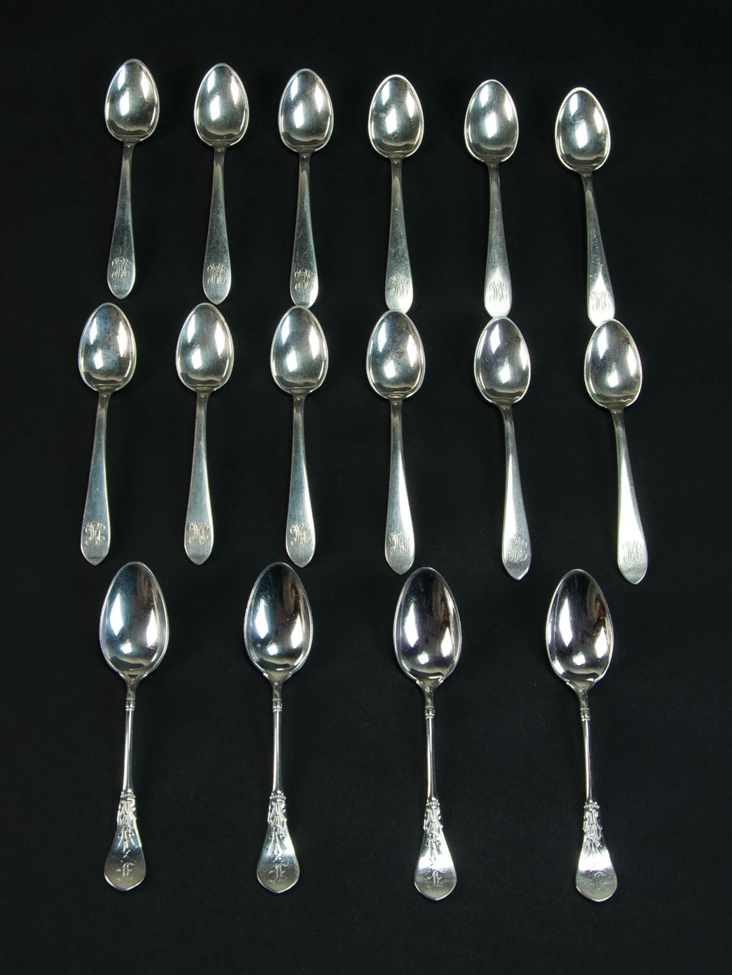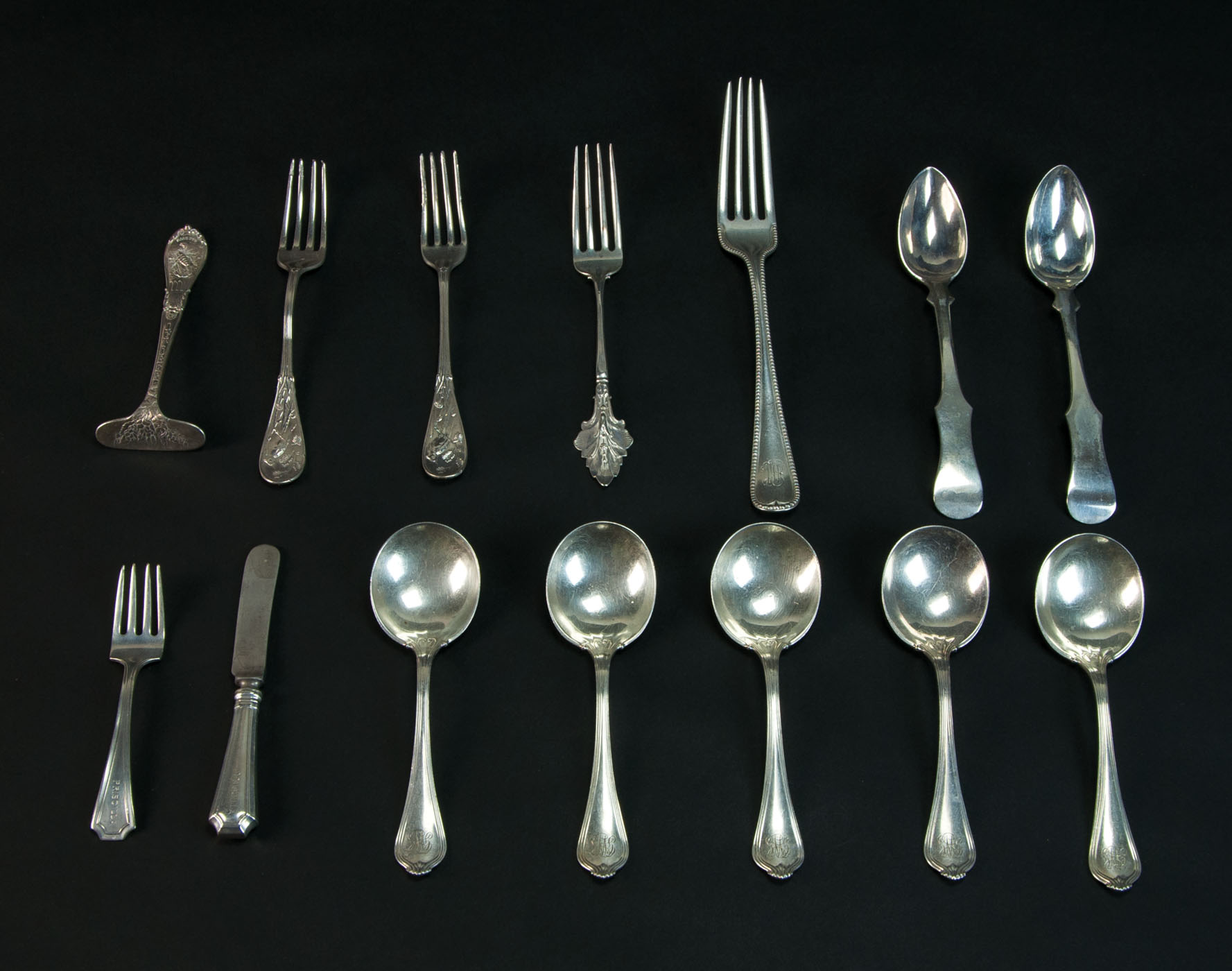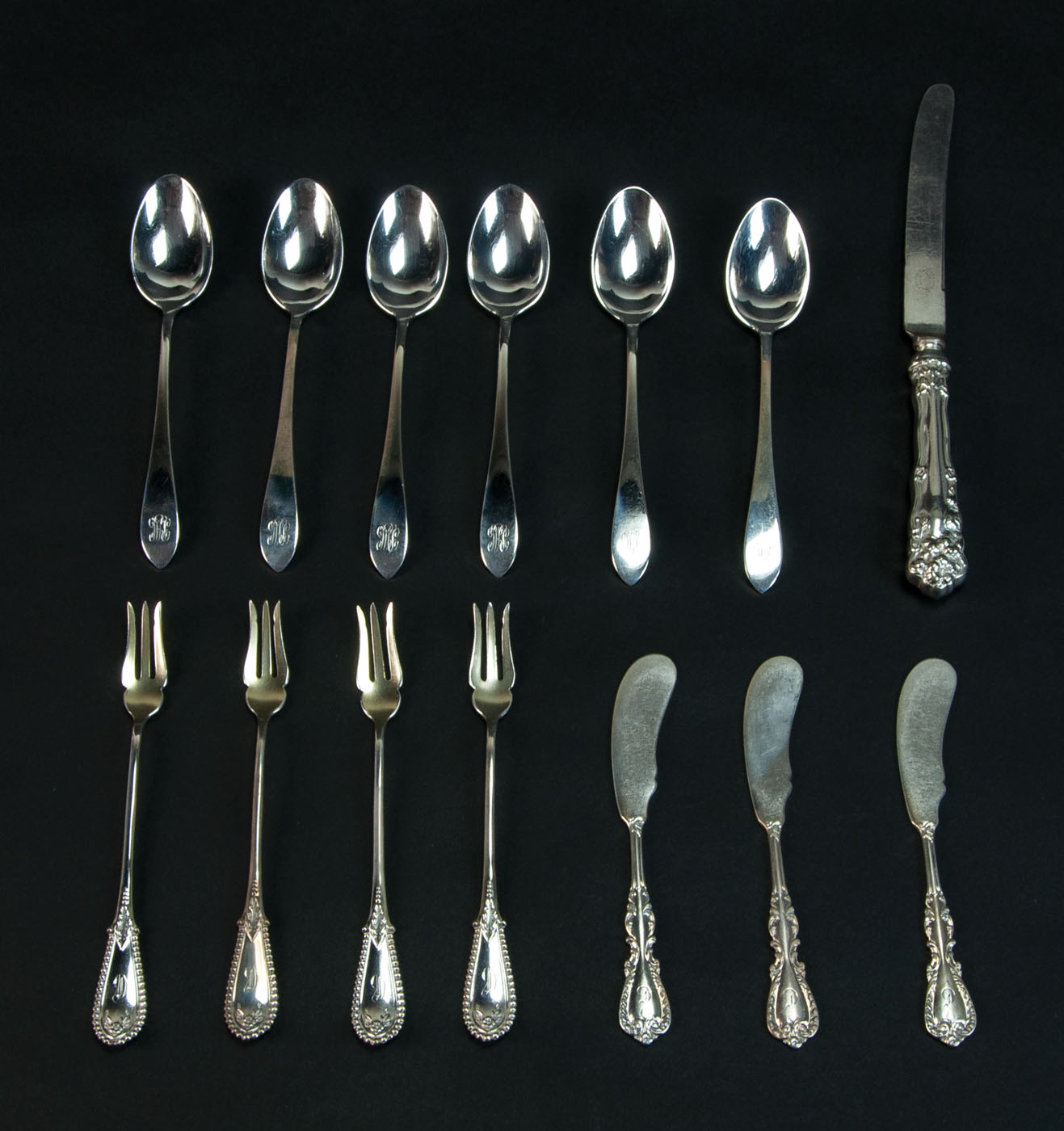 Mixed lot of sterling silver flatware: matched set of 12 dinner forks; set of 12 dinner knives (sterling handles); 12 matching dinner forks; 12 matching salad forks; four sets of 12 four o’clock teaspoons; set of ice cream spoons; and many more sets of spoons; 120 weighable ozt plus knives, (ex. Archibald estate, Powder Point, Duxbury, MA).